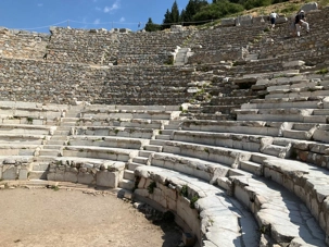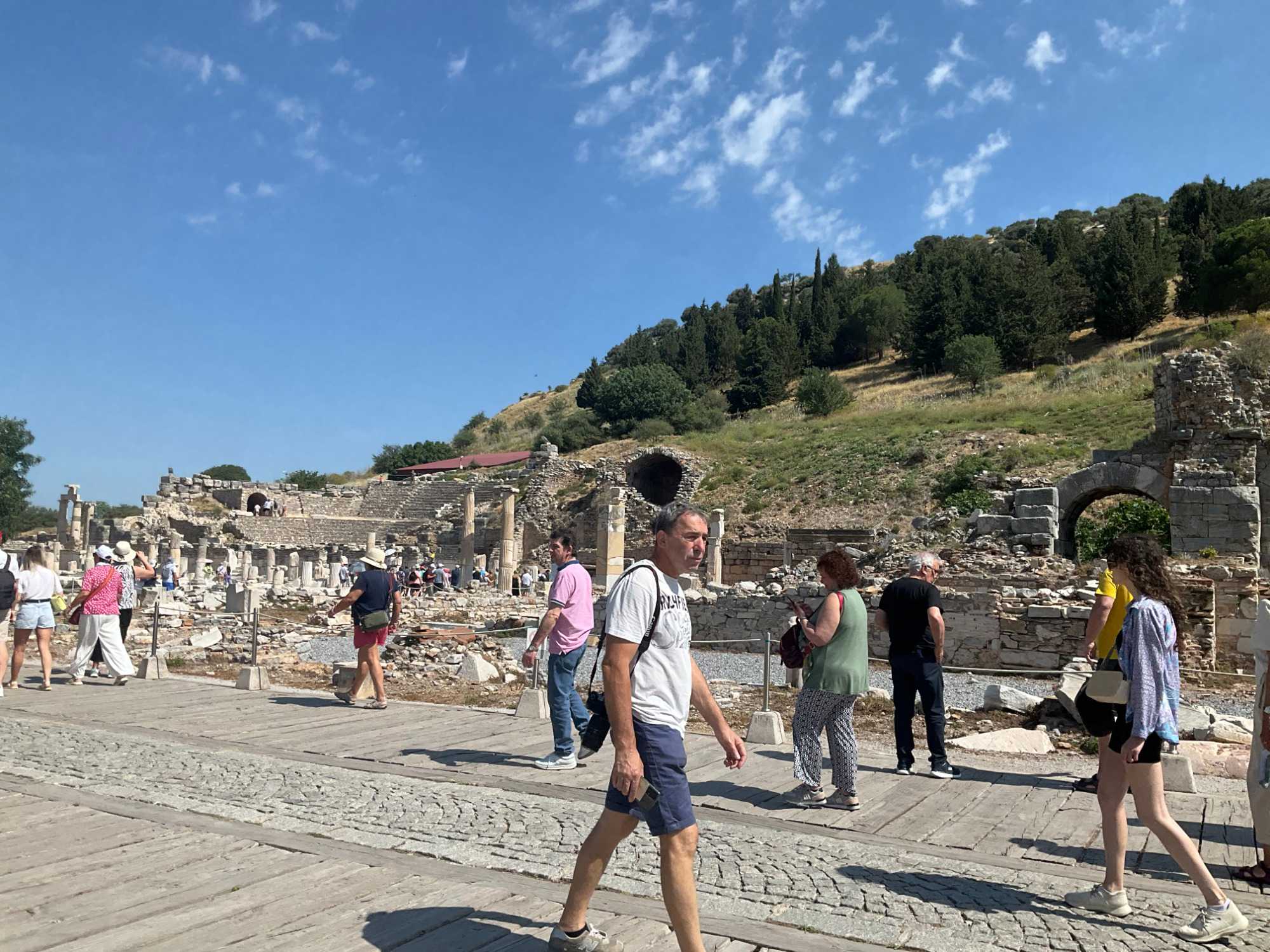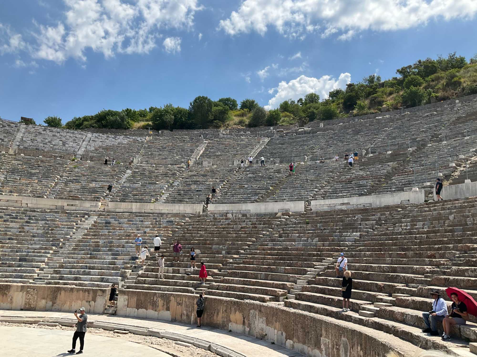 Aujourd’hui, pas besoin d’être fin astronome pour connaître la présence de la Voie Lactée mais à l’époque, religion oblige, le chemin menant du temple vers les autres sites adoptait le nom de ‘’la voie sacrée’’. Tout ici appartient au merveilleux monde de l’archéologie et de l’architecture d’un autre millénaire : sous nos pieds, vers le port antique le long de la route, le marbre usé et ce depuis le cinquième siècle, par les innombrables roues des chariots, nous le remémore, tout comme la porte de Magnésie. Pour certains de nos voyageurs, les colonnes rappellent l’Acropole (Athènes) que nous avons explorée la veille. En poursuivant notre excursion, on atteint le Grand amphithéâtre appelé jadis l’odéon ( hey oui, du même nom qu’une chaîne de nos cinémas) où Saint-Paul fût arrêté avant d’être expulsé de la Cité (pas chanceux notre Saint-Paul; vous vous souvenez à Malte, le festival du Nauvrage de St-Paul?). Nous aurions pu y asseoir 24,000 personnes, tous sur des bancs…de marbre, l’équivalent du centre Bell à Montréal. Vous imaginez une scène de 25 mètres par 40 mètres? Tous nos groupes préférés, les Beatles, les Rolling Stones, Madonna et la petite dernière, Taylor Swift auraient pu s’y produire s’ils avaient vécu plusieurs dizaines de siècles plus tôt!
