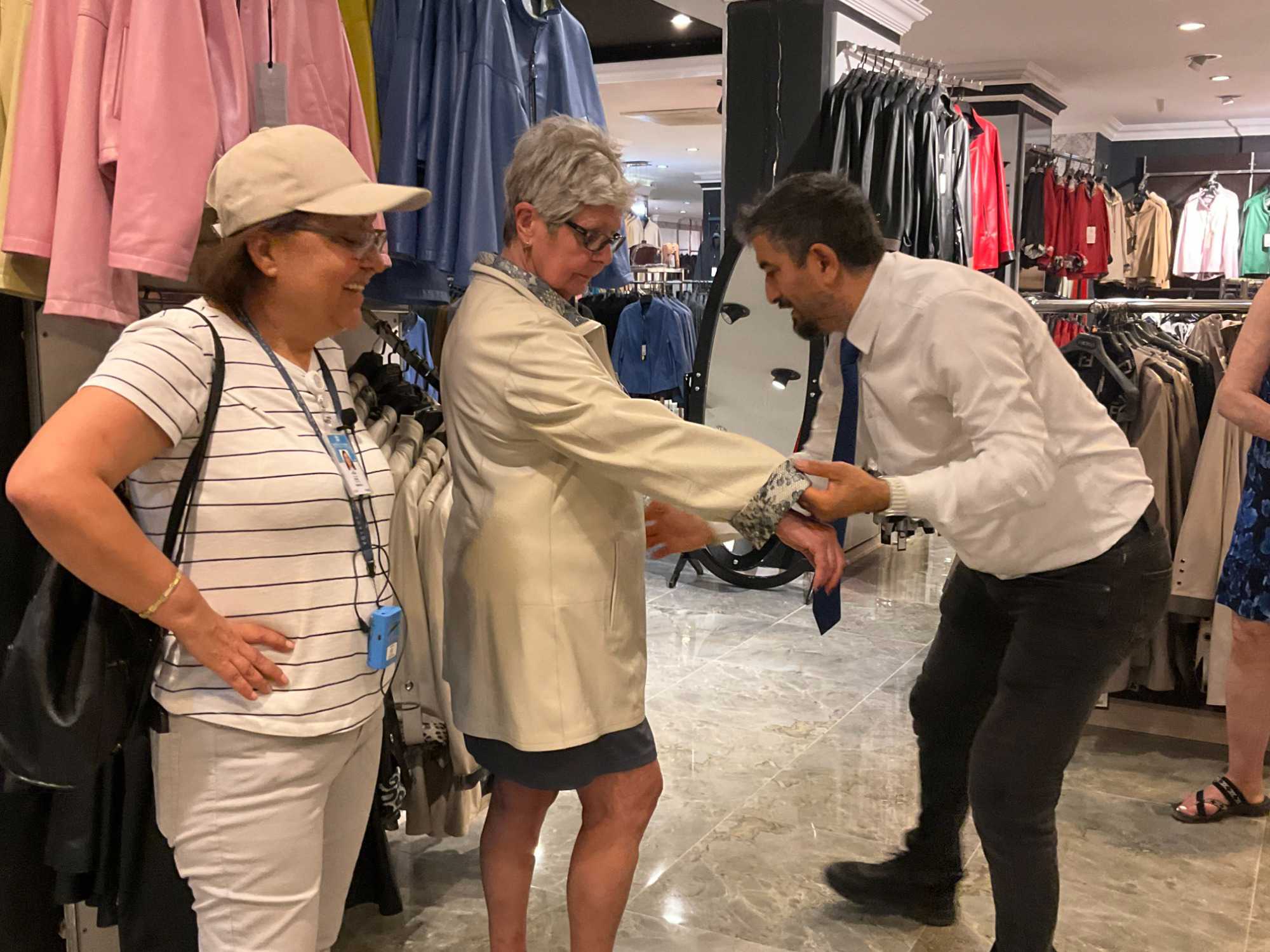 Dernière activité, la visite d’un centre de produits de cuir, d’agneau particulièrement. Cette immense boutique nous a offert une parade de mode de leur fabrication. Des mannequins ont défilé devant nous avec leurs plus beaux manteaux de cuir tous réversibles. Mais nous n’avons pas manqué d’applaudir nos mannequins préférés, trois voyageurs de notre groupe qui ont défilé avec l’aisance du métier. Peut-être les reconnaîtrez-vous sur les photos? Ils nous ont fait bien rigoler. Je dois vous avouer qu’au moins sept personnes sont sortis de la boutique avec leur portefeuille soulagé de « quelques » euros, mais gagnants de manteaux de grande qualité.