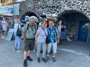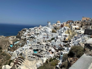Cette localité de Santorin, petit archipel grec relevant des Cyclades, est située à 11 km au nord-ouest de Fira, sur la côte constituant la pointe nord-ouest de l'île. La ville descend en cascade sur une colline, avec des maisons blanchies à la chaux et des églises aux dômes bleus empilées en rangées surplombant la célèbre caldeira de Santorin dans la mer Égée. Outre les églises, les maisons des pêcheurs avaient également du bleu alors que celles des riches propriétaires et des capitaines étaient reconnaissables elles à leur bande rouge. La loi oblige encore à ce que les maisons soient blanche et bleu mais il semble que certains soient délinquants à ce règlement. On dit que les pêcheurs choisissaient le bleu également pour leur bateau pour être en harmonie avec la mer et…pour ne pas faire peur aux poissons! Les couleurs des maisons prennent aussi leur importance lorsque les enfants sont prêts à se marier. Le père de Betty notre guide, a peint une ligne bleue lorsque que cette dernière a été en âge de se marier et a ajouté une ligne rouge lorsqu’à son tour, son frère a atteint cet âge “crucial”. Ouf, par chance qu’ils n’ont pas eu une dizaine d’enfants!