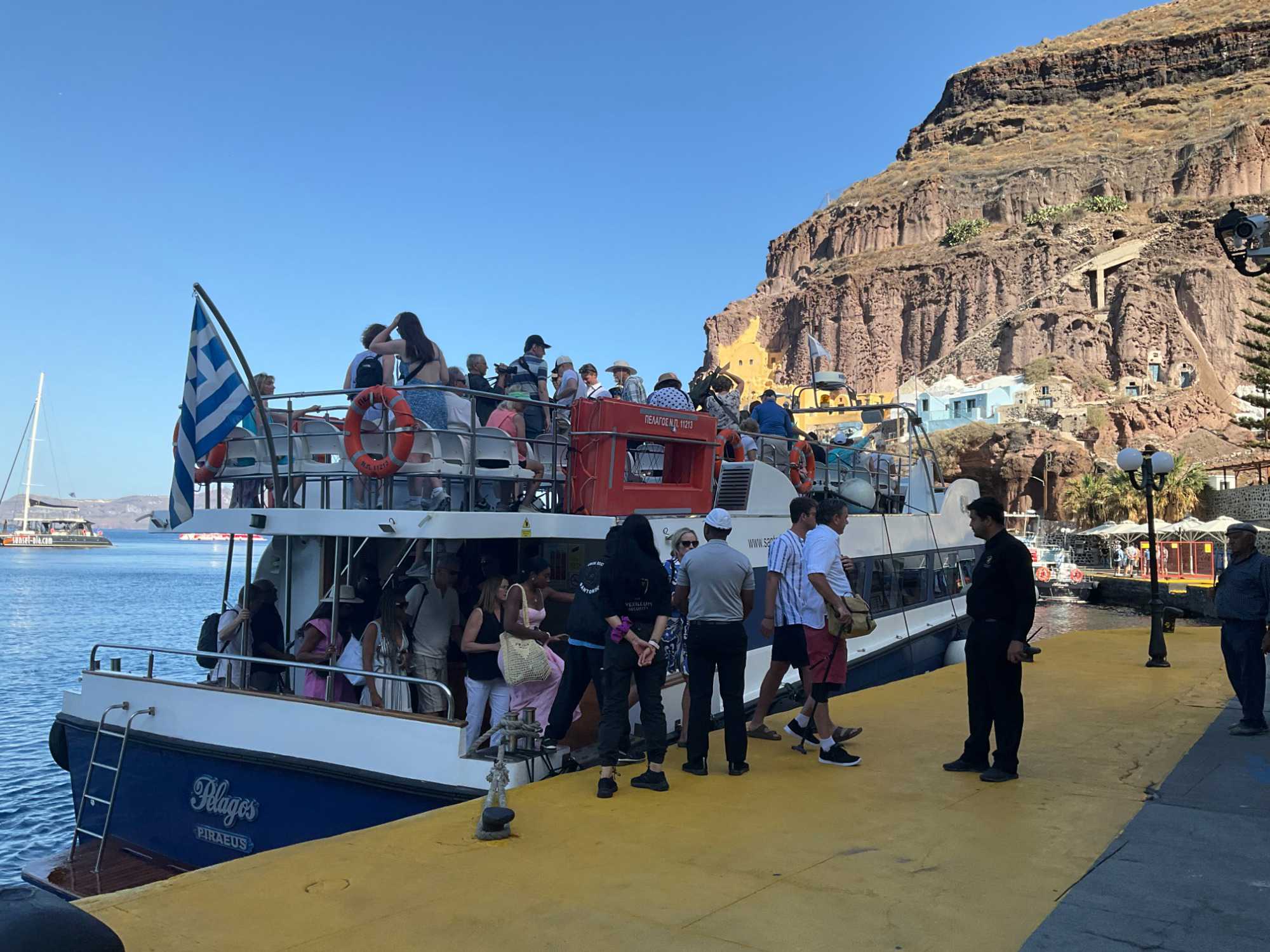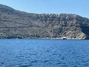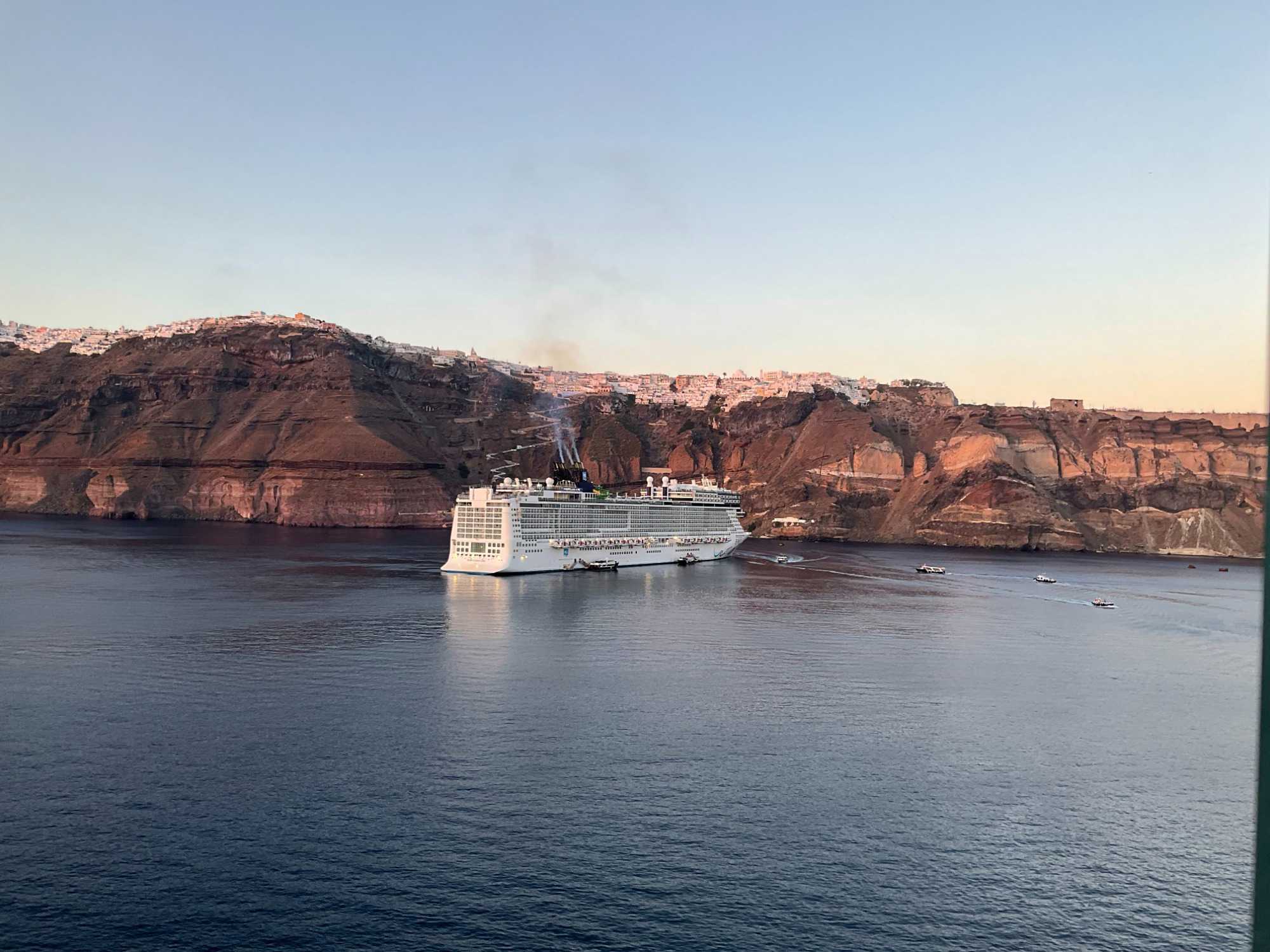 Ce matin, les lève-tôt ont pu apercevoir du pont, un chapelet de petites maisons accrochées sur les hautes falaises volcaniques de l’ïle de Santorini. En forme de croissant de lune, conséquence d’une éruption qui a détruit une grande partie de l’île vers 1600 av. J.-C, (et dont la plus récente a eu lieu en 1950), l'île est la plus grande et la plus peuplée d'un petit archipel volcanique comprenant quatre autres îles. Même à première vue, l’île a le charme de sa réputation : l’ensorcelante des Cyclades ! Fascinante (comme dirait notre célèbre présentateur de Découverte: Charles Tisseyre) et j’ajouterais : enchanteresse. On la dit formée de rochers vertigineux sur son littoral occidental et, de plus de douceur sur sa côte orientale.