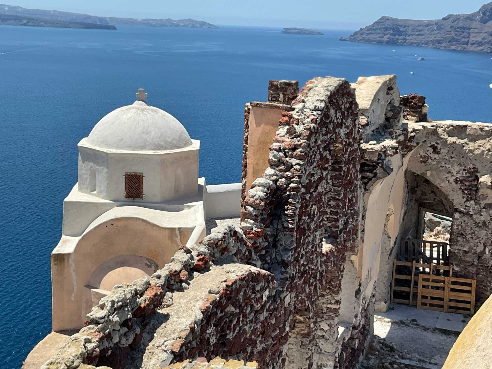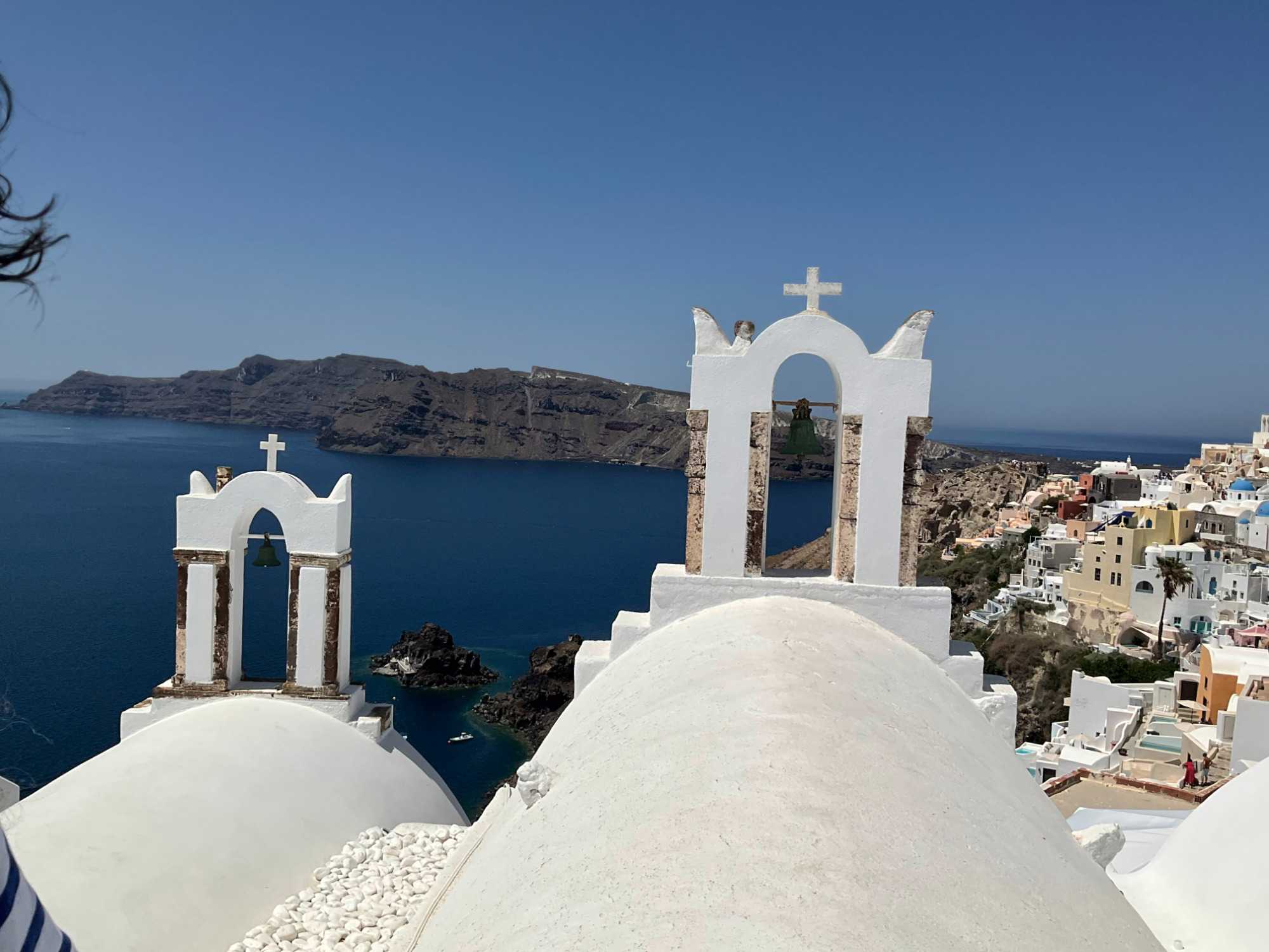 Oia compte environ 960 habitants et en été …des milliers de touristes supplémentaires. L’histoire d’Oia est liée à l’eau, cette ville portuaire à l’histoire navale a stimulé le développement qui s’est poursuivi de la fin des années 1700 au milieu des années 1900. À son apogée, 170 des 2 500 voiliers de la flotte grecque étaient hébergés à Santorin. Beaucoup étaient des bricks, des voiliers à deux mâts très appréciés à des fins militaires et commerciales. À l’époque, les pirates faisaient irruption et pour les défier, on construisait d’étroites ruelles et de petits escaliers à hautes marches afin de complexifier les tentatives d’invasion et d’obliger les pirates d’entrer un à la fois seulement. Pas mal comme astuce non? Les entrées voûtées permettaient aux marins de mieux se cacher. Pour avertir les habitants de la venue des intrus, on sonnait alors les nombreuses cloches de chacune des églises.