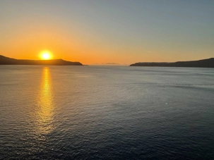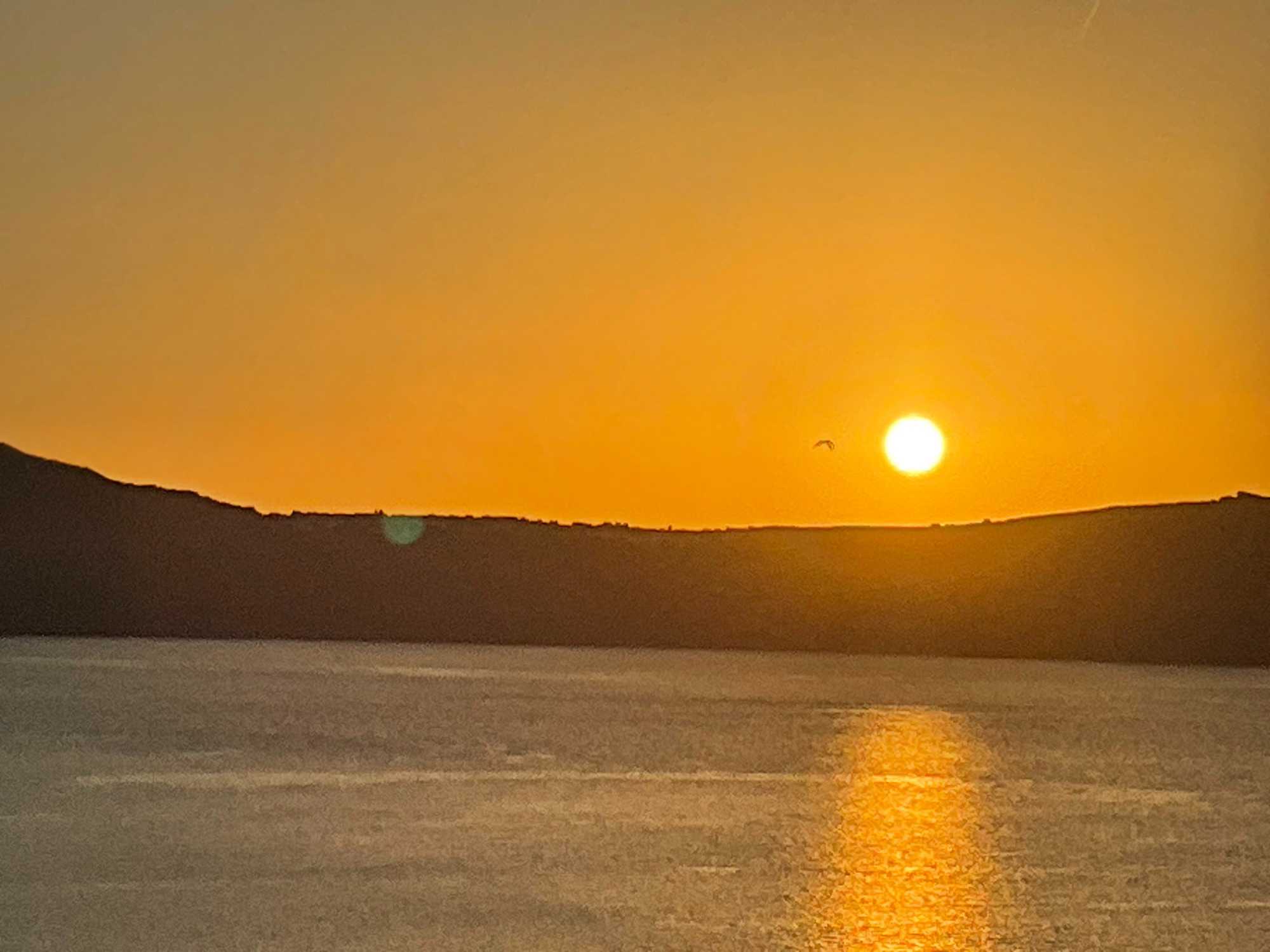 La dernière chose mais non la moindre, les couchers de soleil de Oia. Leur célébrité rassemble des foules chaque soir pour les regarder. Nous c’est directement du 14e pont de notre navire, verre de vin ou autre à la main que la plupart d’entre nous, choisissent d’admirer le spectacle, reconnu parmi les plus beaux couchers de soleil au monde. Comme dans un film, la vie s’arrête. Tout le monde n’a d’intérêt que pour la lente descente de l’astre. La beauté du spectacle est inouïe, captivante voire hypnotisante, c’est ça le St-Graal de la journée, de l’île de Santorini.