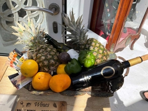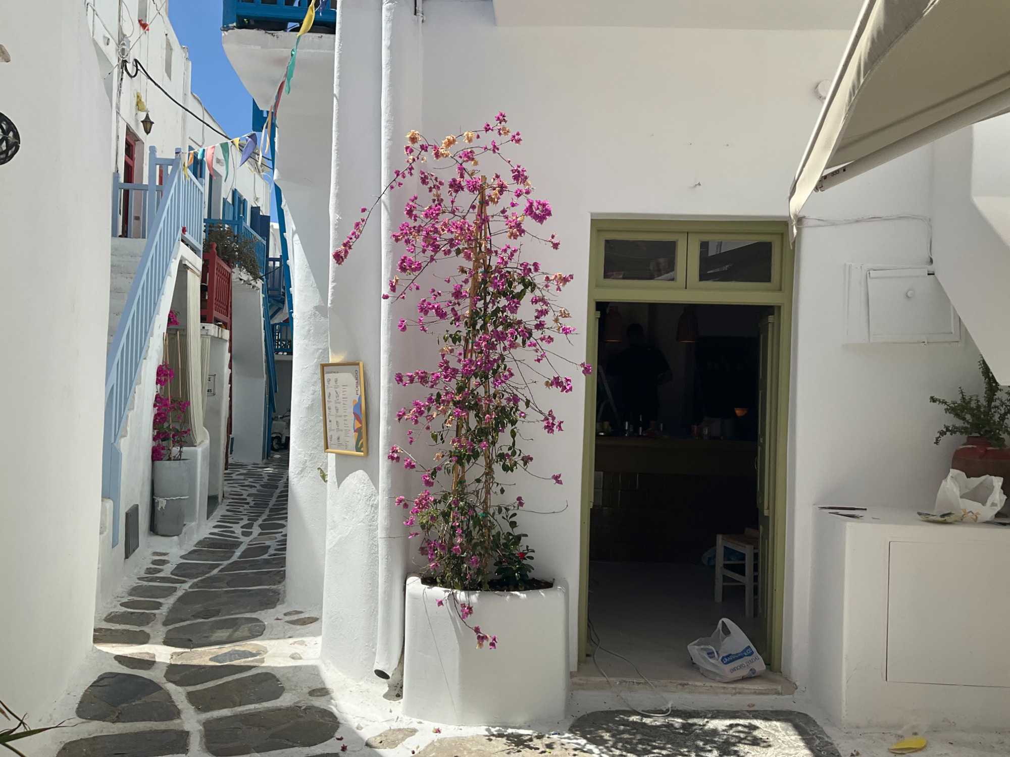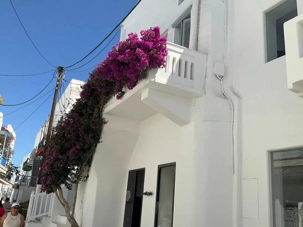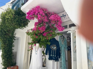 Mais aujourd’hui, pour notre plus grand plaisir, se perdre dans ce labyrinthe est devenu une expérience inoubliable. Ici, on n’a pas croisé de nom de rue, pas de numéro sur les portes. Une astuce pour s’y retrouver? Demander un point de repère : une boutique, une église ... ou demander aux habitants, ce sera souvent plus précis et plus sympathique que sur votre…GPS qui « en prend pour son rhume ici ». La magnificence des fleurs, souvent d’énormes bougainvilliers, se remarque partout où l’on jette notre regard dans chacune des mini ruelles. En fouillant bien au fond de ses dernières, on a aperçu de vieilles dames balayant et nettoyant leur rue tapissée de pierres noires dont les joints sont peints en blanc …couleur emblématique de leurs maisons blanchies à la chaux, agencées de portes et volets bleu ciel. Paysage mirobolant qui se fond dans la mer. Lors de notre visite, ici et là, on a déniché de minuscules boutiques remplies de trésors comme de magnifiques chandails de coton faits ici même en Grèce. Et toutes les dames du groupe se rangent derrière moi pour vous dire que les vêtements regorgent de couleurs foisonnantes, de tissus naturels; essentiellement du lin, de quoi garder l’esprit estival tout au long de l’année, on en veut une garde-robe complète!