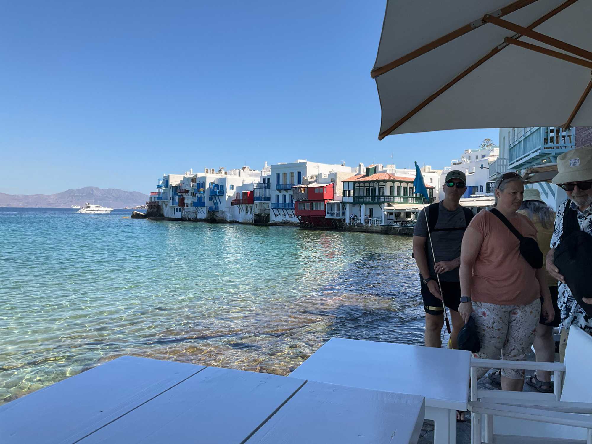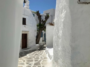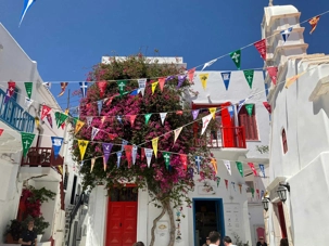 Renommée pour son environnement cosmopolite, ses magnifiques plages ( je n’ai pas vu aucun brave de notre groupe faire trempette) et sa constante vie nocturne, le centre de Mykonos, appelé Chora, se compose de nombreuses petites ruelles étroites en bord de mer, un vrai labyrinthe, stratagème d’une grande efficacité pour que jadis, les habitants puissent se protéger du vent et surtout… des pirates.