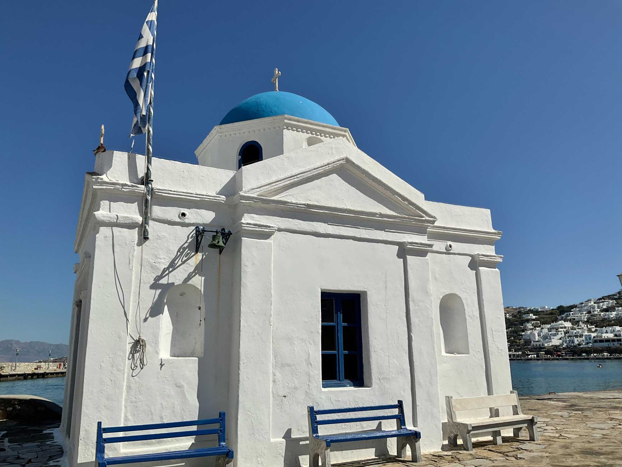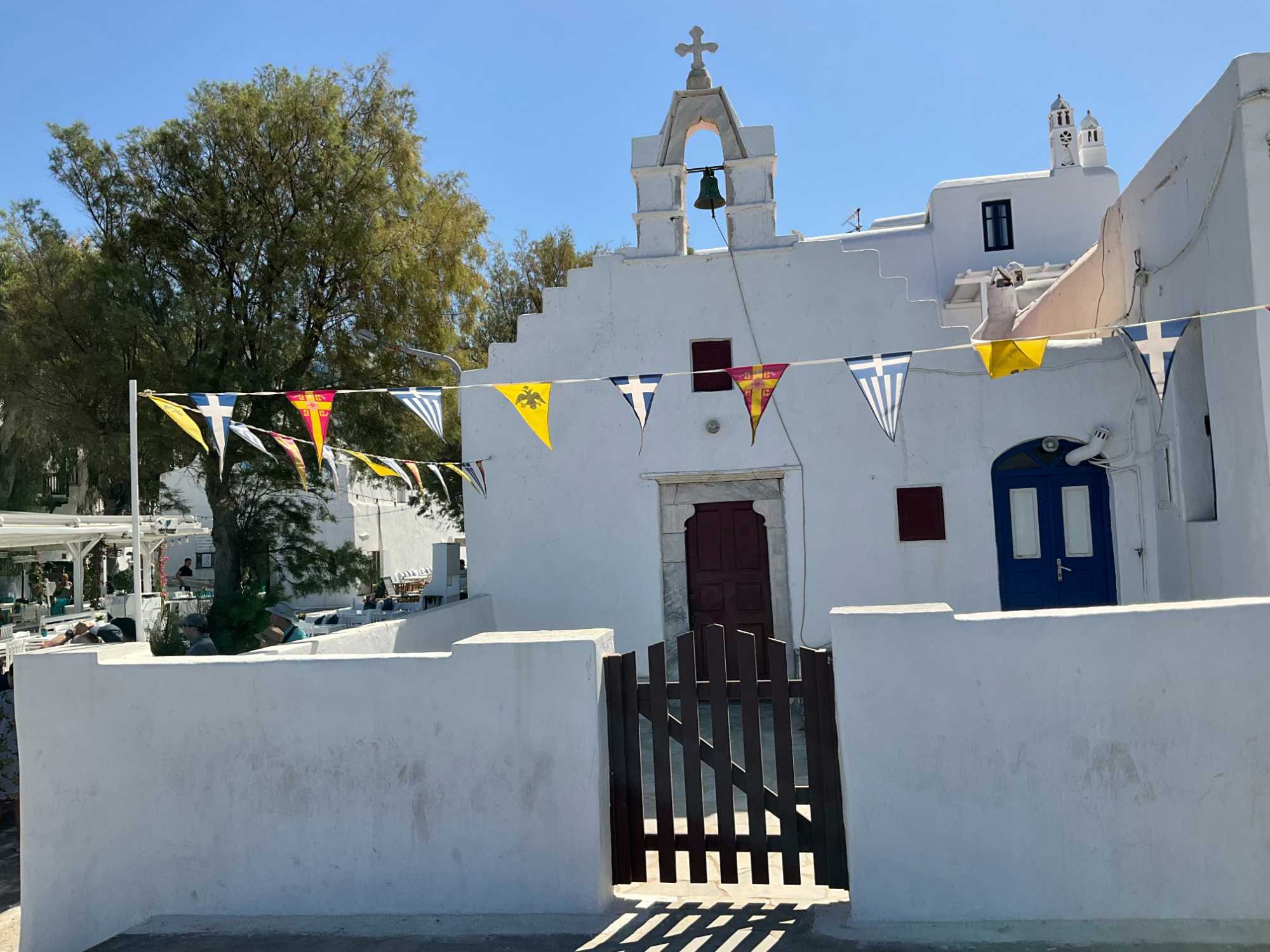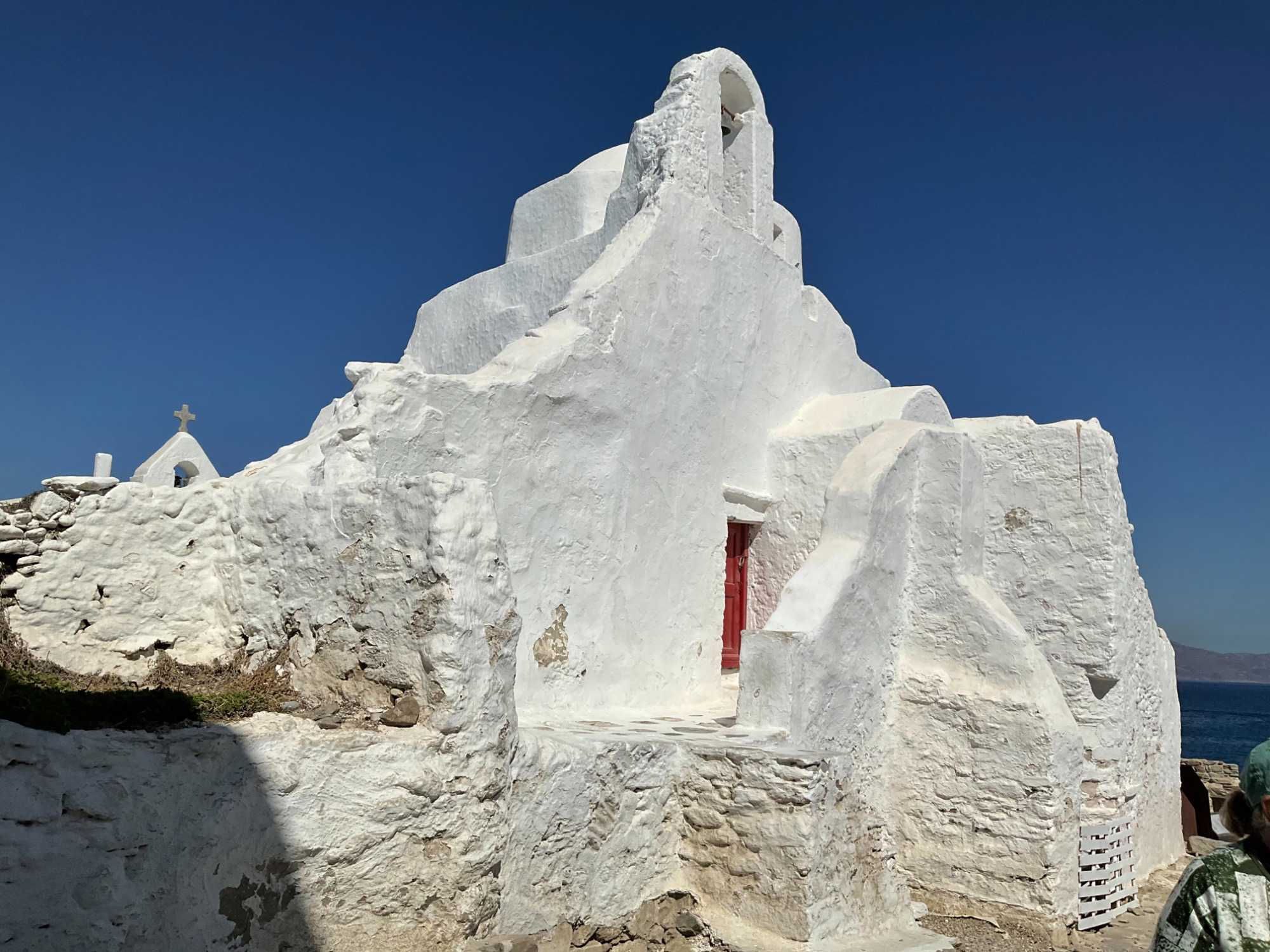 Il y a des églises un peu partout lorsque l’on se balade à Mykonos (signifiant lieu rocheux), mais une demeure sans doute la plus impressionnante, la plus mignonne : Panagia Paraportiani. Construite entre les XVe et XVIIe siècles, cette célèbre église de Mykonos se compose de quatre petites chapelles, auxquelles s'ajoute une cinquième en hauteur accessible par un escalier extérieur. Elle nous servira de photos …religieuses du voyage! Repérez-la dans nos photos.