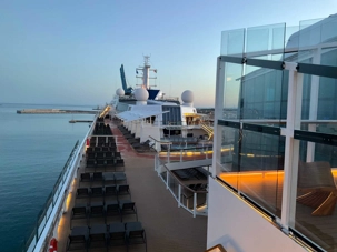 Il fait encore nuit quand nous accostons au port de Civitavecchia et voyez notre tondeur de gazon, (photo), travailleur de nuit, il a eu droit à une promotion; une tondeuse format « standard ».