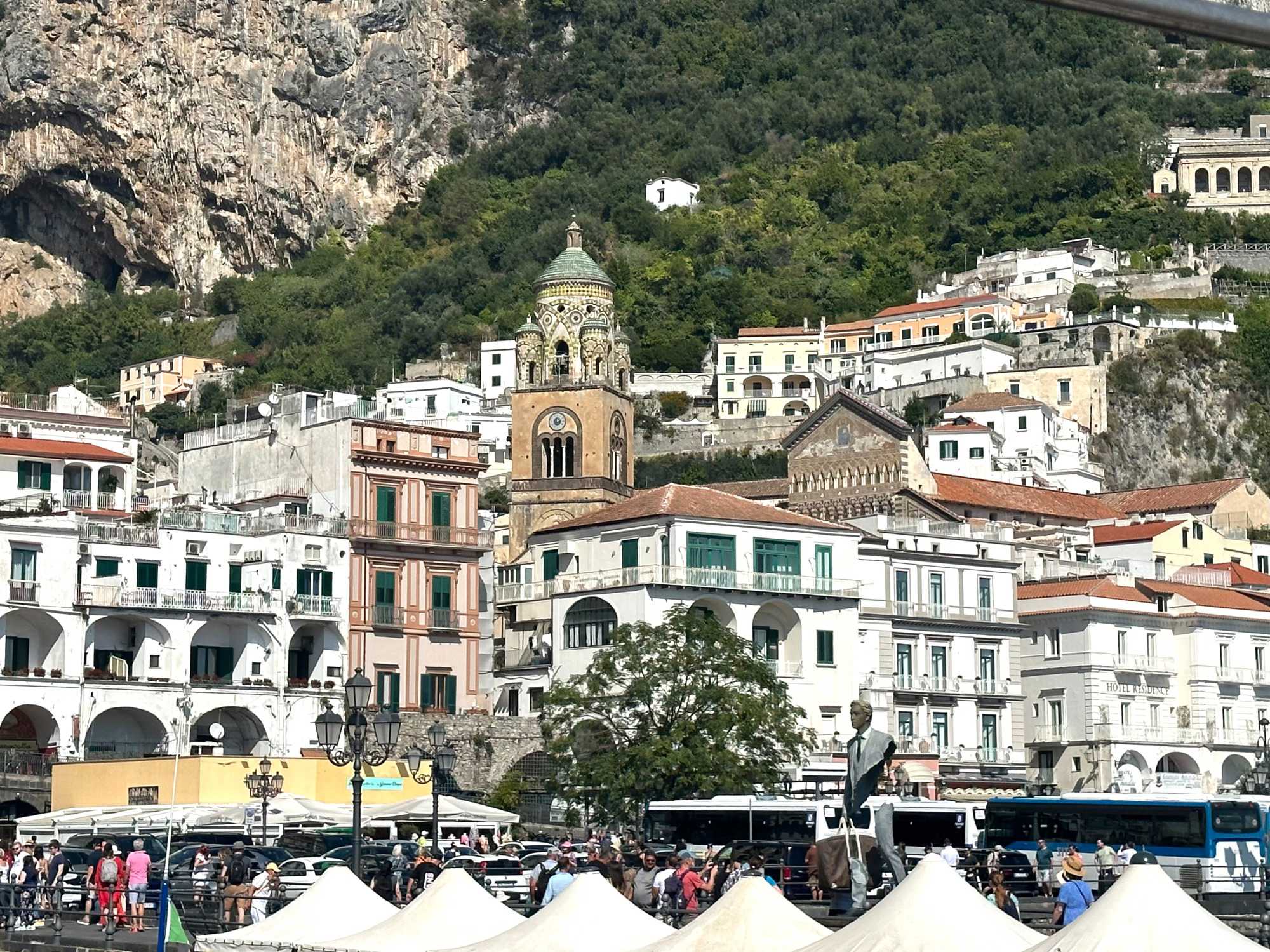 L’ensemble dévoile de surprenants paysages dignes du cinéma. Amalfi c’est, dit-on : ‘’le repos des poètes, des artistes romantiques, des célébrités d’Hollywood’’, en ce grand jour… Ce sont des ‘’Celebrity’s’’ du ‘’Reflection’’ ! Le chauffeur et notre guide en font partie aussi, ils font une solide équipe. Il faut être assez talentueux pour rouler sur cette route étroite, sinueuse et achalandée.