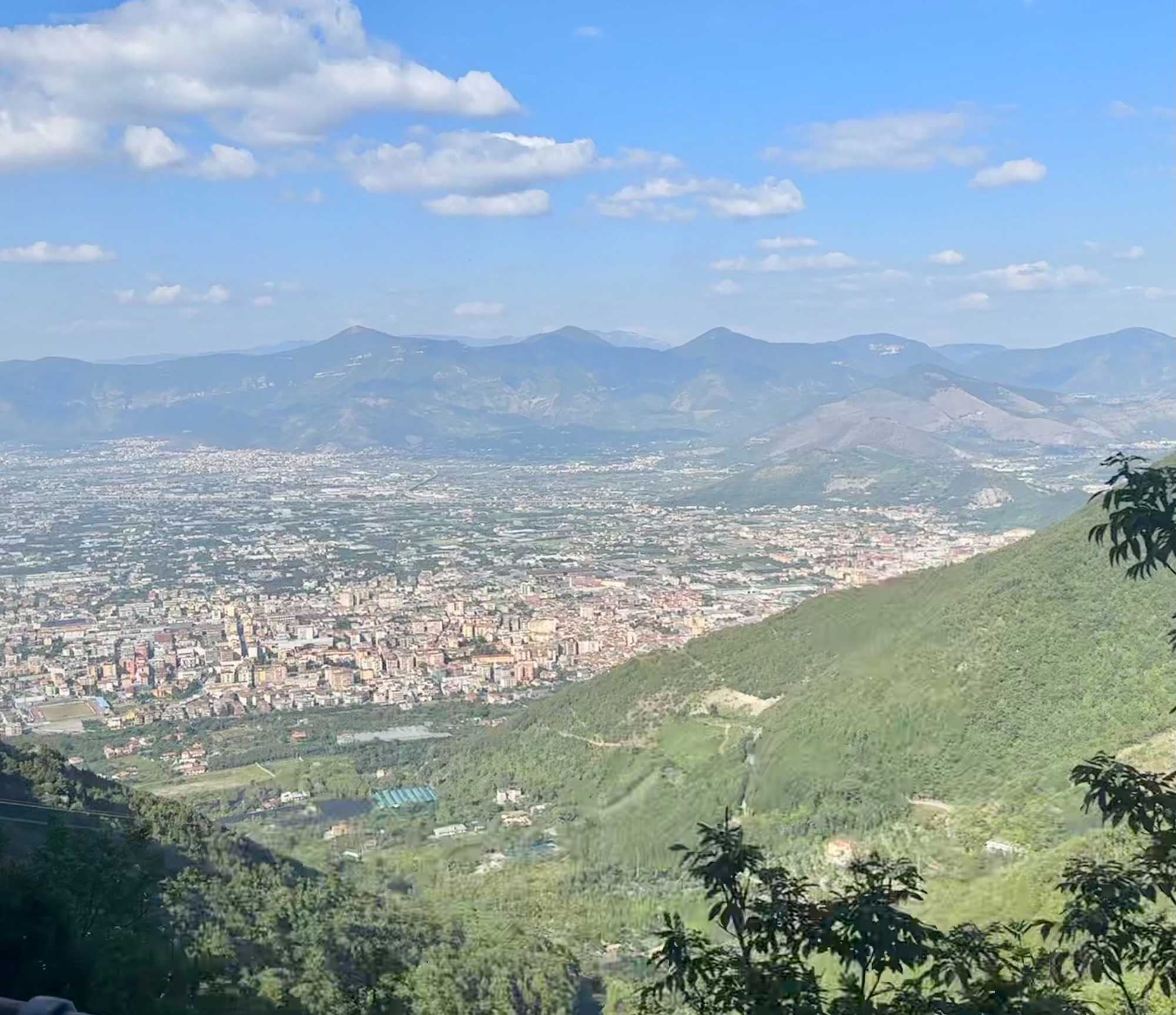 Chemin faisant, petit lopin de terres agricoles se succèdent, nous y voyons : oliviers, citronniers, pins maritimes, serres, jardins, petits animaux de ferme. Sur la gauche, le Vésuve.