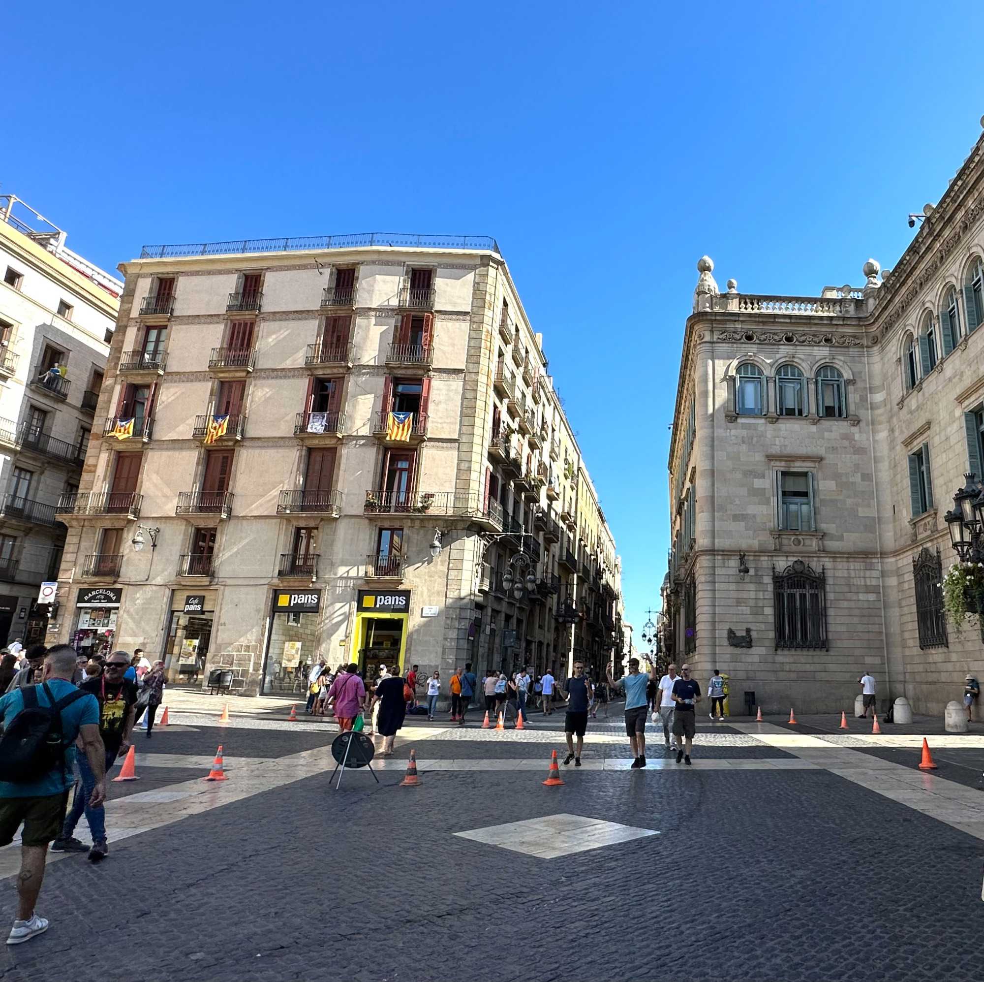 ‘’Centre historique et administratif de la ville depuis l’Antiquité, la Place Saint-Jacques (Plaça de Sant Jaume) abrite les deux édifices les plus importants de l’administration catalane : la Mairie de Barcelone et la Généralité de Catalogne.