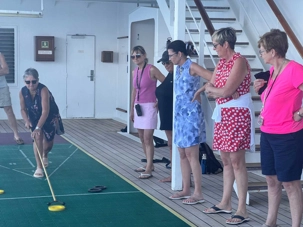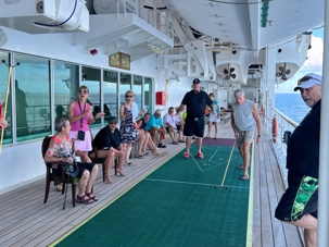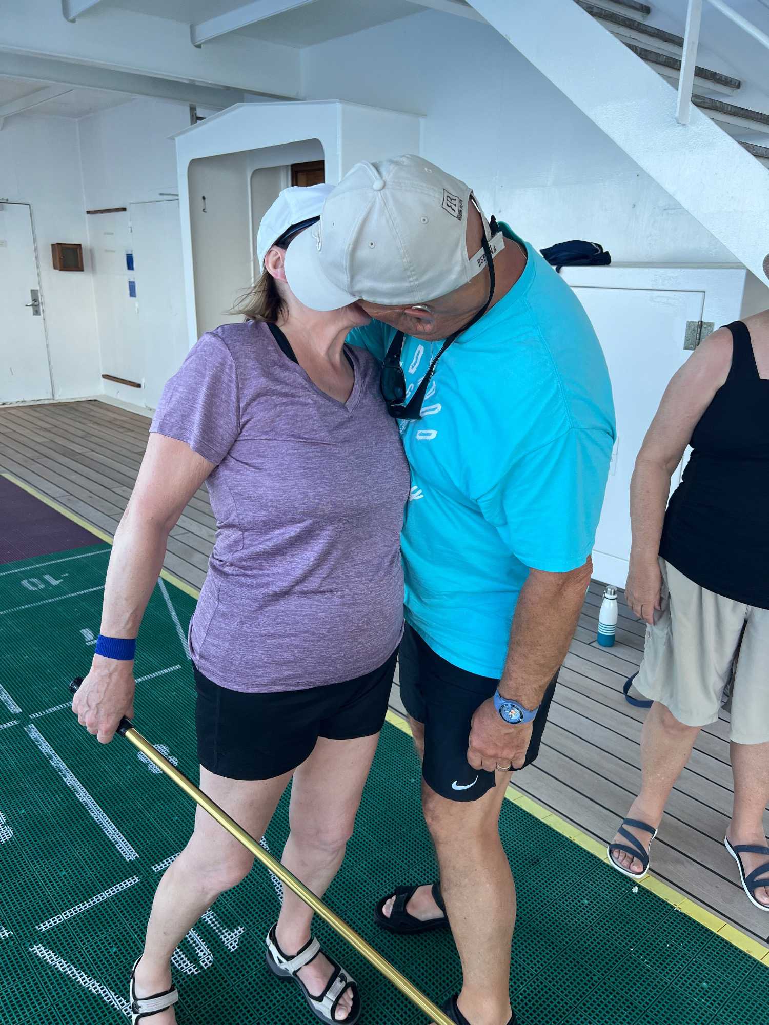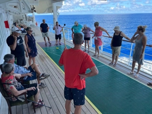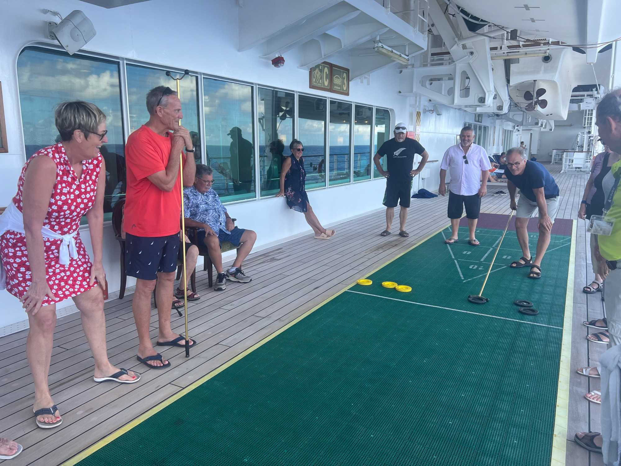 Au début de l’après-midi, j’ai eu la permission de pouvoir jouer au shuffleboard avec notre groupe. Permission exclusive car habituellement, ils ne permettent pas de jouer les journée en mer (de peur de perdre les galets!). 21 personnes ont répondues à mon invitation! Je vous le dit, nous sommes un beau groupe tissé serré et participatif! Nous avons jouer 2 heures avant de pouvoir nommer les gagnants du tournoi: Sylvie et Gilles! Bravo à vous deux!!! Vous allés voir dans les photos qu’il y a eu des encouragements de toutes sortes de la part des spectateurs…