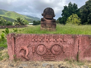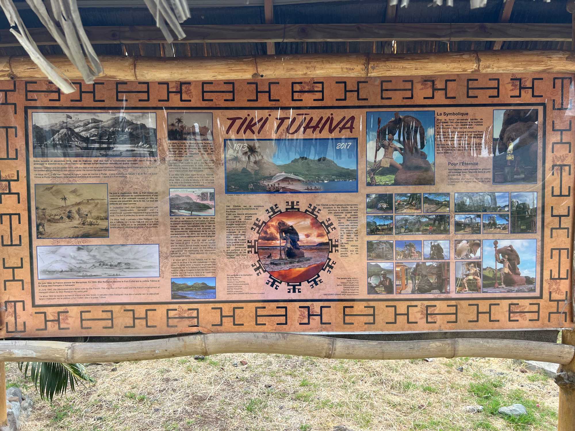Nous pouvons faire la grasse matinée, ou débarquer du navire pour aller explorer les environs car notre excursion n’est qu’en après-midi. De mon côté, j’offre aux voyageurs qui le souhaitent d’aller nous baigner dans la baie voisine. Ce n’est qu’à 10 minutes de marche du quai. L’eau est bonne et chaude. On se laisse bercer par les vagues. En passant, nous nous arrêtons au site du TIKI TOHIVA, la sculpture contemporaine la plus haute du Pacifique. C'est une oeuvre structurelle en béton projeté recouvert de «keetu» (conglomérat d'argile rouge utilisé par les sculpteurs marquisiens) mélangé à des roches volcaniques. Elle mesure 12 mètres de haut et le guerrier a une taille de 8 mètres. Six personnes ont participé à sa réalisation et les travaux ont duré six mois. La symbolique cette statue: Avec la force ancestrale héritée de la femme TIKI «Gardienne de la tradition et du savoir », le guerrier Tuhiva s'élance pour façonner son futur.