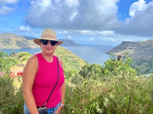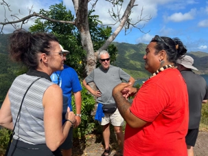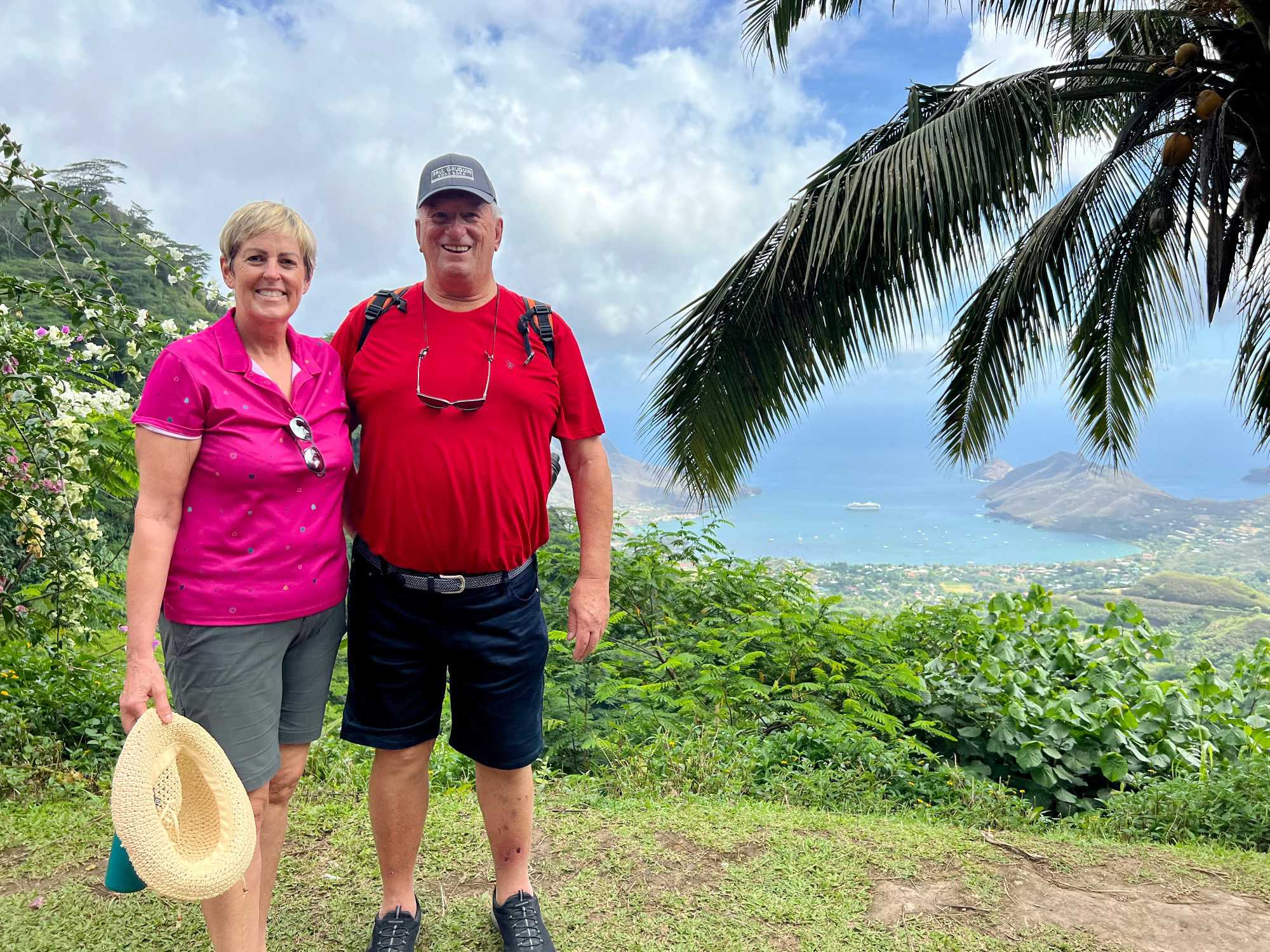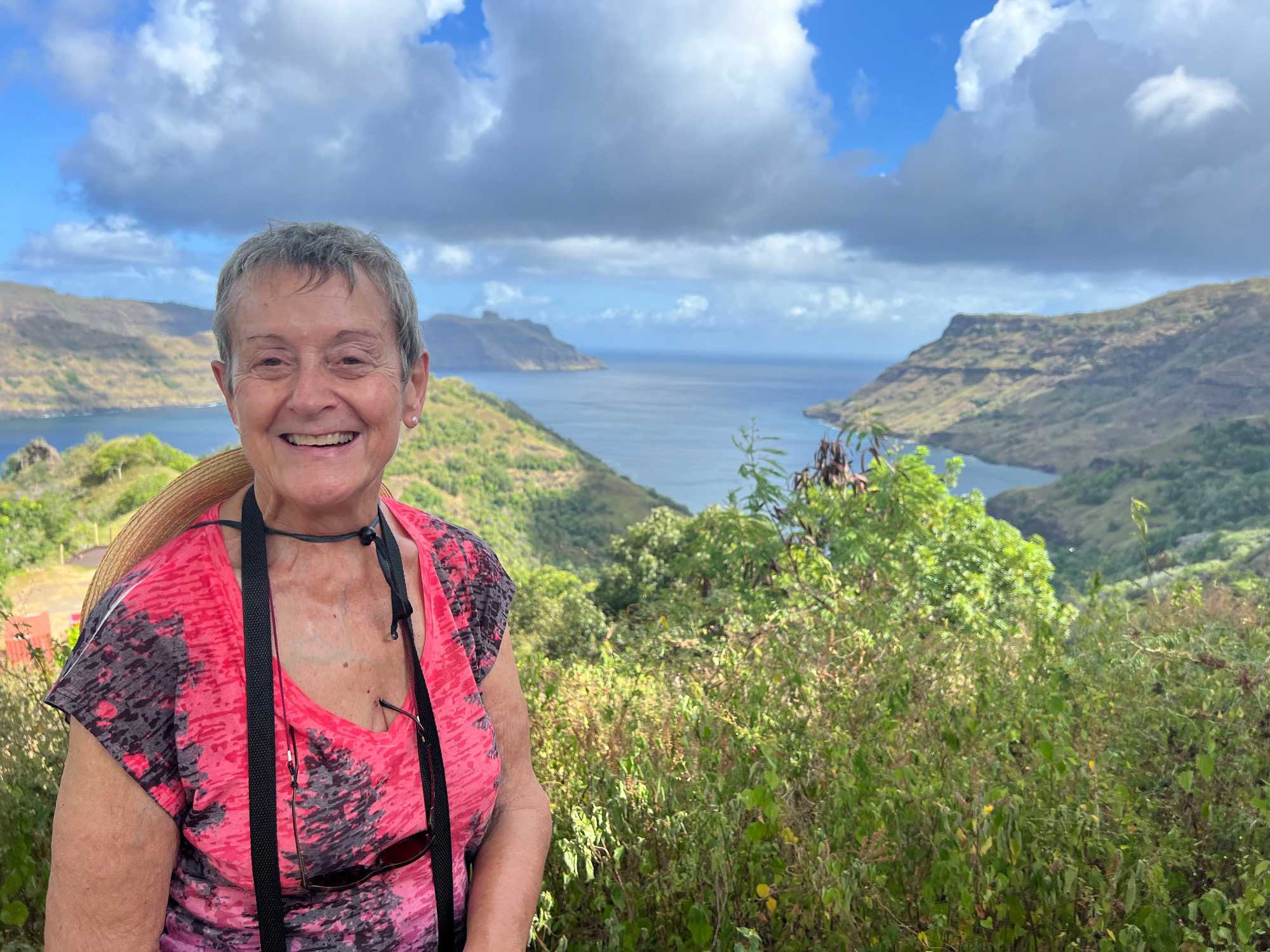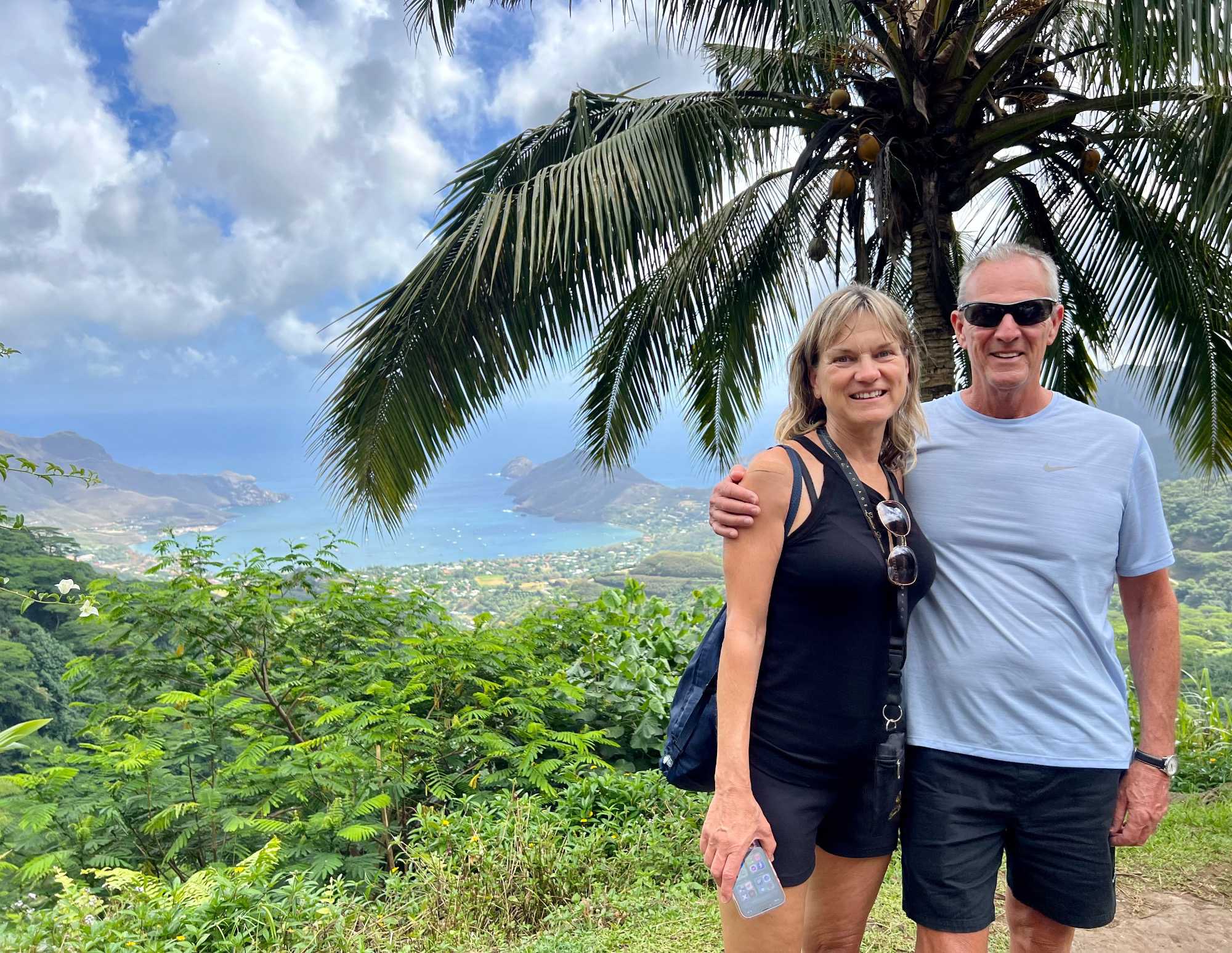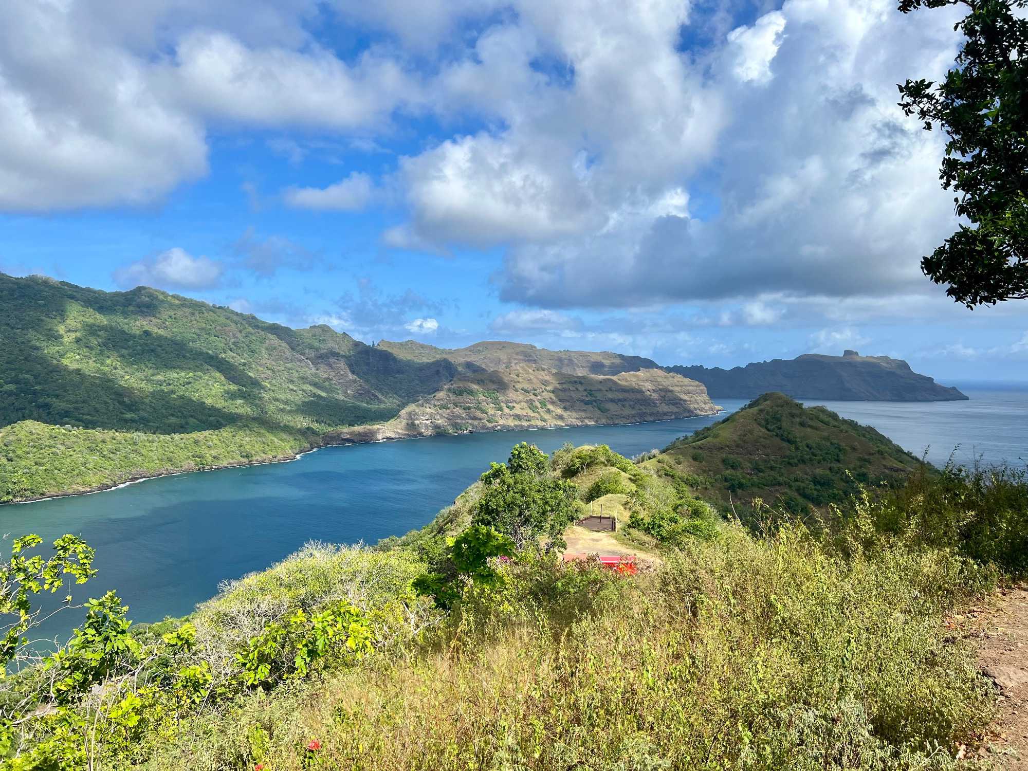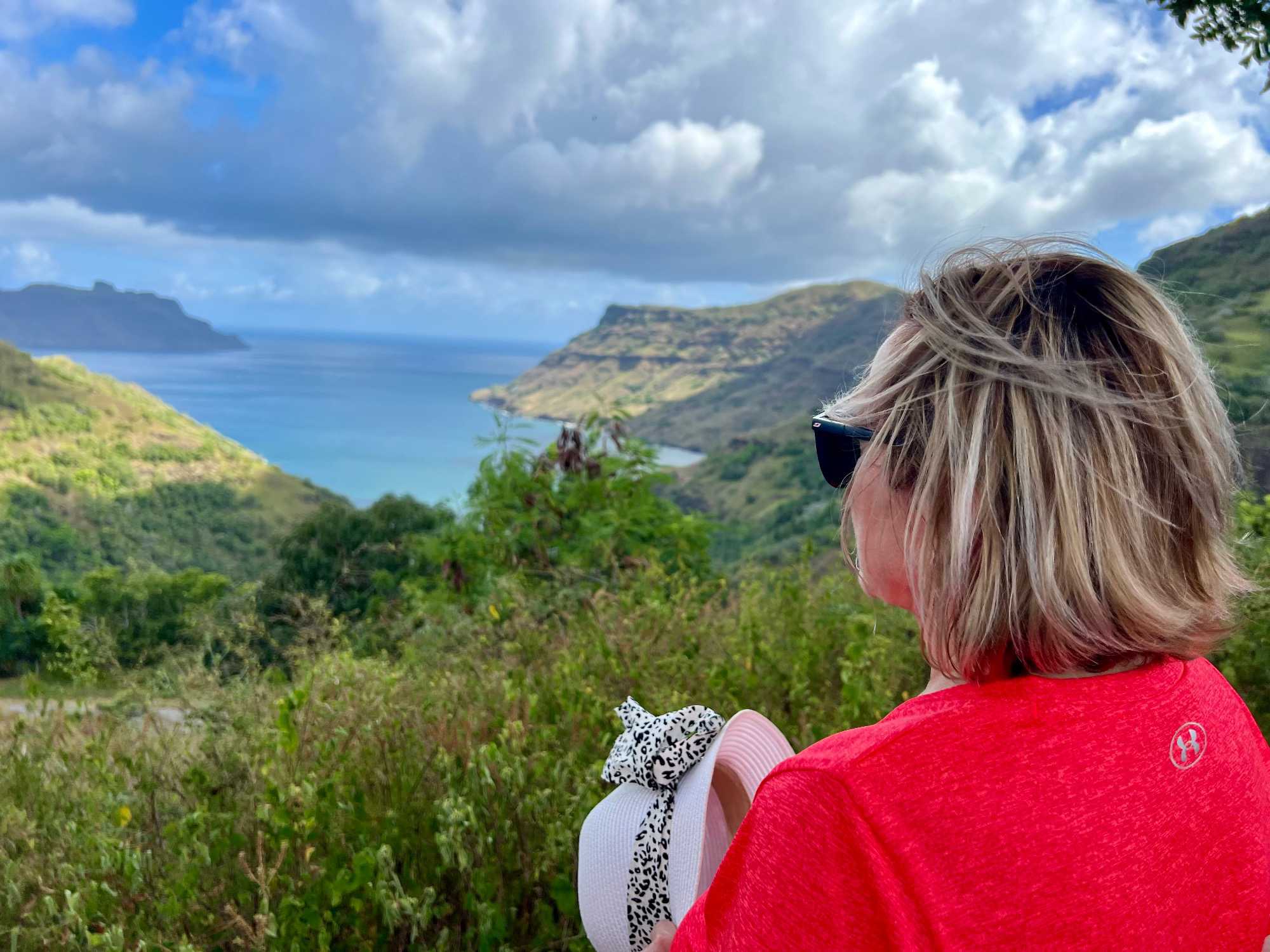 L’île est la plus grande de l’archipel des Marquises tant par sa superficie que par sa population de 3 000 habitants. Toutes les îles de l’archipel sont des îles volcaniques formées par les crêtes émergées de volcans éteints depuis deux millions d’années. Leurs reliefs sont constitués de pics de basalte (roche magmatique volcanique issue d’un magma refroidi rapidement) hauts d’une centaine de mètres. Vous verrez l’une des calderas de l’île, que j’ai pris en photo avec beaucoup de mes voyageurs sur ce tableau de carte postale avec le palmier et la baie en bas-relief. C’était un endroit pour s’imprégner de la beauté des lieux.