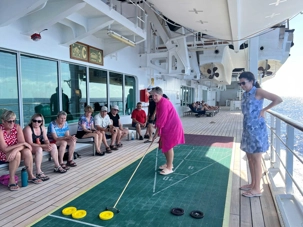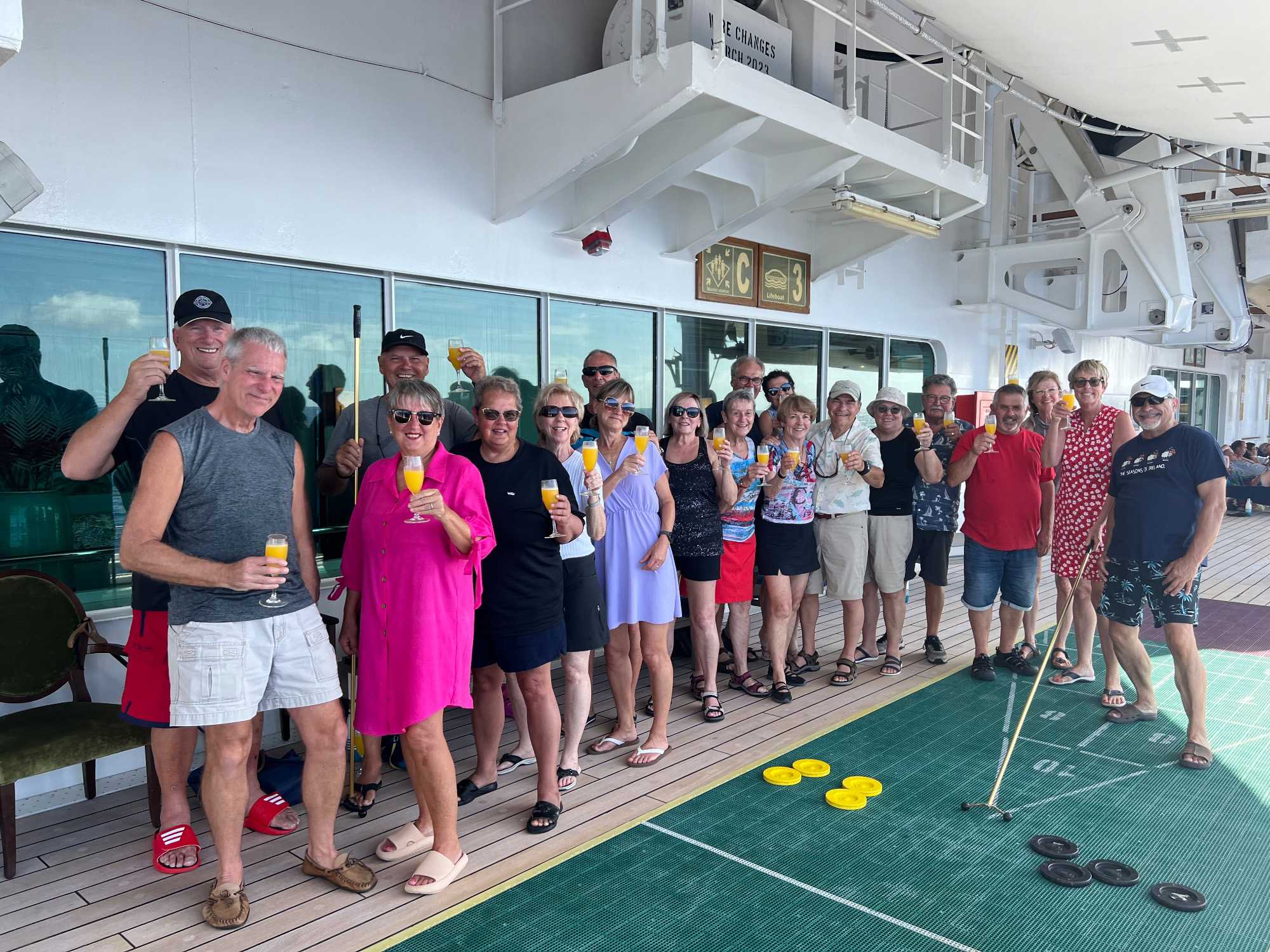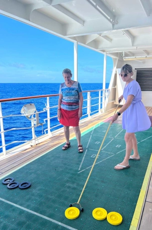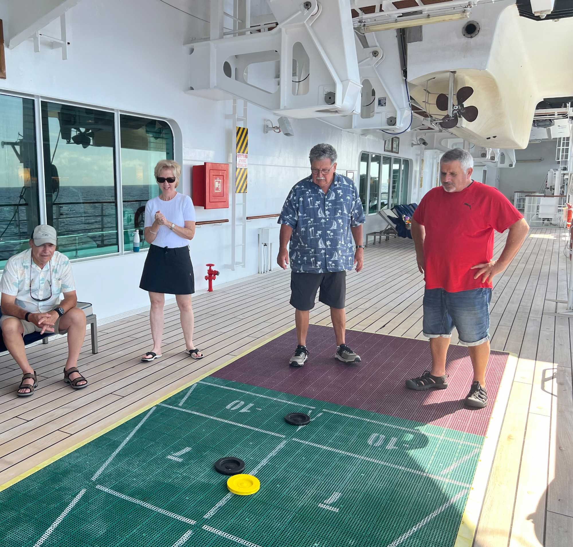 Après l’engouement qu’avait suscité notre premier tournoi de shuffleboard, nous récidivons cet après-midi. Nous sommes encore une vingtaine à participer. La compétition est féroce (et amicale!), et c’est… Danielle et Jean qui remportent les honneurs!!! On a même eu le plaisir de boire un mimosa en plein jeu: merci aux employés du Gauguin!