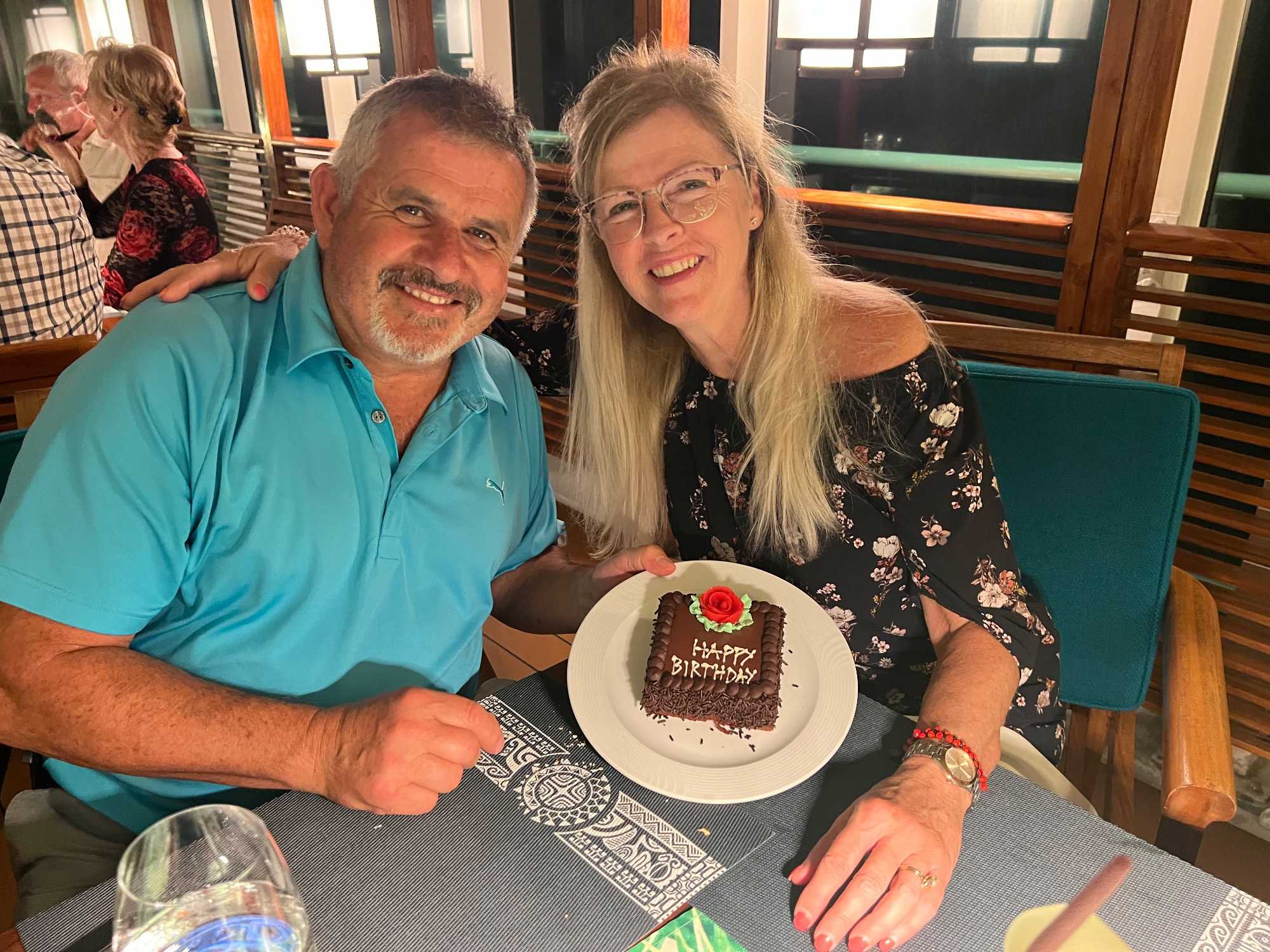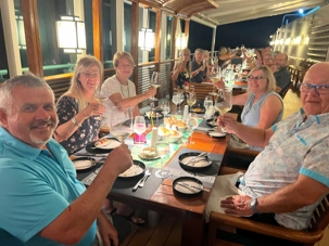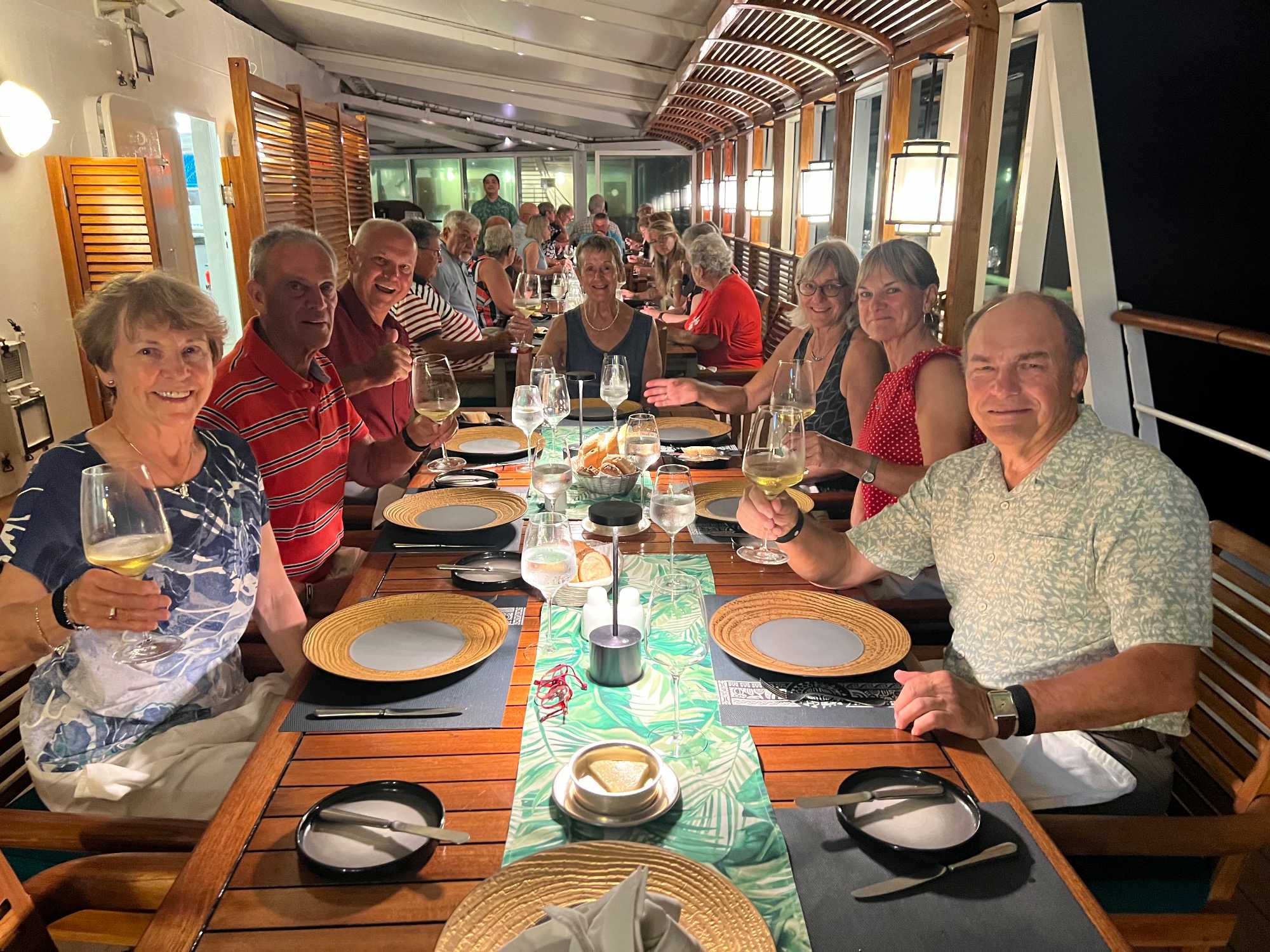 On se rejoint à l’apéro au piano bar, comme à tous les soirs. Pour le souper, tout le groupe est invité au restaurant Le Grill, situé au pont 8, à l’extérieur. C’est si agréable de manger dehors par cette douce chaleur du soir. On en profite, car on est tous là, pour souligner plusieurs anniversaires de mariage et des fêtes significatives de nos voyageurs. C’est encore la fête pour tous!!! Même les Gauguines et les Gauguins sont venus chanter pour nous.