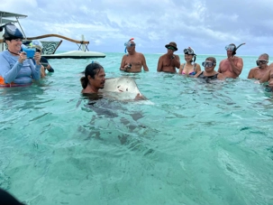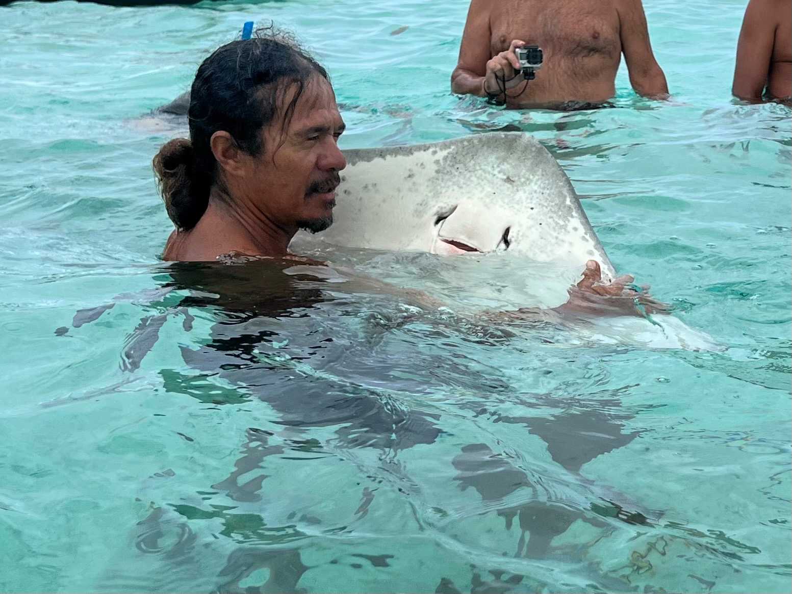 Voici dans le détail le déroulement de notre journée. Au quai ce matin, nous avons rencontré nos trois capitaines de pirogues. Une fois bien installé à bord, nous sommes partis vers le lagon où une activité hors du commun nous attendait: nager avec les raies et les requins, les pieds dans le fond de l’eau!!! Et oui, tout le groupe a participé! Aucune hésitation, juste de l’enthousiasme. Il faut dire que ce sont des requins à pointe noire et qu’ils ne sont pas dangereux, si on ne tente pas de les attraper. Nous étions bien prévenus et on les regarde avec admiration circuler entre nous. Impressionnant à souhait et avec quelques raies pastenagues qui sont venues nous saluer aussi, c’était juste irréel. Juliette, Fifi et Gigi, (ce sont le noms de quelques unes des raies) sont venues nous rendre visite. On a pu les flatter et j’ai pu prendre Juliette dans mes bras. Expérience inoubliable!