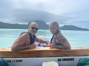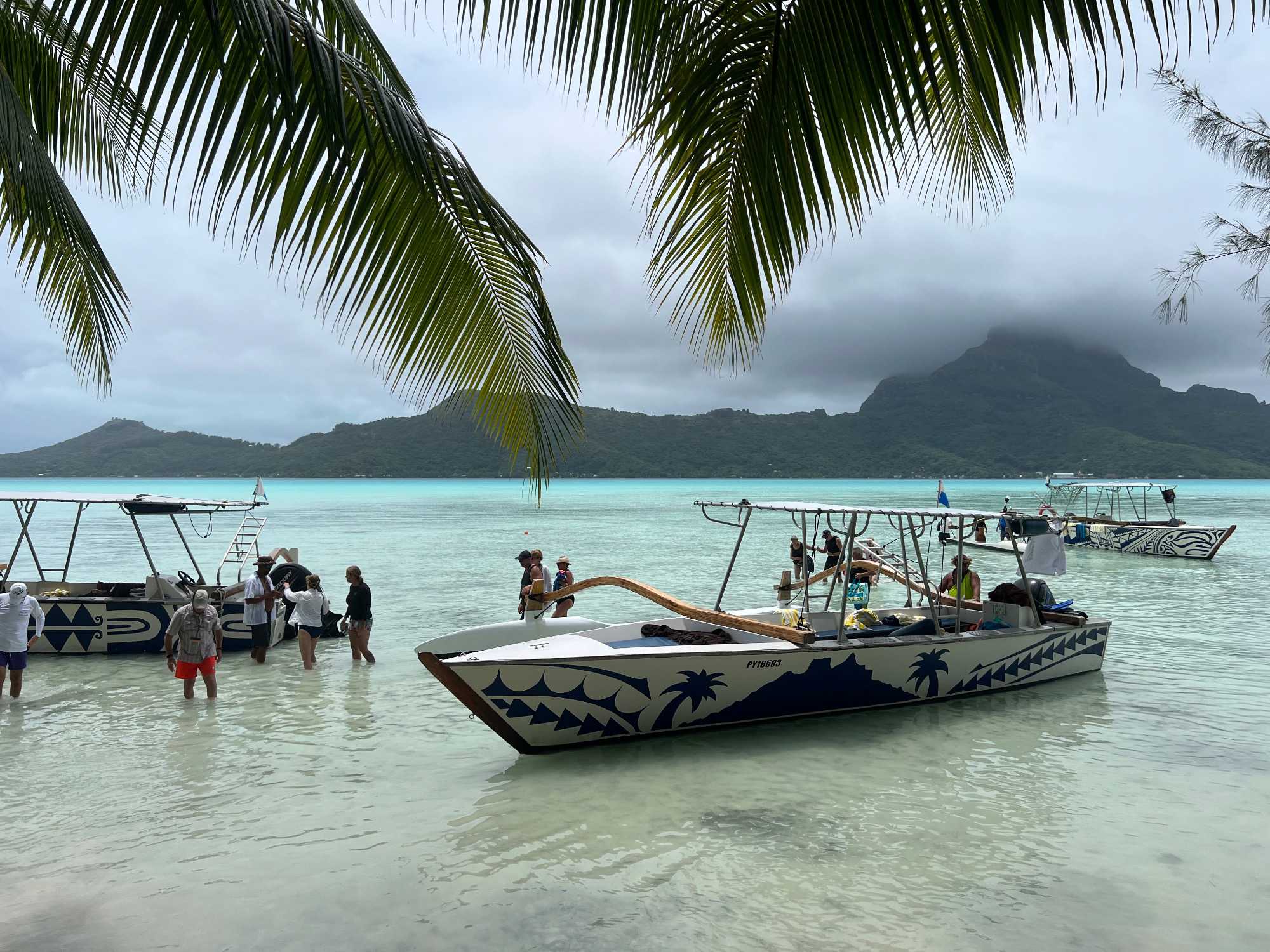 Un rêve se réalise pour plusieurs personnes voyageant avec moi! Nous sommes à Bora Bora! Nous avons eu une journée WOW WOW WOW!!! À bord de pirogues privatisées juste pour nous, nous avons fait une tournée des attractions les plus populaires de l’île: nager avec les requins et les raies, faire de la plongée dans un jardin de corail, manger sur un motu privé et faire le tour de l’île commenté par notre capitaine à bord. Une journée vraiment complète pour apprécier ces paysages de rêve. Heureusement que la météo s’est améliorée en cours de journée. Les nuages se sont dissipés juste le temps de faire notre excursion et la pluie (de 5 minutes) a eu lieu à notre retour.