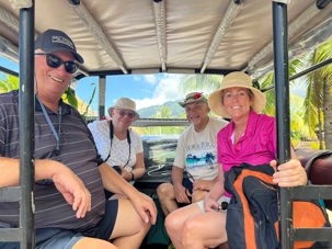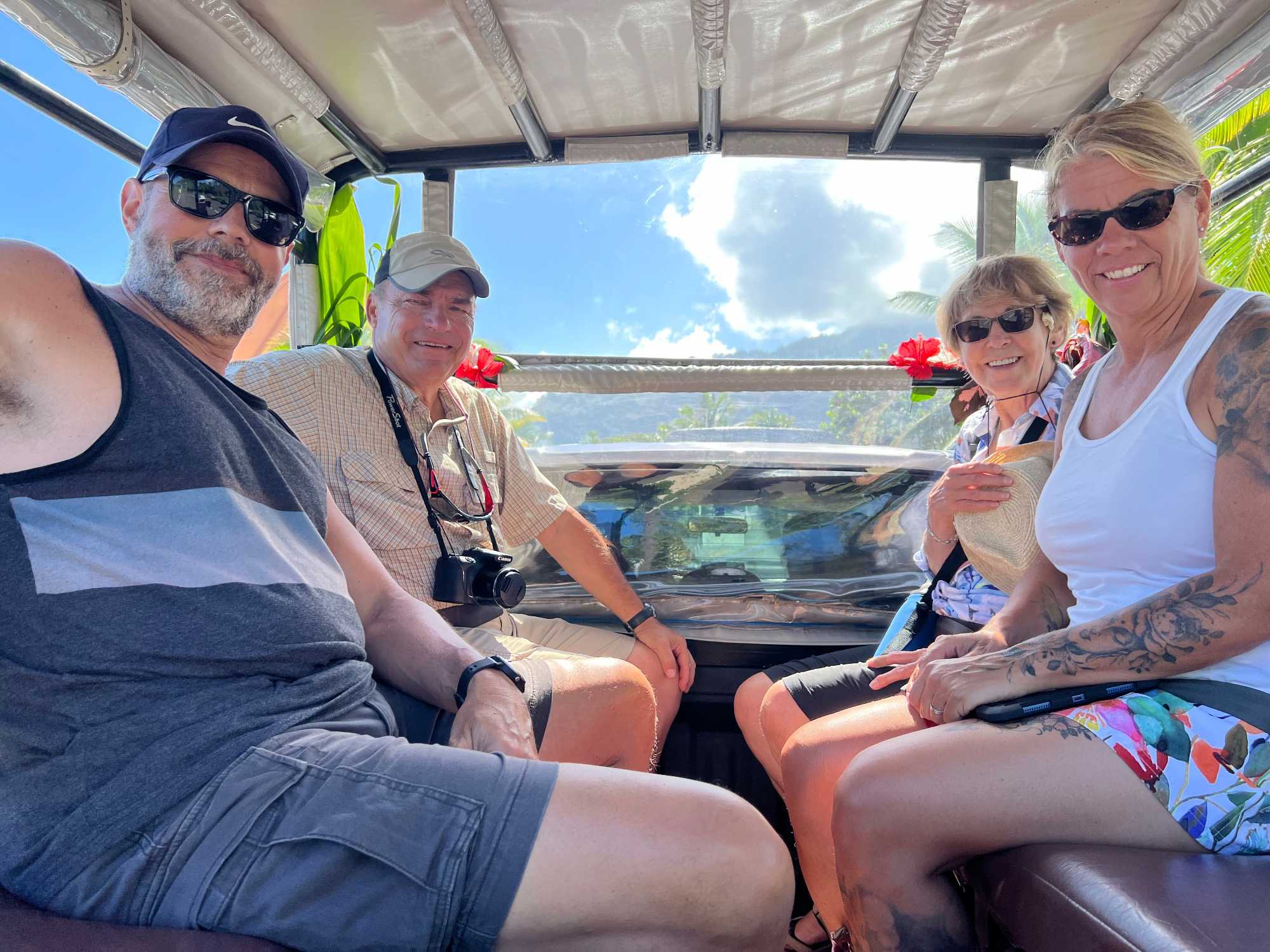 C’est sous un beau soleil éclatant que nous partons à la découverte de l’île de Moorea aujourd’hui. Pour bien faire les choses, nous avons prévu de faire deux petits groupes de 14 personnes: un groupe part à 8h30 et l’autre à 12h30. J’amène les gens du premier groupe (les lève-tôt!) au quai où nous rencontrons notre charmante et dynamique guide, Yvette et son acolyte Étienne. Nous avons 2 voitures avec une possibilité de 8 personnes assises à l’arrière, au vent, et 2-3 personnes assises bien confortablement à l’intérieur de la voiture, à l’air climatisé. C’est selon le choix de chacun. Je serai en compagnie du deuxième groupe.