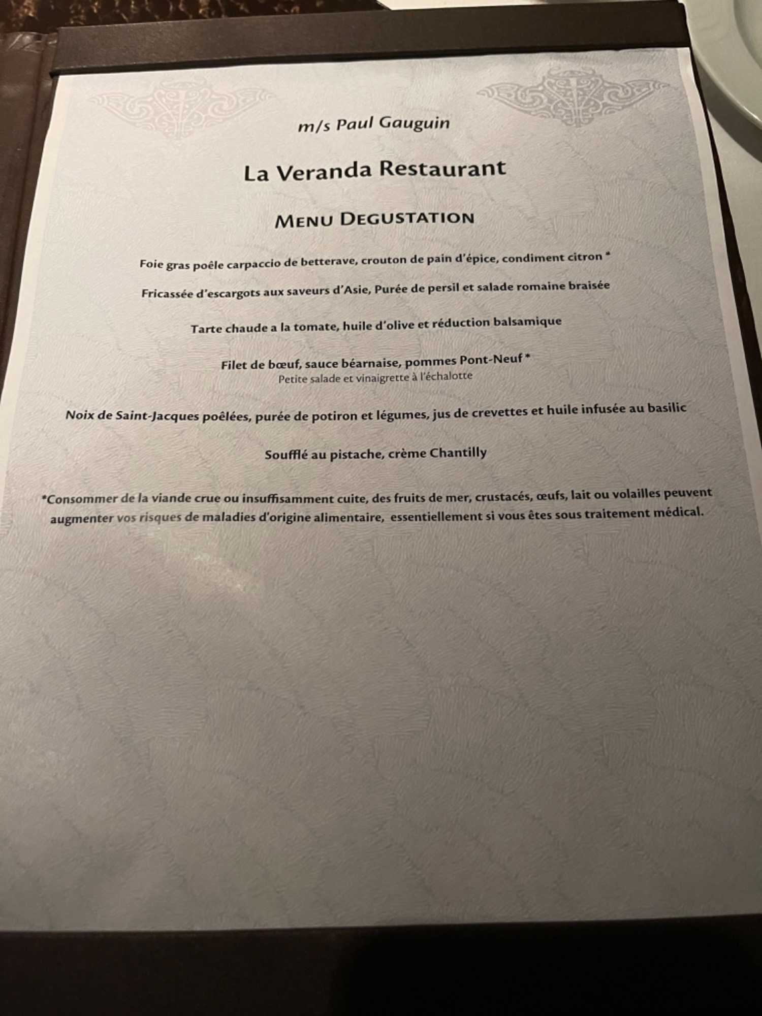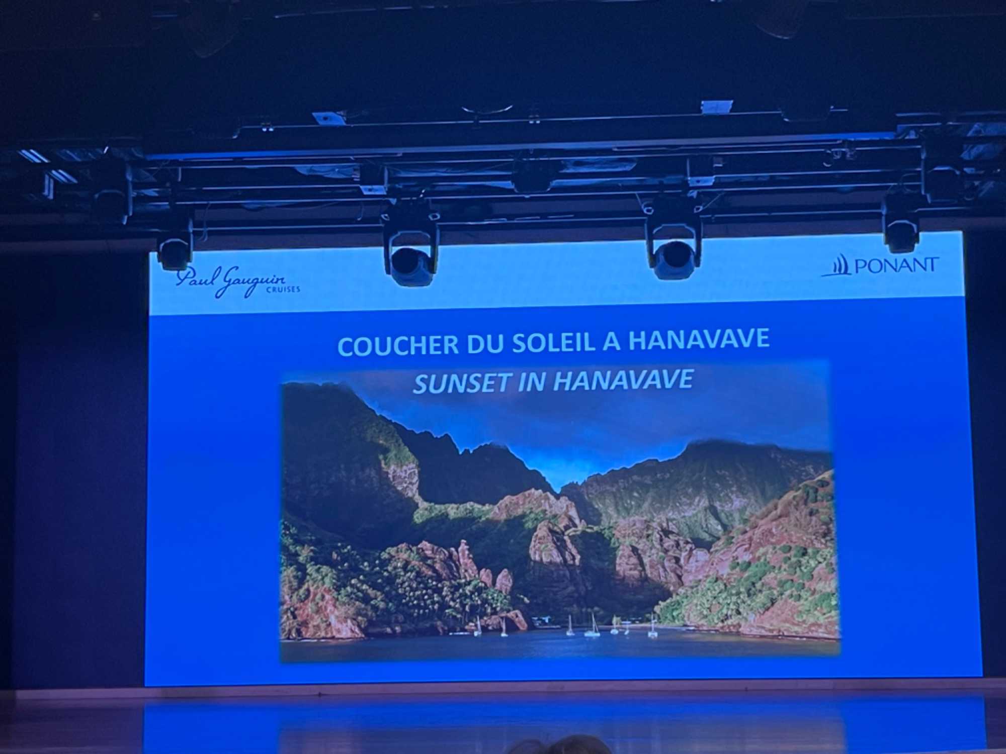 Hier soir, nous avons eu un magnifique souper au restaurant de spécialité du Gauguin et quel service! Les choix étaient super et nous avons vraiment bien mangé comme toujours. J’ai pris quelques photos de la présentation de ces plats dignes des grands restaurants français. Maintenant parlons de la journée d’aujourd’hui et oui il fait encore un beau soleil et la température est toujours agréable avec le vent. Le soleil est bien supportable avec ce doux vent. La mer est un peu agitée aujourd’hui mais cela ne nous empêche pas de suivre les nombreuses activités proposées par le navire. Ce midi, nous avons eu droit à un diner grec. Plusieurs sont allés visiter la passerelle pour s’entretenir avec le commandant et ses officiers, c’est si facile quand tous parlent français. Nous naviguons vers les îles Marquises dont la superficie totale est de 997 km2. Elles constituent un des archipels les plus étendues de la Polynésie française. Nous sommes à 975 km de l’équateur et 1 000 km au nord-ouest des îles Tuamotu. Les îles, il y en a six, sont d’origine volcanique et ont un relief escarpé. Les sommets peuvent atteindre les 1 100 m d’altitude. Ses falaises plongent dans la mer jusque dans les fonds marins et sont constamment érodées par les courants du Pacifique Sud. Les paysages volcaniques sont à l’origine de nombreux noms de lieux : Hiva Oa, La Grande Crête; Nuku Hiva, La Crête des Falaises; Fatu Iva, Les neuf Roches, etc…