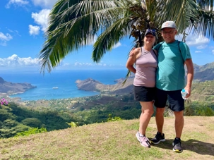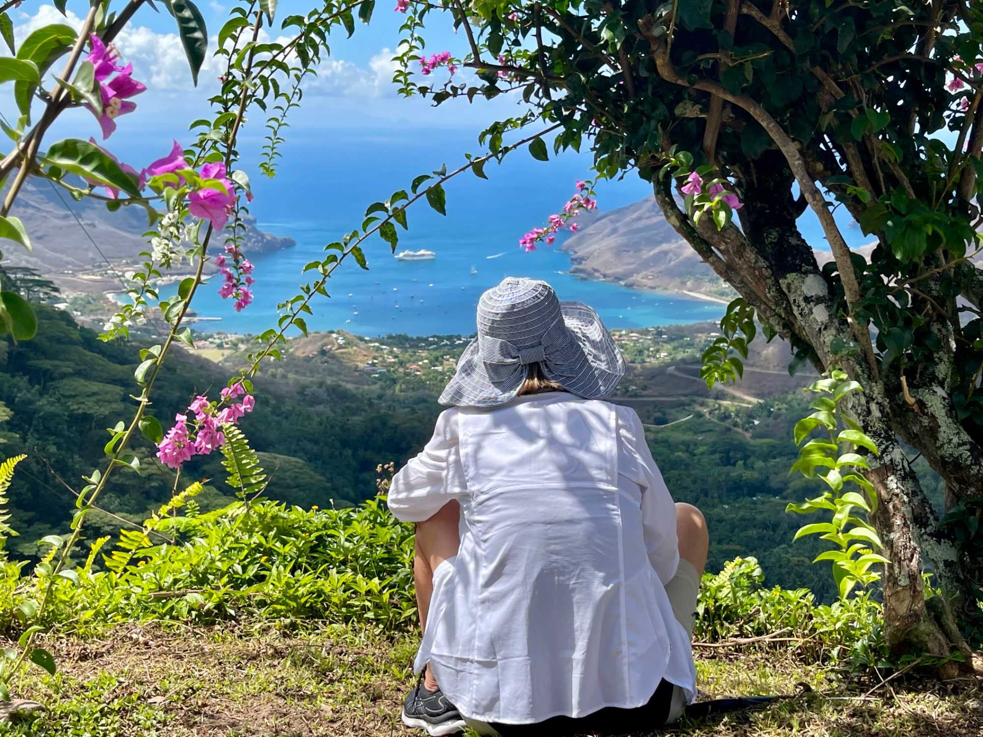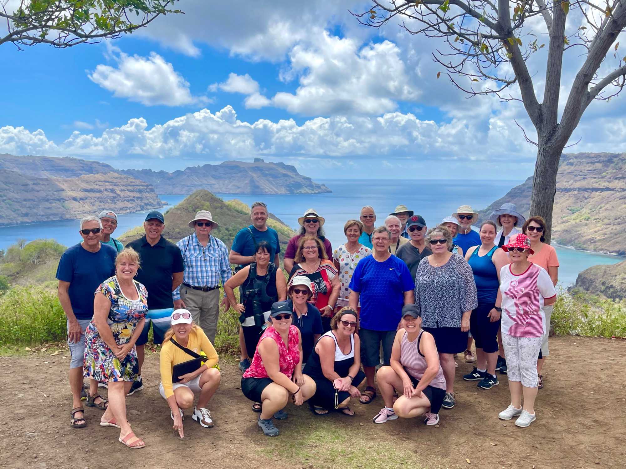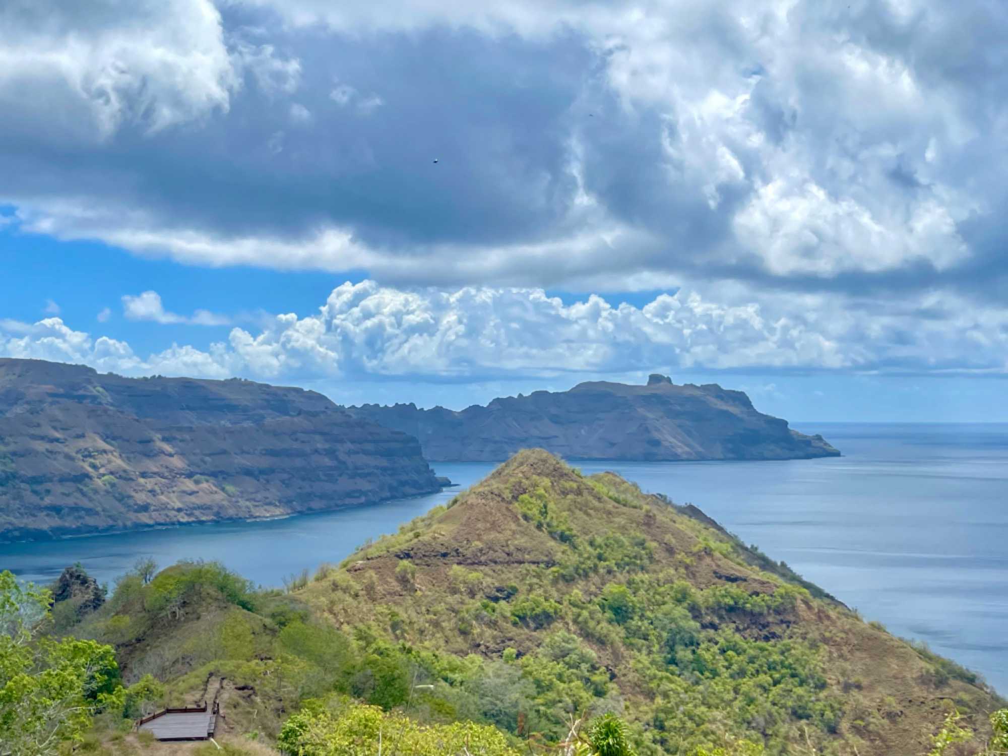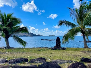 L’île est la plus grande de l’archipel des Marquises tant par sa superficie que par sa population de près de 3 000 habitants. Toutes les îles de l’archipel sont des îles volcaniques formées par les crêtes émergées de volcans éteints depuis deux millions d’années. Leurs reliefs sont constitués de pics de basalte (roche magmatique volcanique issue d’un magma refroidi rapidement) hauts d’une centaine de mètres. Vous verrez l’une des calderas de l’île lorsque j’ai pris en photo, beaucoup de mes voyageurs sur cette photo de carte postale avec le palmier et la baie en bas-relief. C’était un endroit pour s’imprégner de la beauté des lieux. Nous avons donc rencontré nos chauffeurs et notre guide Deborah car encore aujourd’hui, c’est à bord de 4 véhicules que nous montons pour faire notre excursion. Debora au premier arrêt nous parle de son île avec passion et amour. Elle nous raconte aussi la création des Marquises et son histoire. D'après la tradition orale, Hotu Matu’a, premier roi de l’île de Pâques, serait venu de Nuku Hiva, après avoir d'abord envoyé sept praos (type de voilier multicoque) en éclaireurs dans tous les azimuts, pour trouver de nouvelles terres.