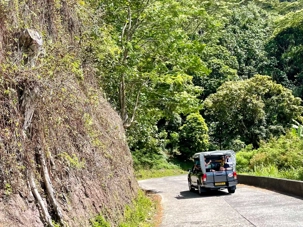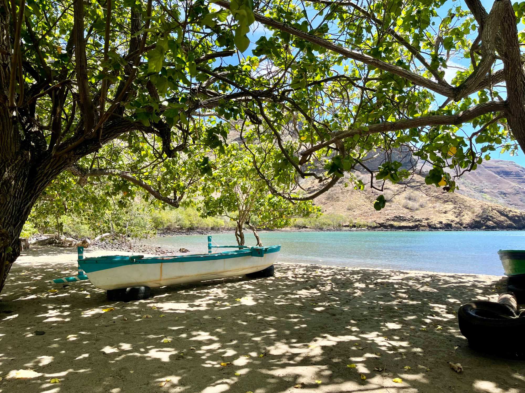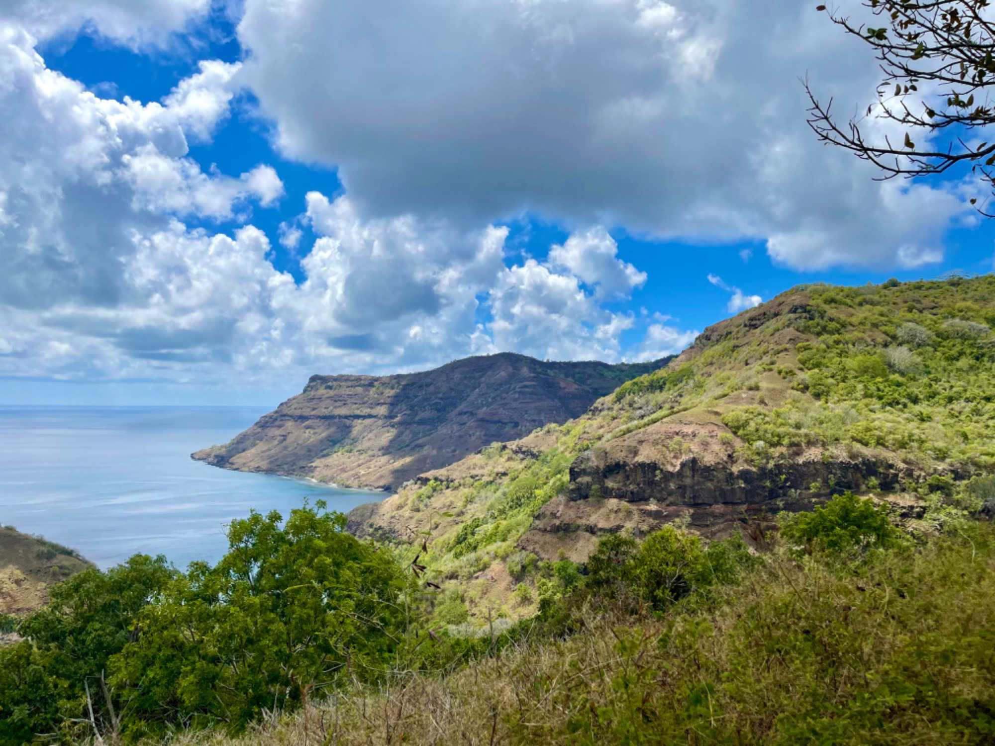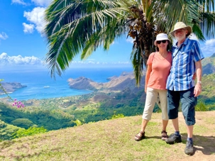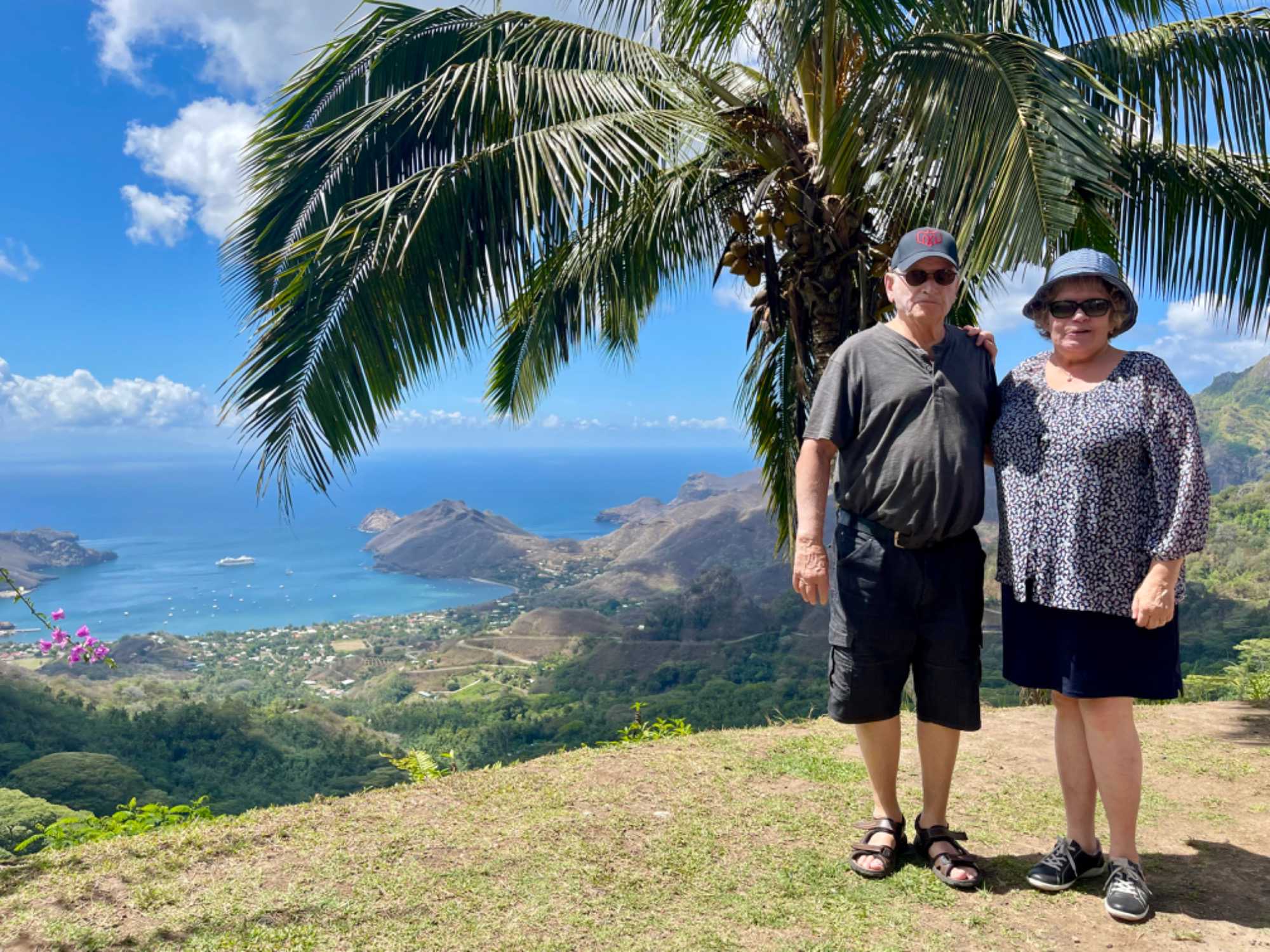L’île est la plus grande de l’archipel des Marquises tant par sa superficie que par sa population de près de 3 000 habitants. Toutes les îles de l’archipel sont des îles volcaniques formées par les crêtes émergées de volcans éteints depuis deux millions d’années. Leurs reliefs sont constitués de pics de basalte (roche magmatique volcanique issue d’un magma refroidi rapidement) hauts d’une centaine de mètres. Vous verrez l’une des calderas de l’île lorsque j’ai pris en photo, beaucoup de mes voyageurs sur cette photo de carte postale avec le palmier et la baie en bas-relief. C’était un endroit pour s’imprégner de la beauté des lieux. Nous avons donc rencontré nos chauffeurs et notre guide Deborah car encore aujourd’hui, c’est à bord de 4 véhicules que nous montons pour faire notre excursion. Debora au premier arrêt nous parle de son île avec passion et amour. Elle nous raconte aussi la création des Marquises et son histoire. D'après la tradition orale, Hotu Matu’a, premier roi de l’île de Pâques, serait venu de Nuku Hiva, après avoir d'abord envoyé sept praos (type de voilier multicoque) en éclaireurs dans tous les azimuts, pour trouver de nouvelles terres.