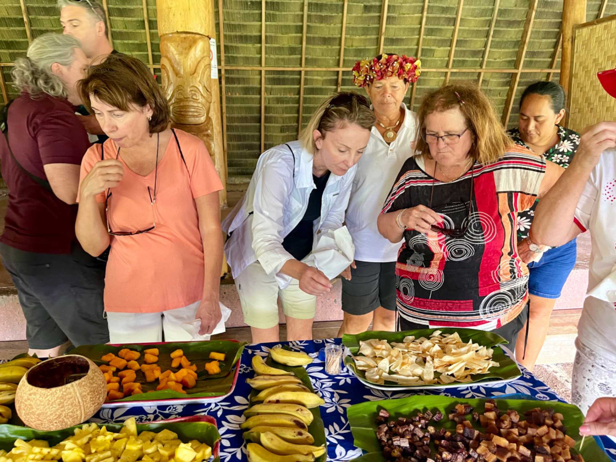 Nous avons vu des plantations de bananiers et si vous remarquez de grosses bananes c’est une variété pour la cuisson sur leur île. Nous avons visité un centre d’artisanat ou les jolis colliers de graines sont toujours des plus attrayants et que dire de leurs sculptures qui sont tout à fait exceptionnelles. Le centre artisanal nous avait préparé un buffet de fruits locaux et aussi de chips fait avec du manioc et aussi avec le fruit de l’arbre à pain. Nous apprécions ces belles découvertes locales.
