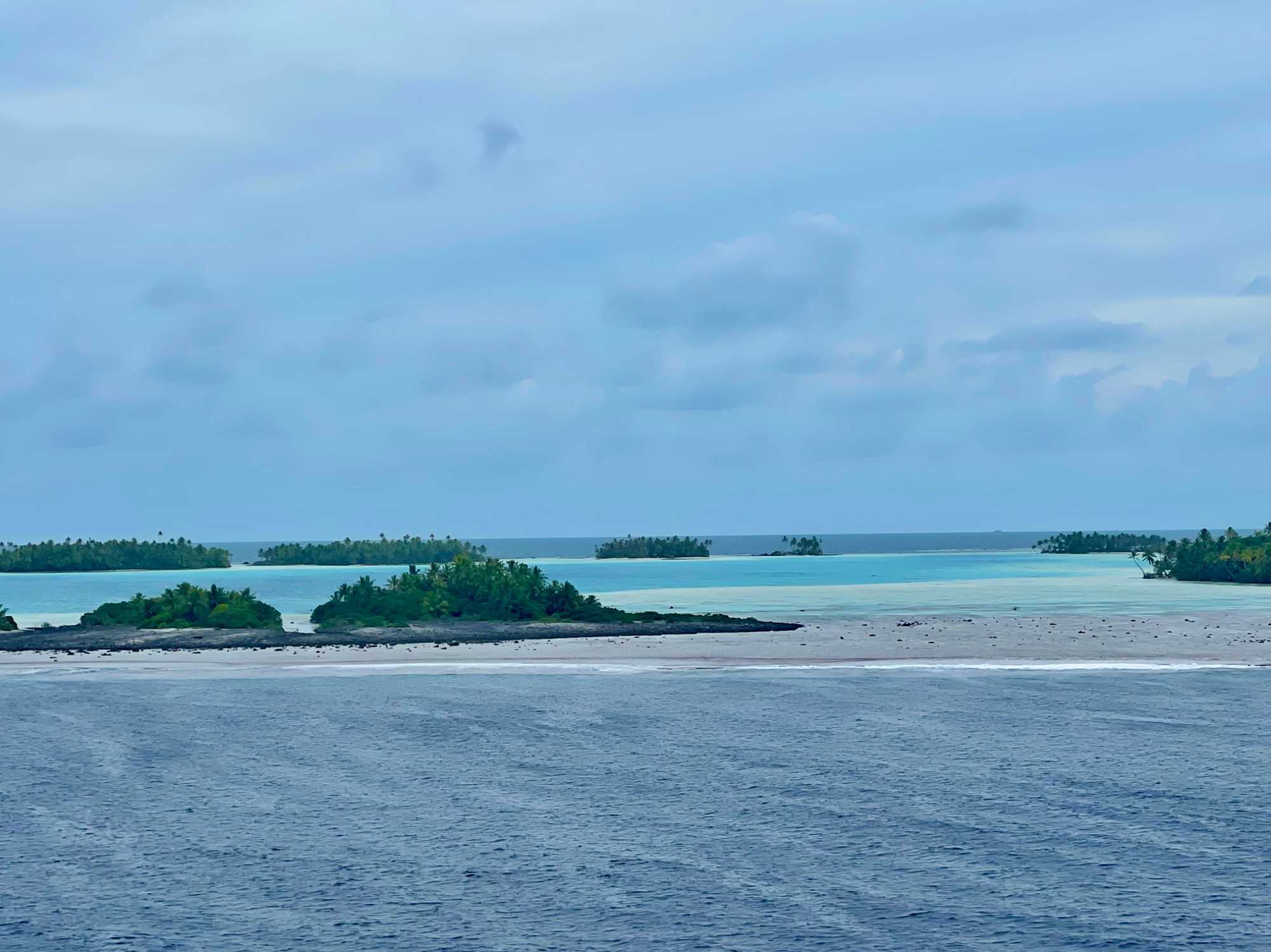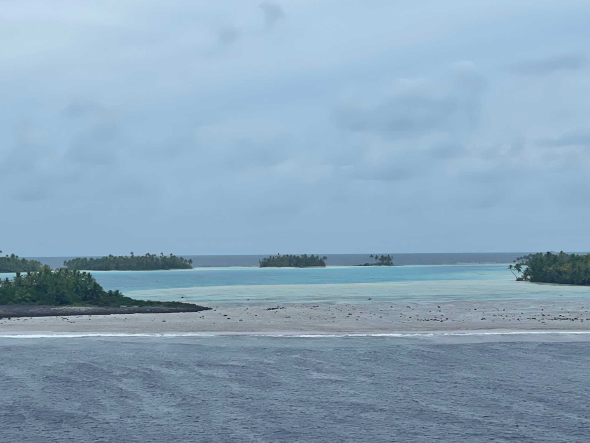 La renommée Rangiroa, son lagon bleu. C’est un lagon à l'intérieur du lagon, de très faible profondeur. Notre commandant nous a fait la surprise ce soir de naviguer en fin de journée tout près du Lagon bleu pour nous le faire voir. IL est vraiment magnifique même si nous n'avions pas le soleil pour l'admirer.