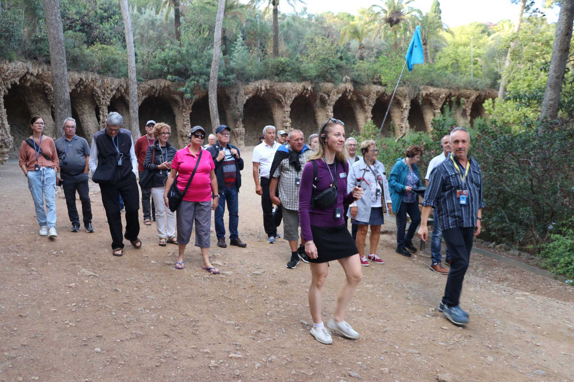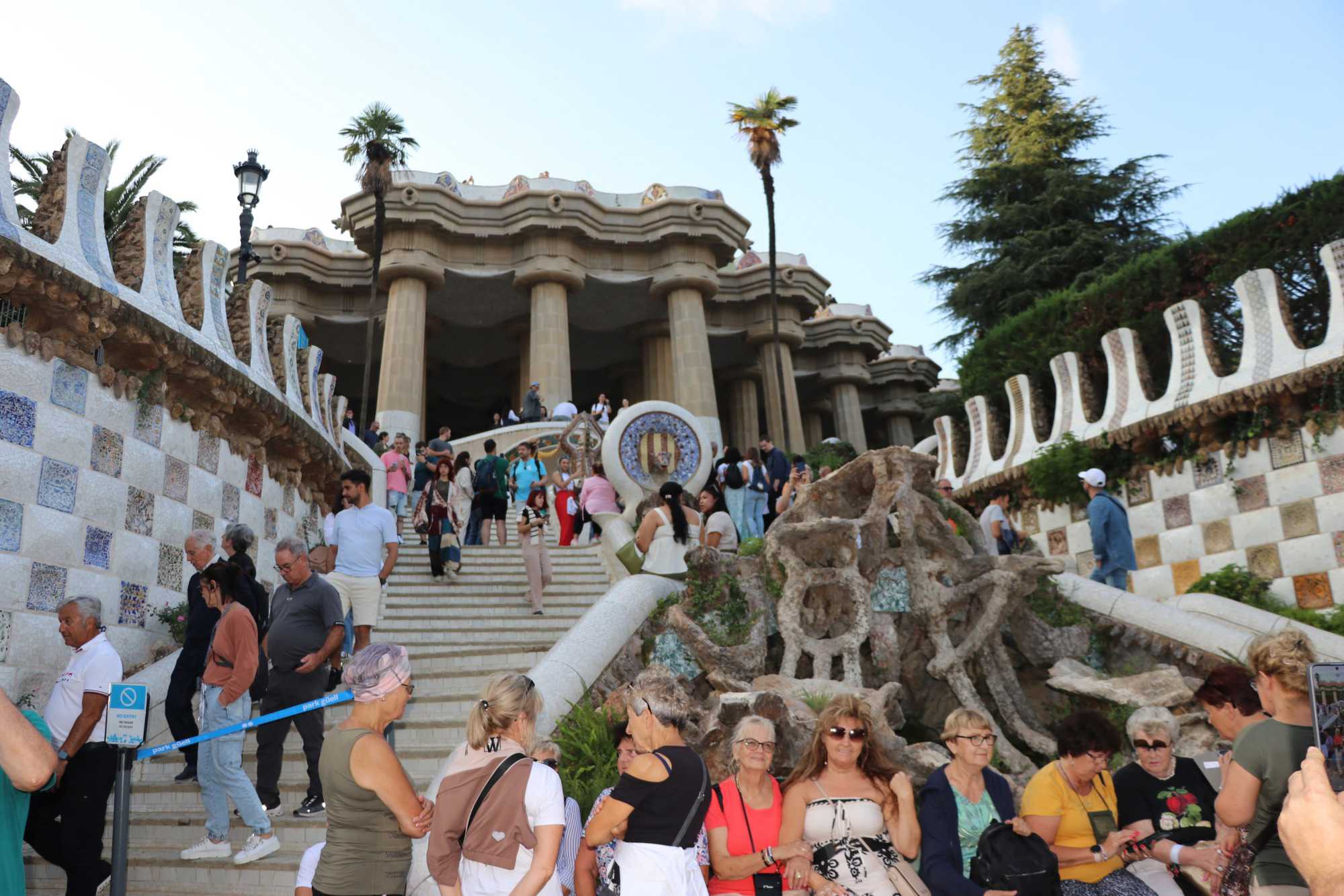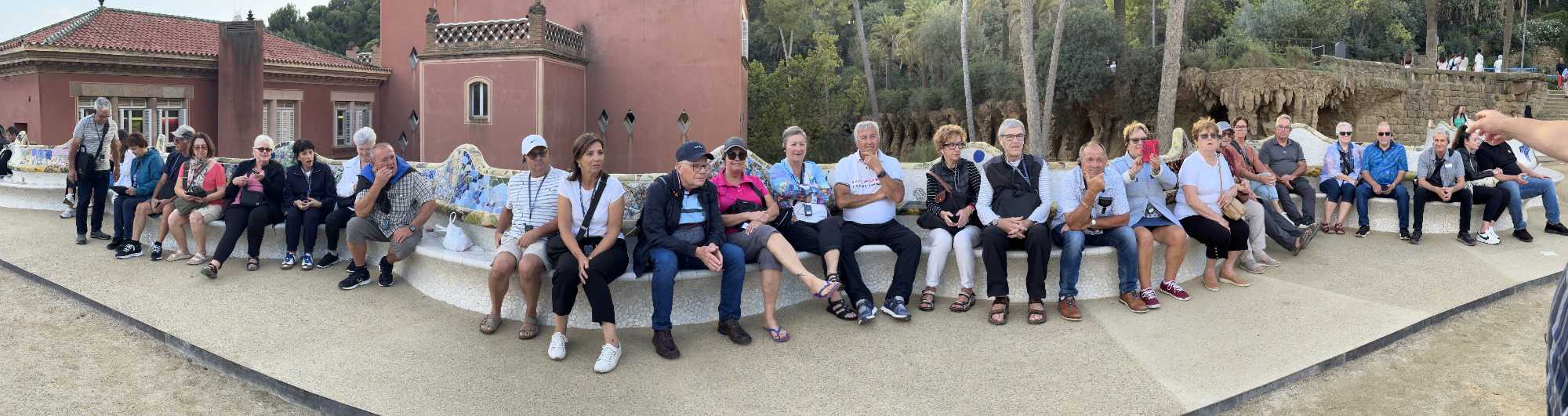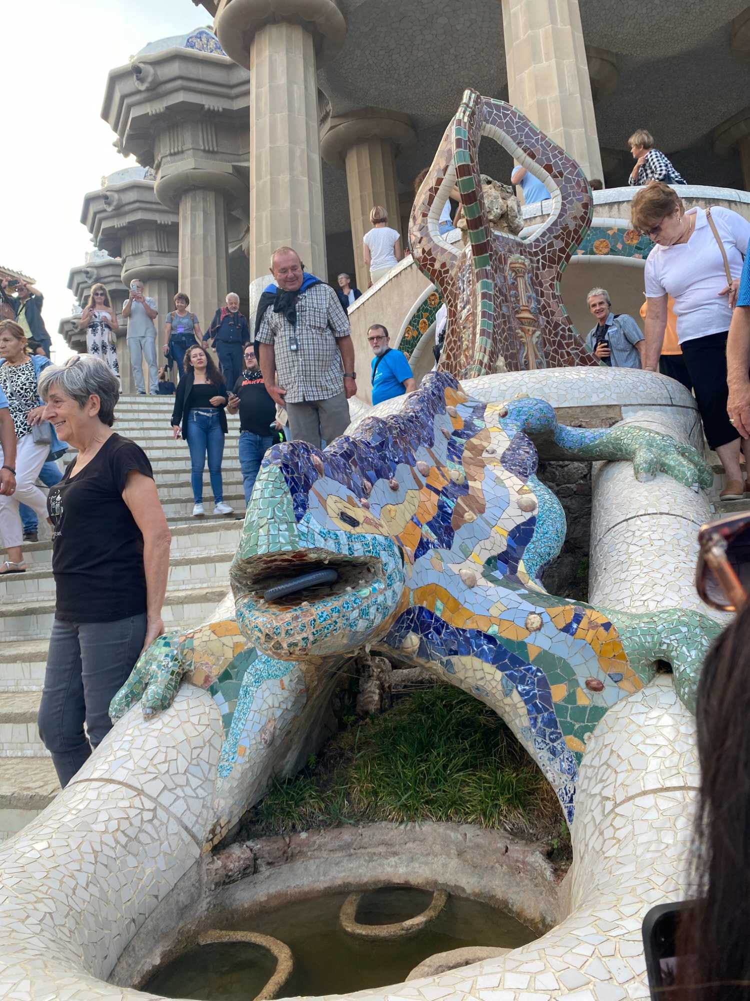 Le Parc Güell est un lieu qui semble tout droit sorti d’un conte de fées! Ici, chaque courbe, chaque structure est une ode à la nature. Les colonnes des allées, par exemple, rappellent des troncs d’arbres, comme si la forêt elle-même avait sculpté ces formes. À l’entrée, deux maisons en forme de champignons encadrent un portail qui invite les visiteurs dans ce monde enchanteur. Une fois cette entrée franchie, on découvre un impressionnant escalier central orné de fontaines, dont la plus célèbre est la salamandre, aussi appelée "El Drac," devenue l’emblème du parc. Nous en profitons pour prendre une photo de groupe.