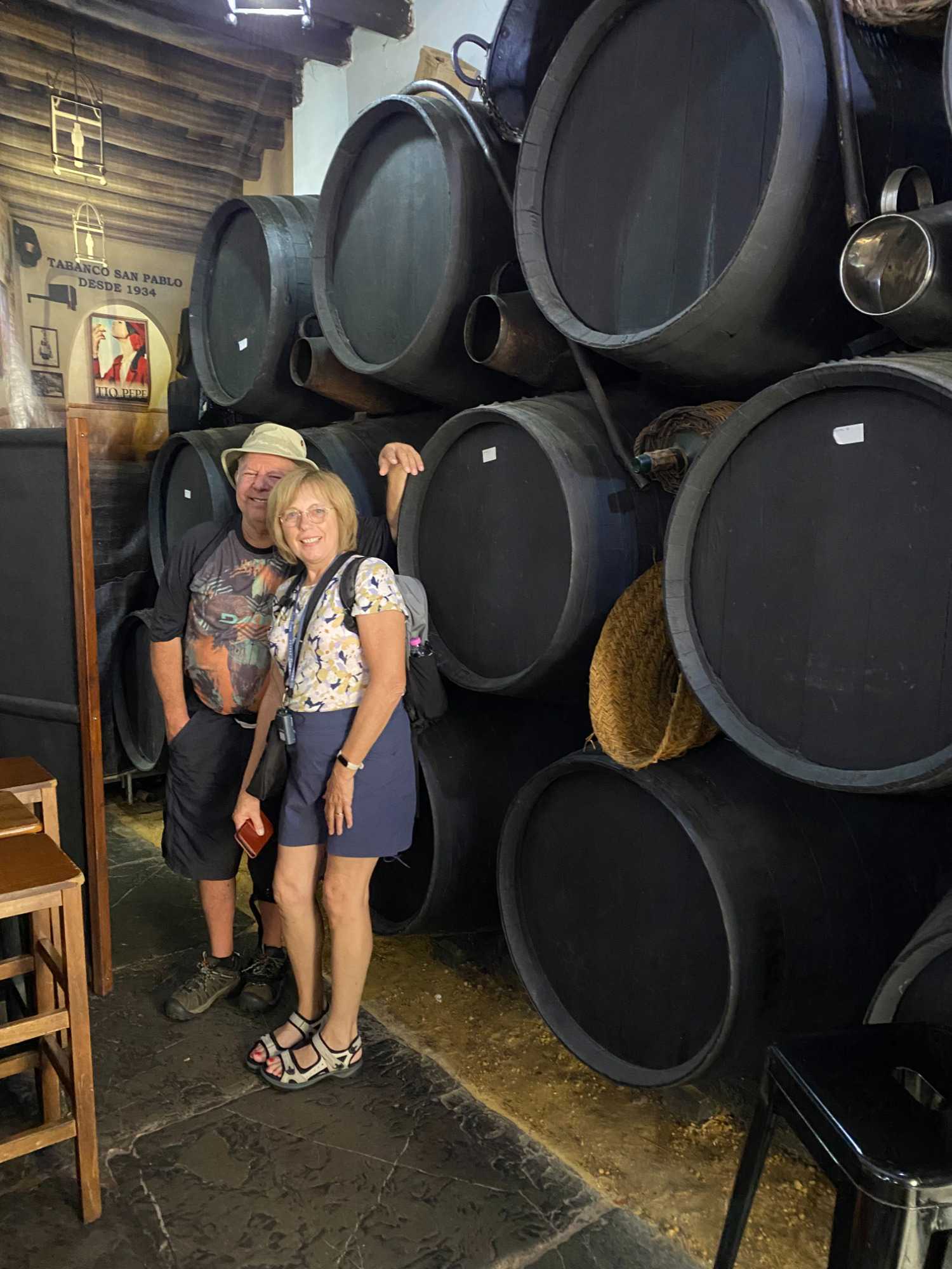 À notre arrivée à Jerez, Ana nous a retracé brièvement l’histoire de cette ville, célèbre pour son Alcazar mauresque et ses traditions viticoles ancestrales. Nous avons eu l’honneur de déguster deux variétés de vins de Jerez ( 15-16%), un demi-sec et un demi-sucré, accompagnés de tapas savoureux : du porc délicatement pané-grillé avec des épices typiques de la région, des morceaux de fromage savoureux et du pain frais. Un vin aux saveurs particulières, combinée à la chaleur de l’accueil andalou, a mis tout le monde de bonne humeur !