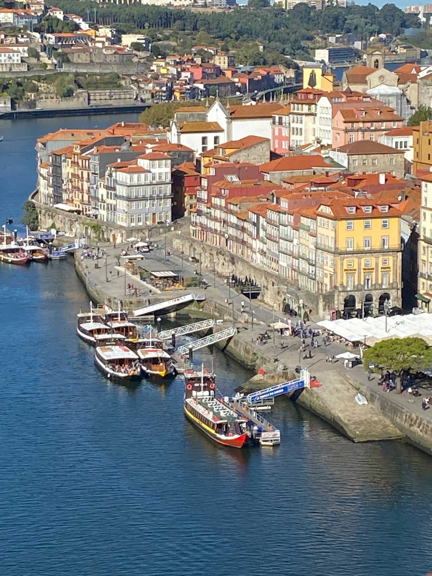 Nous avons ensuite commencé notre visite à pied dans le quartier de Vila Nova de Gaia en traversant le Pont Dom Luís I, un chef-d’œuvre de l’ingénieur Théophile Seyrig, ancien collaborateur de Gustave Eiffel. Nous avons été impressionnés par sa structure métallique à deux niveaux, un rappel évident de l’influence d’Eiffel. La vue sur le fleuve et la ville depuis ce pont est tout simplement à couper le souffle. Nous avons pris le temps de capturer ces moments en photo.