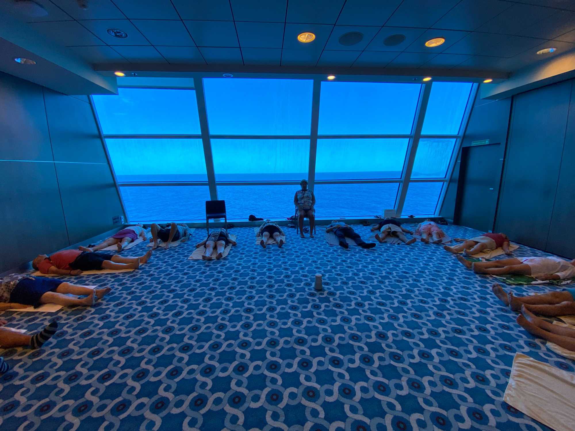 L’après-midi a été marqué par un nouvel atelier de bien-être que Juliane a eu le plaisir d’animer. Plus de la moitié des voyageurs se sont présentés, s’offrant un temps pour se reconnecter à eux-mêmes. Quelques exercices légers pour activer le corps, de la respiration consciente pour détendre le système nerveux, et un brin de méditation pour calmer l’esprit. À la fin, les sourires sur les visages détendus disaient tout : une véritable pause de bien-être pour tous!