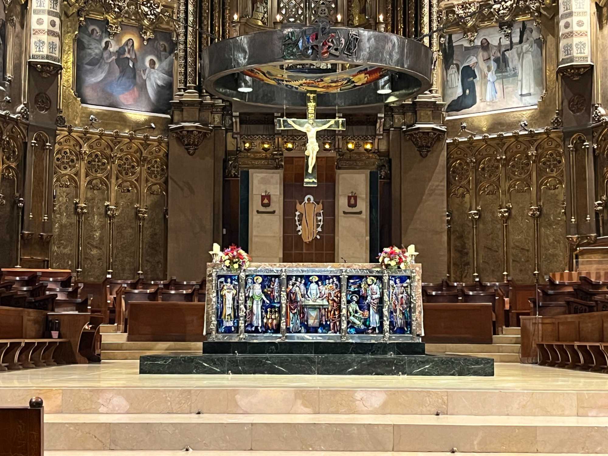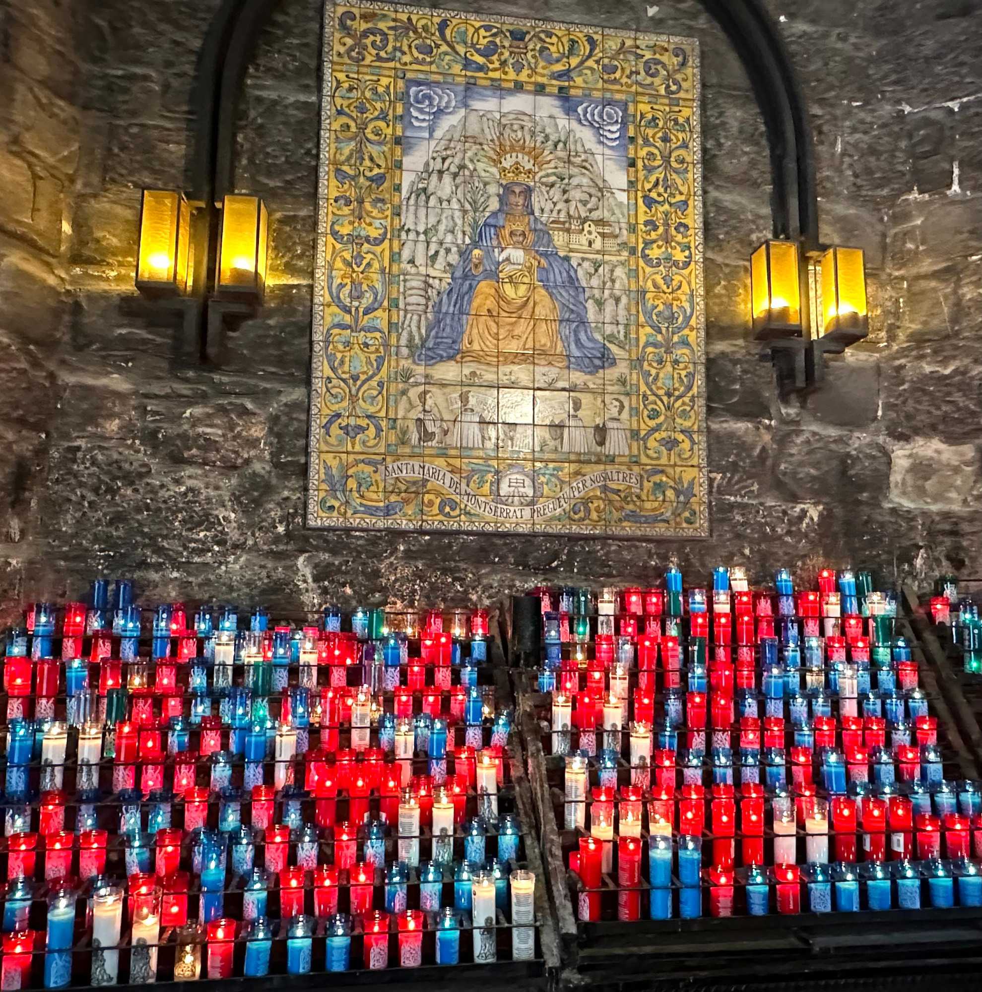 La vierge Marie, de couleur sombre, a été taillée en bois à la fin du XIIe siècle. Sa décoloration noire lui vaut le nom de Vierge Noire ou la Vierge de Montserrat. Le sanctuaire est un haut lieu du tourisme international, la deuxième destination la plus visitée en Espagne. L’abbaye fut inaugurée en 1592, la vierge y trône sur un socle en argent et l’autel est fait d’un bloc de pierre de huit tonnes. Il y avait beaucoup de monde, une messe était célébrée à l’intérieur à laquelle assistaient 2 000 personnes.