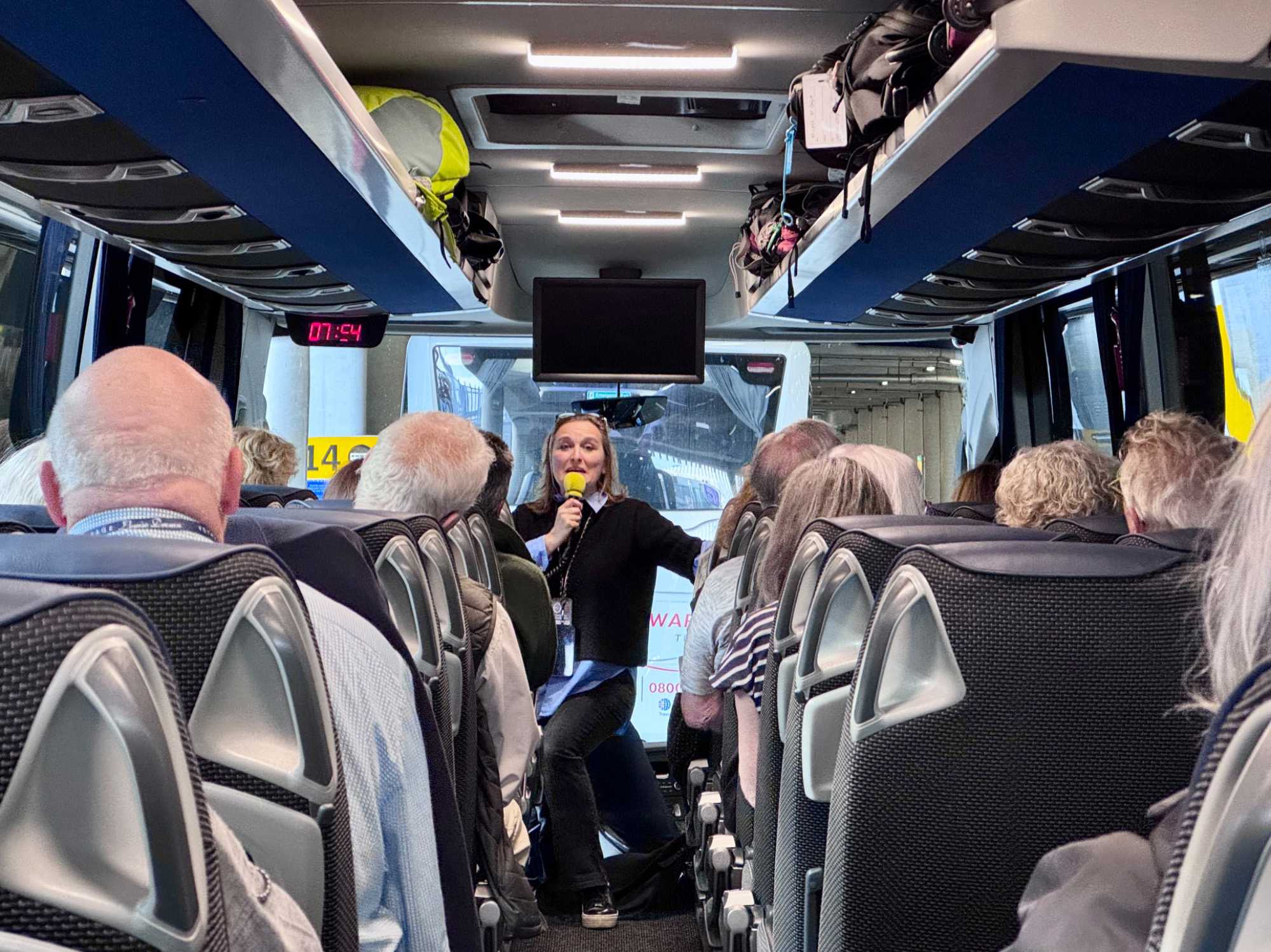 Dès notre descente d’avion, nous procédons aux formalités douanières lesquelles se font très rapidement par le biais d’un lecteur électronique du passeport. Nous récupérons nos valises et c’est avec empressement que nous rencontrons Sandrine, notre sympathique guide en Angleterre. Nous connaissons Sandrine puisqu’elle a déjà été guide pour un de nos groupes et nous sommes très contents de la revoir.