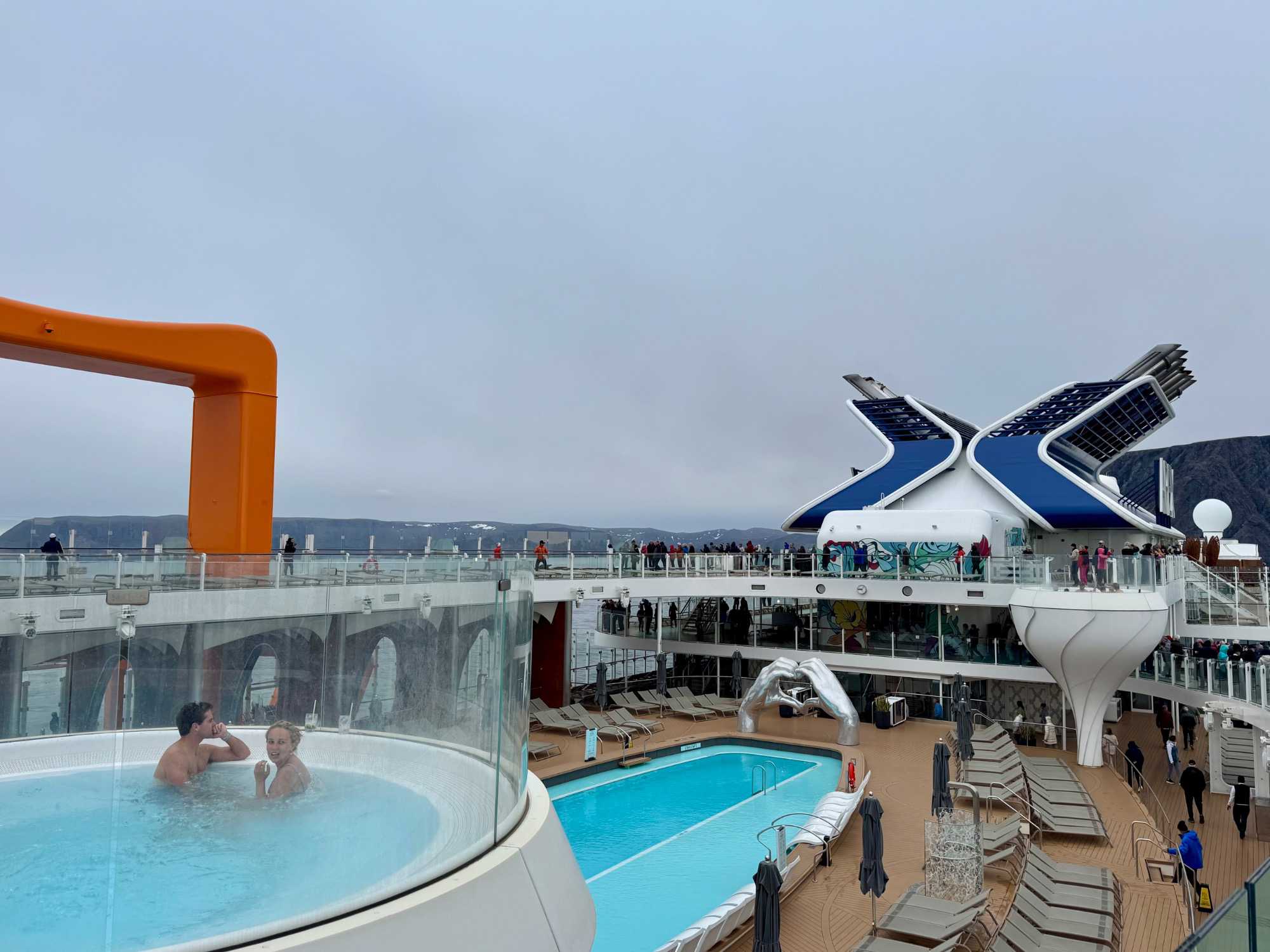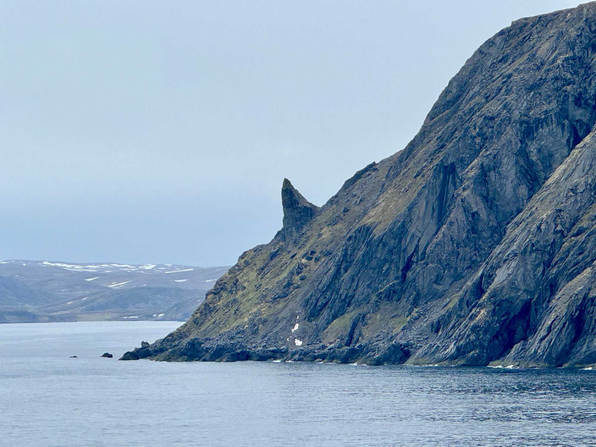 Le navire lève les amarres et nous voilà à nouveau parti. Le capitaine nous convie sur la passerelle au ponts 15 et 16 pour une navigation panoramique avec un arrêt devant le rocher de la « corne du rhinocéros » et aussi du rocher du Cap Nord. Nous distinguons parfaitement le monument du globe terrestre et le bâtiment de service avec sa boule blanche du radar météo sur le toit. Ensuite, le capitaine entreprend le retour vers le sud de la Norvège.