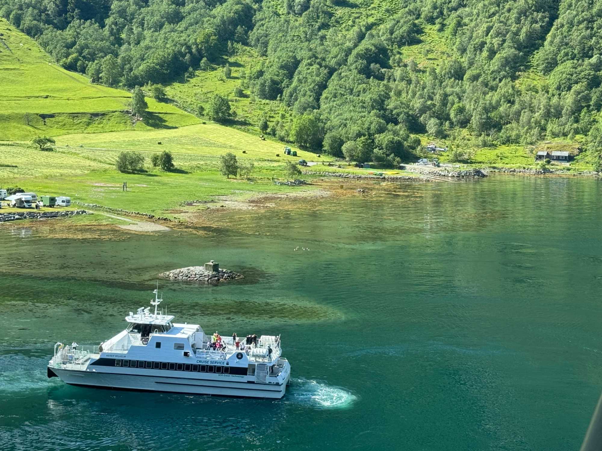Il fait très beau pour notre grand bonheur. Notre excursion est prévue en après-midi pour nous amener tout en haut de la montagne afin d’y admirer le fjord du haut de sa falaise. Le soleil est vraiment fort, nous sommes prêts à 14h45 pour notre départ d’excursion. Nous sommes contents car ici, nous voulons des photos ensoleillées comme souvenir de cet incroyable endroit. Le Geirangerfjord et ses environs sont uniques et exceptionnellement beaux.