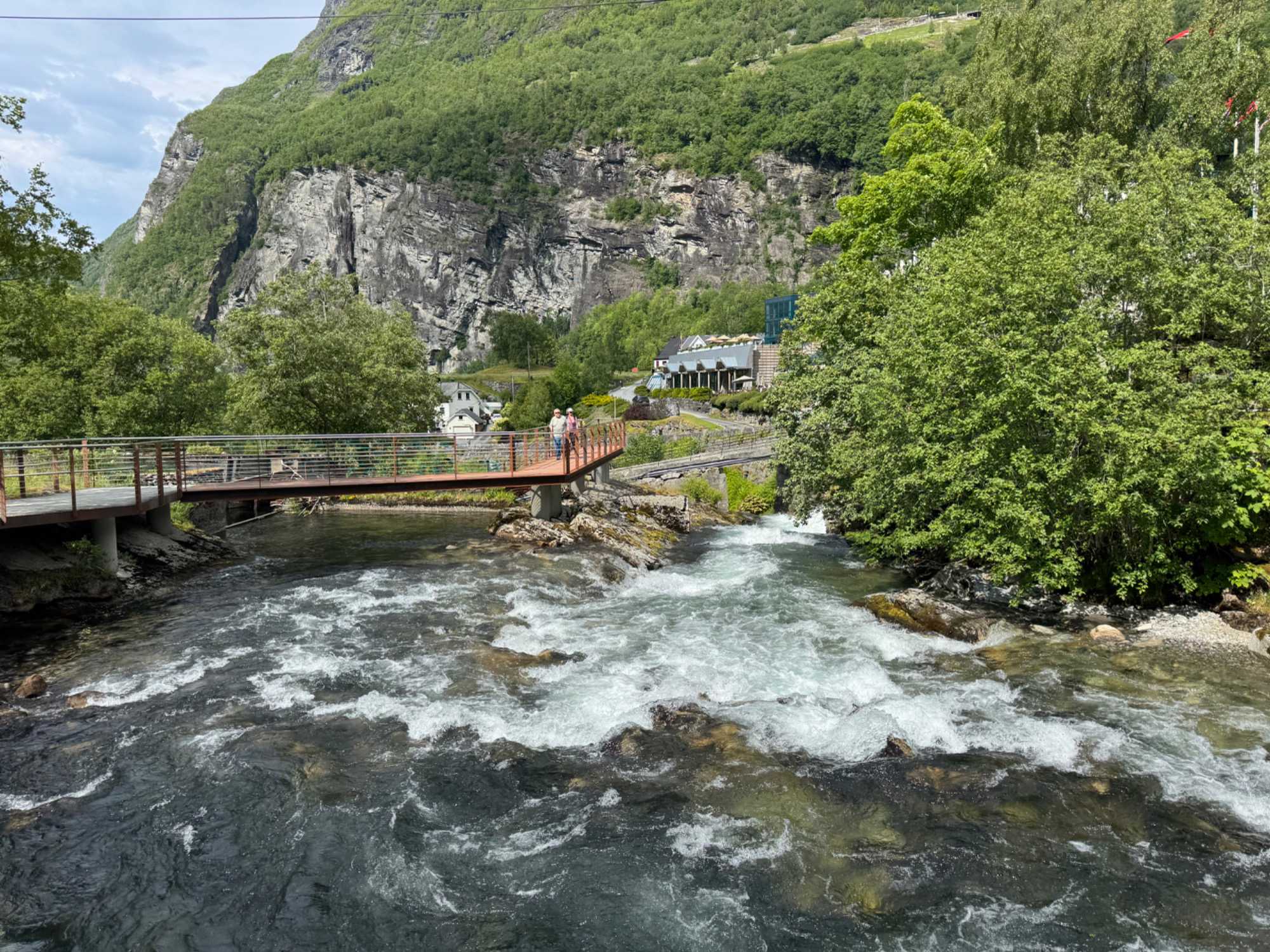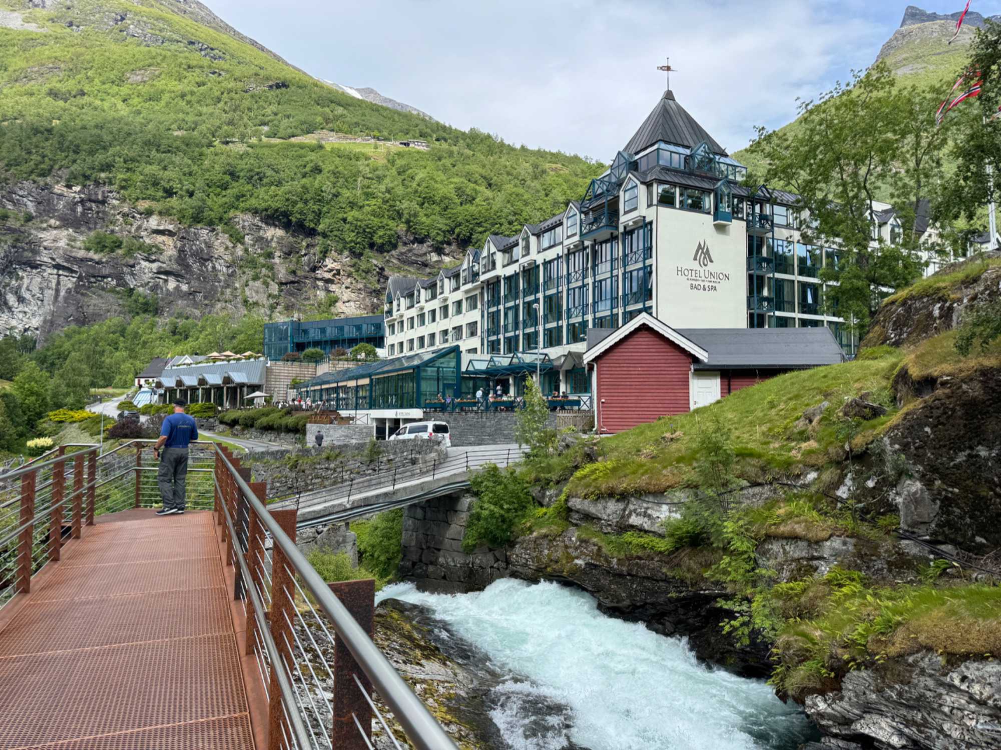Le fjord est l’une des principales attractions touristiques du pays, car il est accessible par les gros paquebots de croisière. L’eau émeraude du Geirangerfjord est entourée de majestueuses montagnes aux sommets enneigés, où des cascades vives traversent une végétation abondante. Rien d’étonnant que l’UNESCO l’ait classé sur sa liste du patrimoine mondial. De puissantes cascades, dont les célèbres chutes d’eau De Syv Søstrene (les septs soeurs), Friaren (le prétendant) et Brudesløret (le voile de la mariée) - descendent des parois rocheuses en ligne droite, dans un tourbillon de brume inlassable, qui, jumelé à la lumière du jour, forme des arcs-en-ciel, créant splendeur et émerveillement. L’incroyable relief naturel de la région s’est formé au cours des différentes périodes glaciaires, quand les glaciers ont creusé la roche jusqu’à la mer pour former les fjords. Aujourd’hui, le Geirangerfjord figure sur la plupart des « listes des endroits les plus spectaculaires au monde ». Notre navigation dure toute l’avant-midi et c’est à 11h00 que nous accostons au quai de Geiranger.