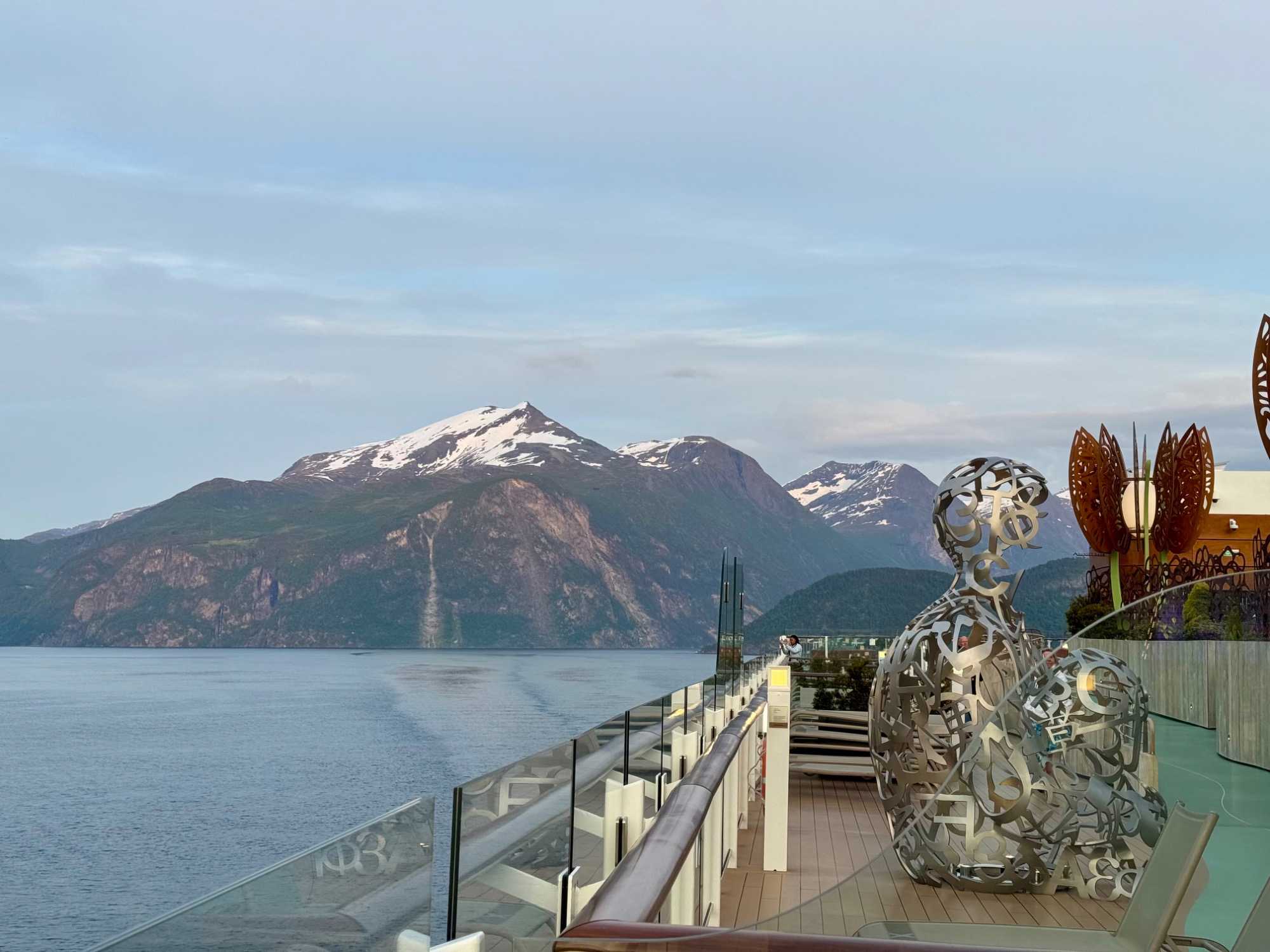 Le navire quitte ce site exceptionnel à 20h00 et refait la visite des fjords de ce matin, en sens inverse ! Nous avons pu profiter à nouveau, avec la lumière tamisée du soleil, de ces beautés naturelles dont le Geirangerfjord est pourvu. Nous naviguons près des hautes parois rocheuses presque verticales d’où se jettent des chutes d’eau spectaculaires. Nous avons pu admirer, une fois de plus, la chute d’eau des sept soeurs.