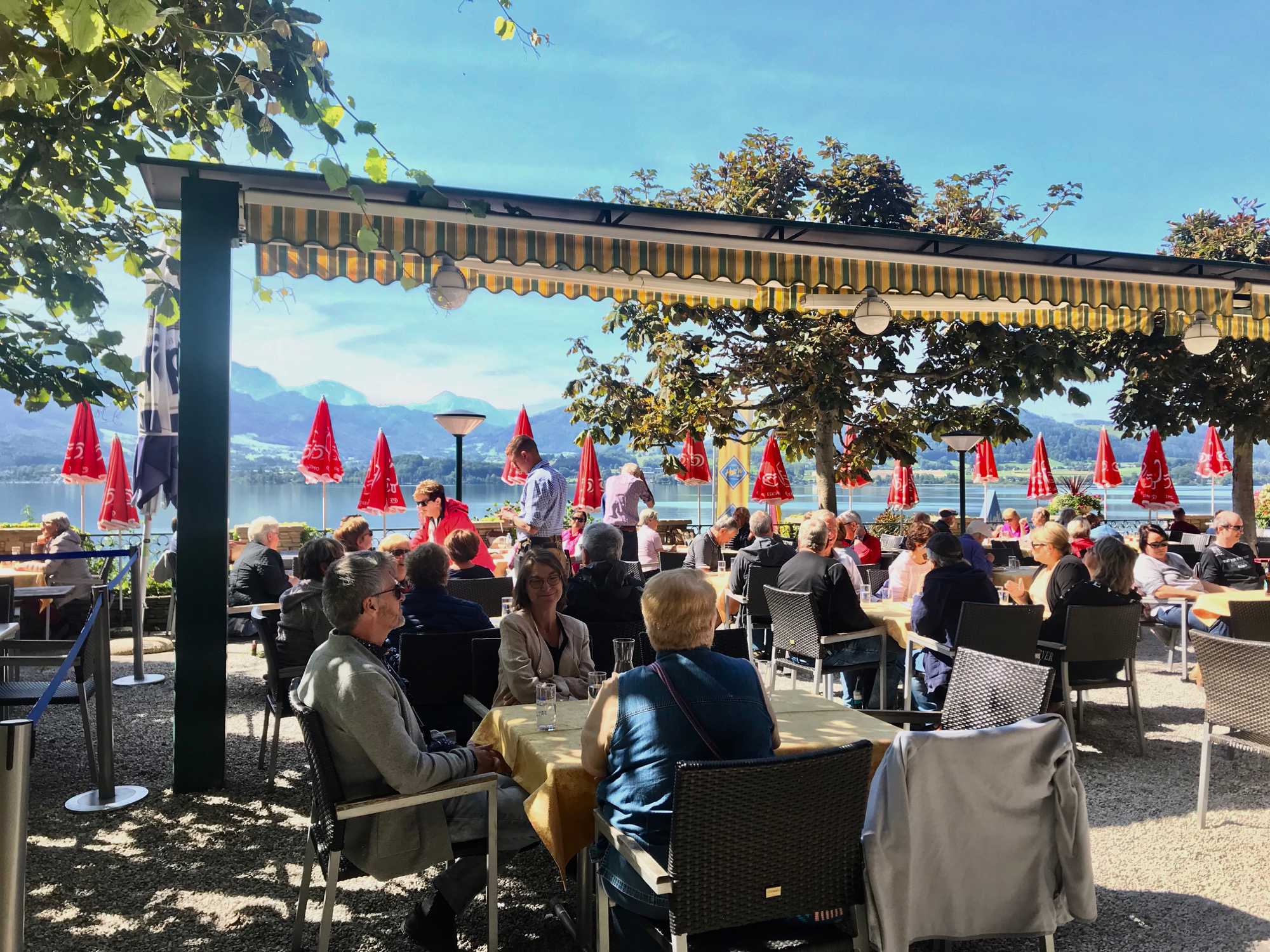 Nous arrivons à Gmunden, au bord du lac Traunstein, pour l’heure du lunch. Ça adonne bien car nous avons une réservation pour notre groupe au très beau restaurant Hoisn Wirt super bien situé sur les rives du lac. Wow, wow, wow (comme disait Renée!), quel magnifique endroit sur le bord du lac Traunstein. On mange (encore!) avec un verre de vin ou de bière pour accompagner le tout. Une belle chimie s’est développée dans ce groupe et nous avons bien du plaisir à chaque instant. Que c’est « plaisant » un voyage de groupe avec de belles personnes! On nous a installé sur la terrasse et nous en profitons bien. La température est même plus chaude que ce à quoi on s’attendait. Il a sûrement fait 22-23 degrés.