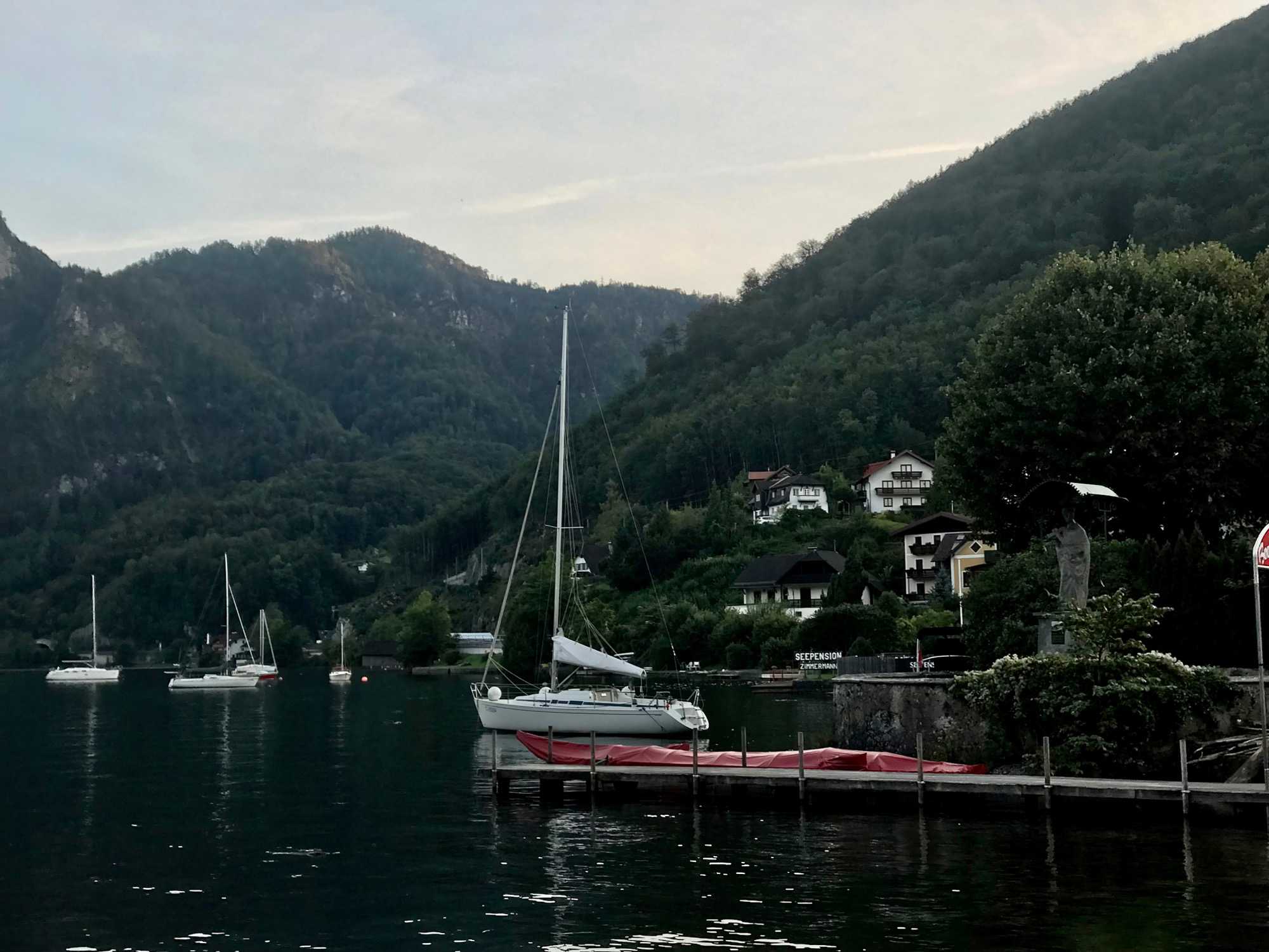 Par la suite, nous profitons d’un peu de temps libre dans cette très jolie ville qu’est Gmunden. C’est une ancienne ville de cure avec un emplacement unique au bord du lac. De nos jours, la ville est célèbre pour sa céramique. Son motif le plus emblématique est la « Grüngeflammtes », c’est-à-dire de petits cercles sur fond blanc. Ce sont eux qui ont fait de la faïence de Gmunden une marque dans tout l’Empire austro-hongrois. Depuis, la production de céramique fait partie du paysage de Gmunden et rares sont les foyers autrichiens qui n’en possèdent pas au moins un service. Eva nous fait faire une petite promenade en ville et puis c’est le temps de nous installer à notre hôtel 4*, le Symposion Hotel Post Traunkirchen, pour les cinq prochaines nuits. Pas d’autre transport de bagage à faire, youppi! L’hôtel offre une vue directe sur le lac de Traunstein, situé à seulement 50 mètres. Quel merveilleux décor! L’hôtel est d’un genre familial et très sympathique. On est loin des grandes chaînes d’hôtel. Tout le monde est bien installé.