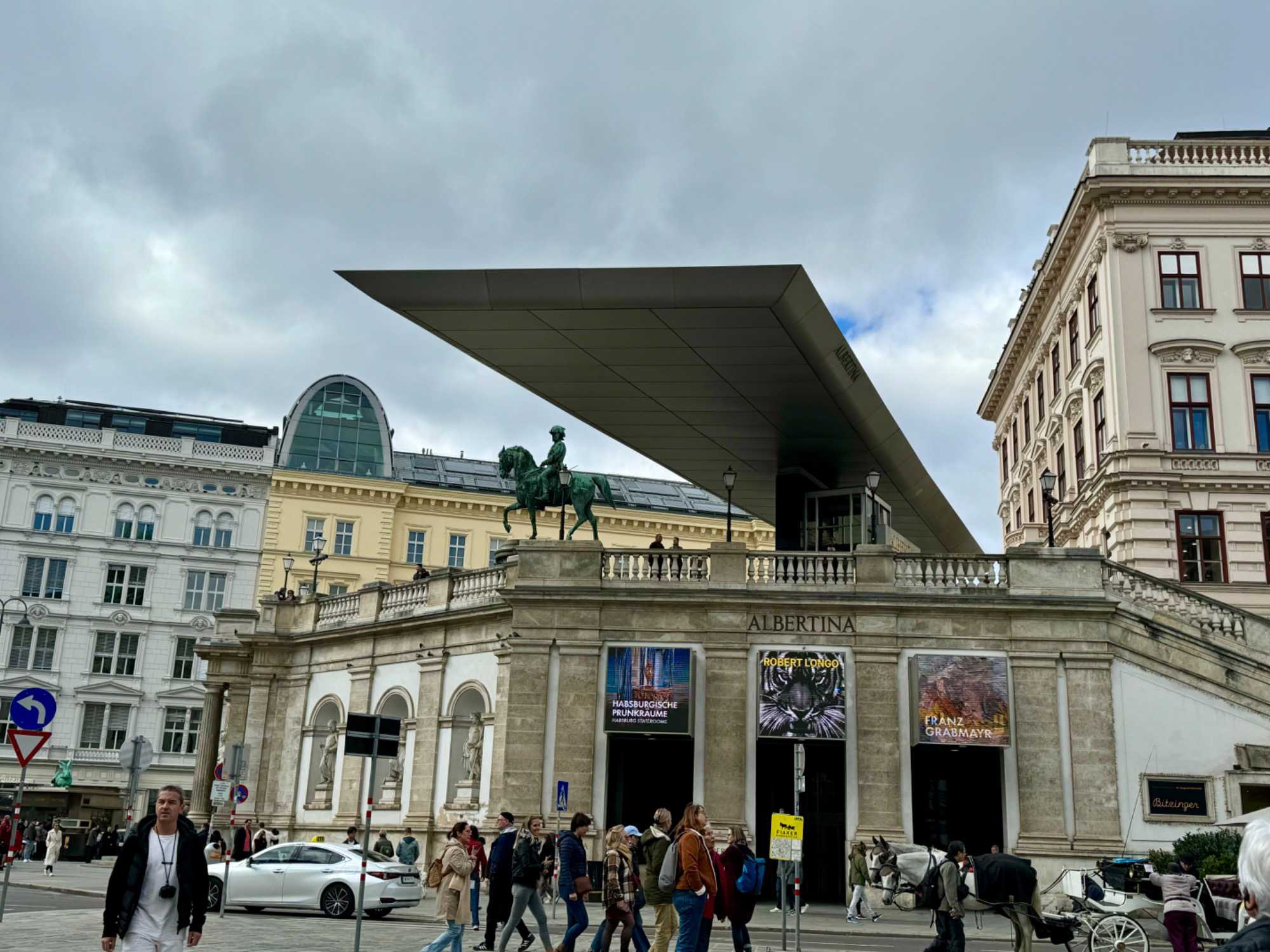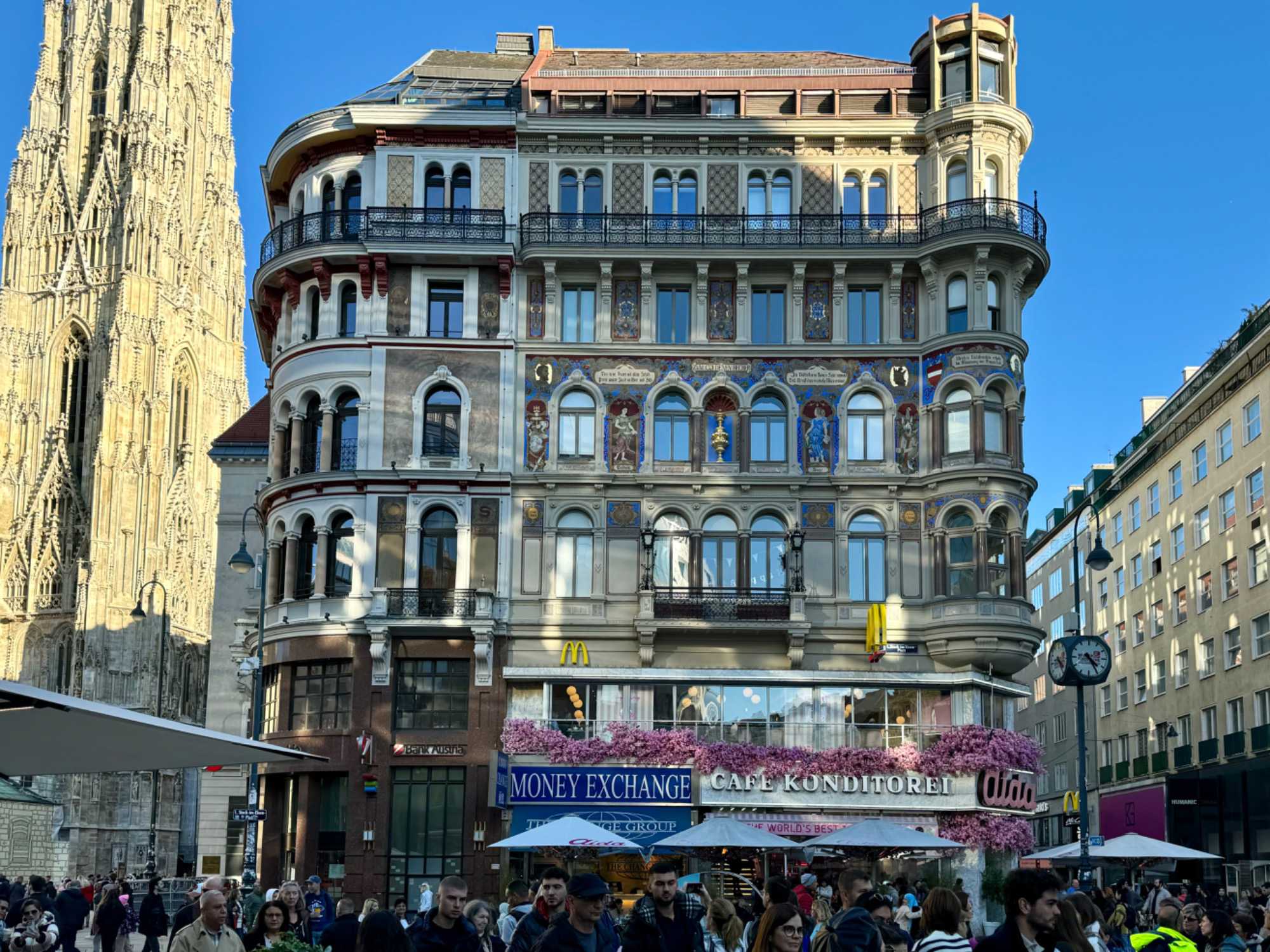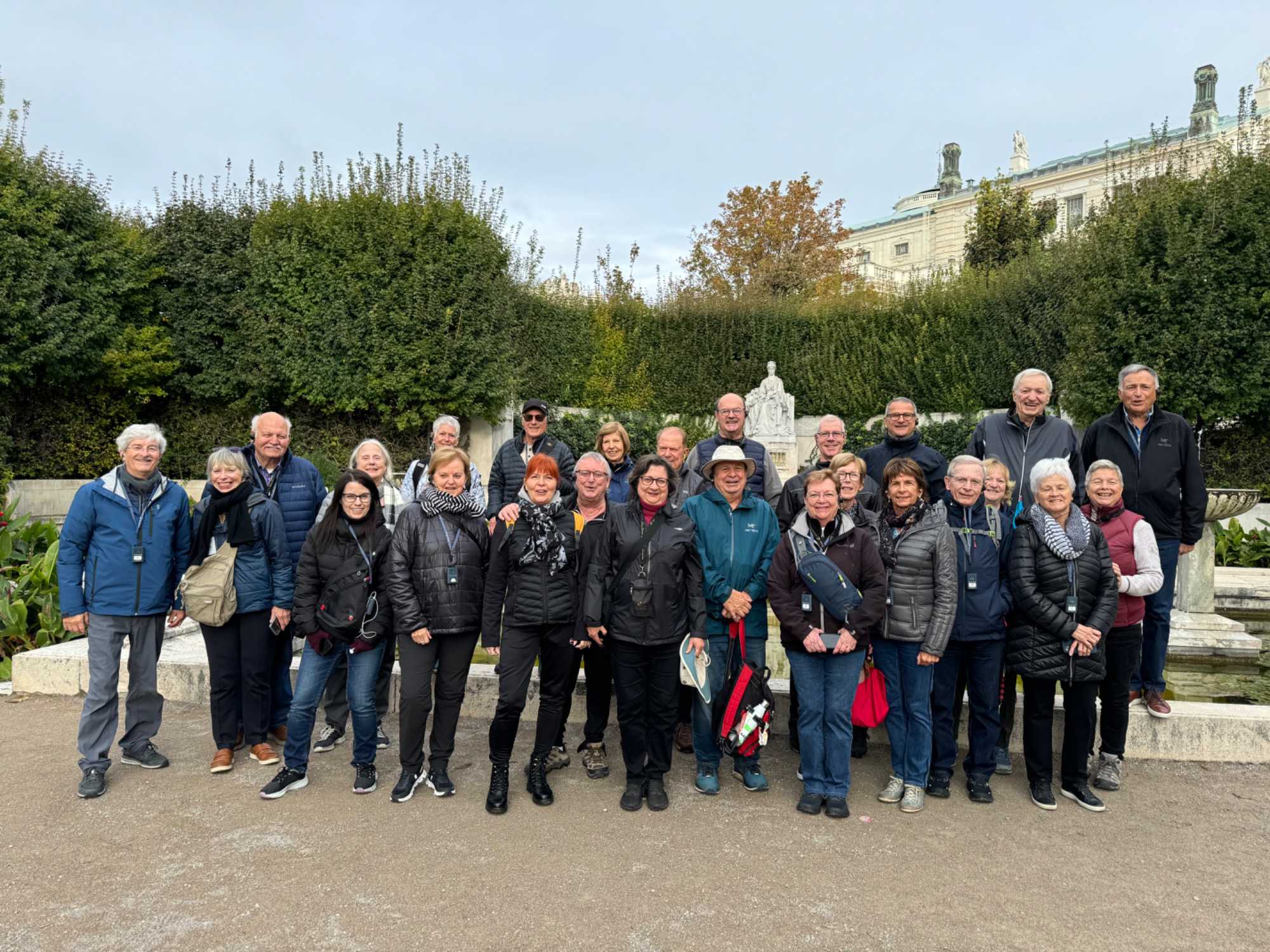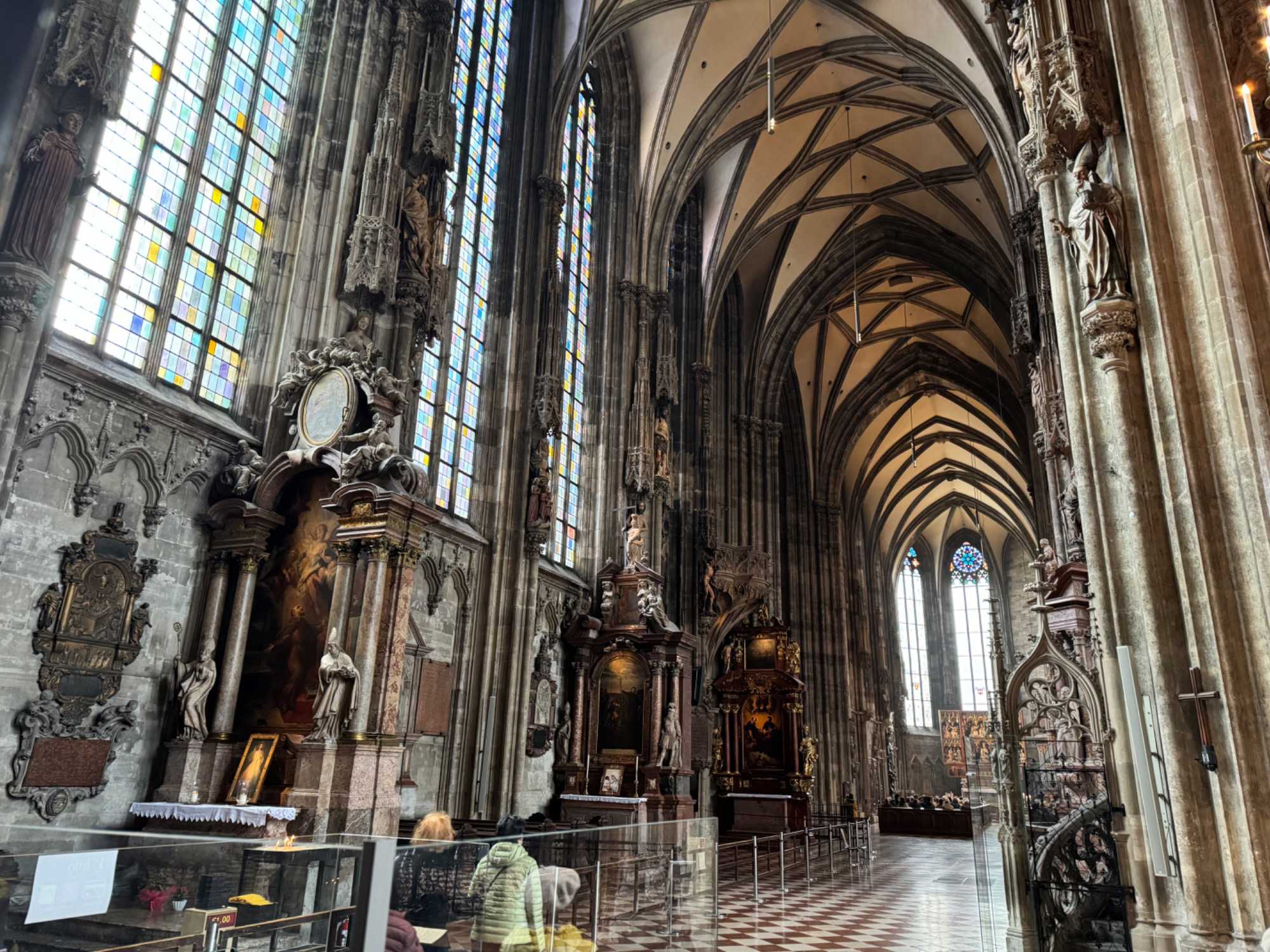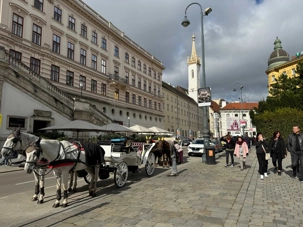 Une fois notre tour Panoramique de la ville terminé, nous débarquons de notre autobus pour découvrir plusieurs incontournables de cette belle ville. Nous débutons notre visite au jardin Volksgarten, un jardin à l’anglaise aménagé par Ludwig Remy en 1821. Son nom signifie le Jardin du Peuple. À l’extrémité Nord du parc se trouve le monument de l’impératrice Elisabeth assise. Il a été inauguré le 4 juin 1907. Doris nous fait bien rire avec ses anecdotes sur Elisabeth qui a vécu une vie très dynamique, romantique et dramatique. Puis, nous allons voir l’extérieur du complexe du Palais impérial Hofburg, la résidence d’hiver de la famille de l’empereur François-Joseph et de l’impératrice Élisabeth, dite Sissi. Ensuite, nous passons voir les écuries de l’école espagnole d’équitation avec ses chevaux lipizzans. C’est une école d’équitation de style baroque du palais impérial construit sous Charles VI, la seule institution au monde à continuer la pratique de l’équitation classique, dans la tradition de la Renaissance de la Haute École depuis plus de 450 ans. Nous empruntons la fameuse avenue Ringstrass, le Ring, qui mesure 5,3 kilomètres de longueur. Sur cette avenue circulaire se trouve le Palais impérial, l’Opéra national de Vienne, le parlement, l’Hôtel de Ville, le Burgtheater, l’Université, le Musée d’Histoire naturelle et plusieurs autres tout aussi intéressant. Nous marchons vers la magnifique cathédrale Saint-Étienne pour la visiter. Cette cathédrale est l’emblème de Vienne et le coeur du centre-ville. Culminant à 136 mètres, c’est la plus haute église gothique d’Autriche. Elle est le symbole de la reconstruction de la République après la Seconde Guerre mondiale. Sa construction s’échelonne du XII ème siècle au XVI ème siècle. Sur le toit se trouve une mosaïque d’un aigle à deux têtes, l’emblème incontournable du royaume des Habsbourg.