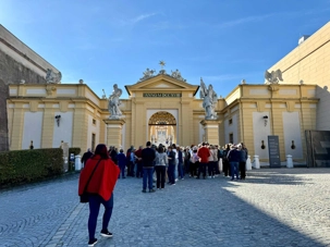 Nous pénétrons dans le complexe du château en passant entre deux imposants bastions à la forme arrondie dont le premier a été construit en 1650 pour servir de fortification. Nous passons le porche d’entrée menant dans la cour intérieure, à la fois élégante et majestueuse. La fontaine quant à elle a été crée au XVIIIe siècle et installée à cet endroit au XIXe siècle. Une fois а l’intérieur du bâtiment, nous empruntons l’escalier des empereurs. Elle conduit à l’aile d’apparat de l’abbaye et aux appartements impériaux.