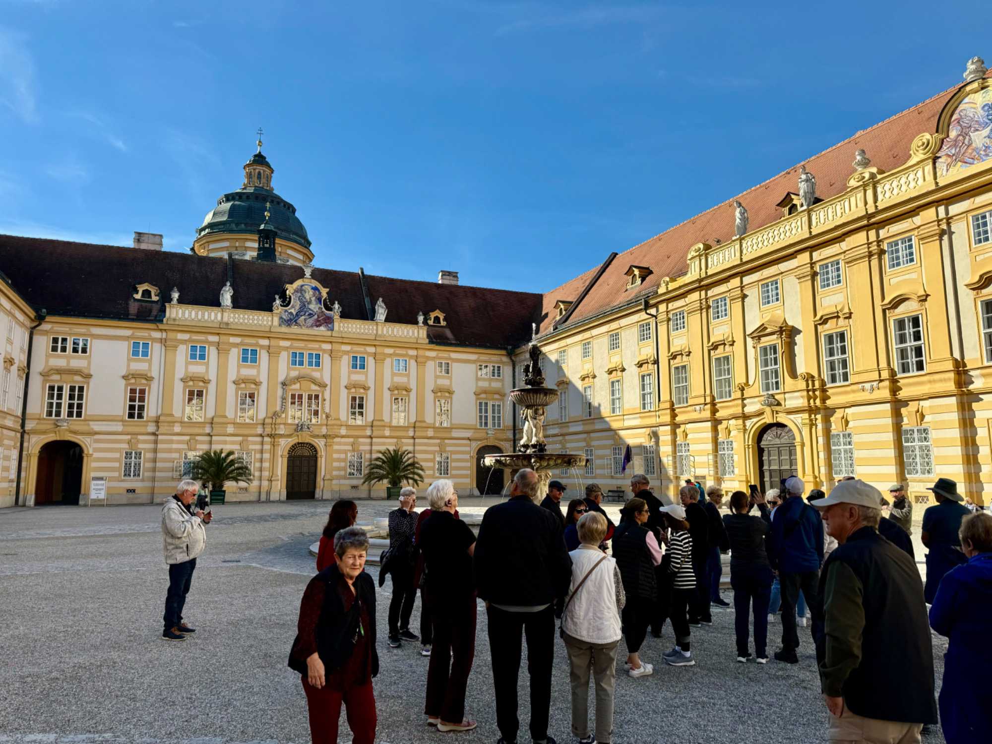 Rendus à Melk, ville de la Basse-Autriche, nous descendons du navire pour faire la visite guidée de la célèbre Abbaye bénédictine de Melk. Située dans la superbe région de la Wachau, l’Abbaye surplombe la ville de Melk et le Danube. Bien qu’elle ait été fondée en 1089, ses bâtiments datent de l’époque baroque. L’abbaye accueille depuis plus de 900 ans des moines bénédictins de tous horizons. Ils y laissèrent nombre d’écrits sur des domaines très variés.