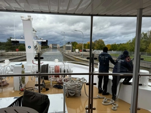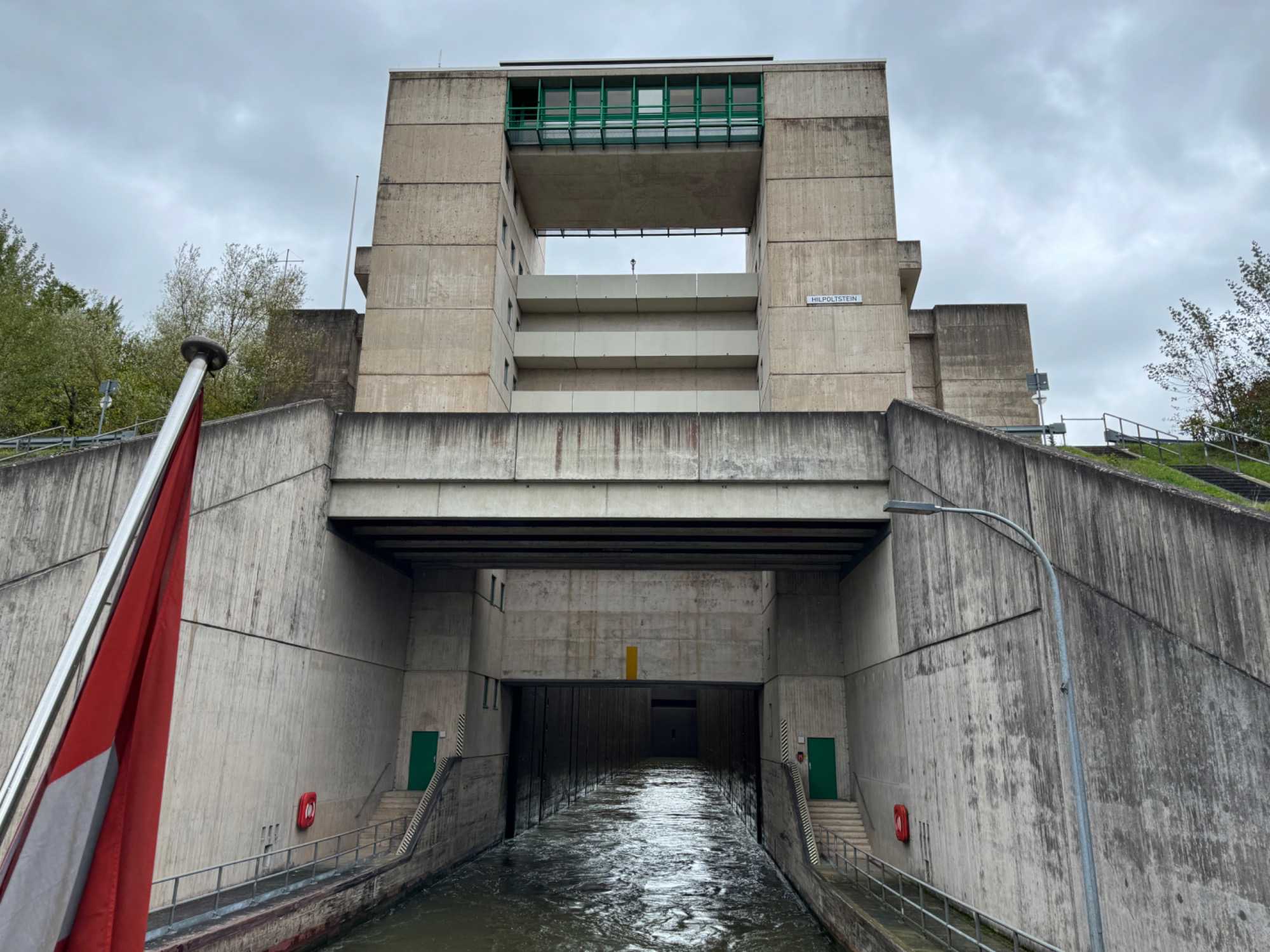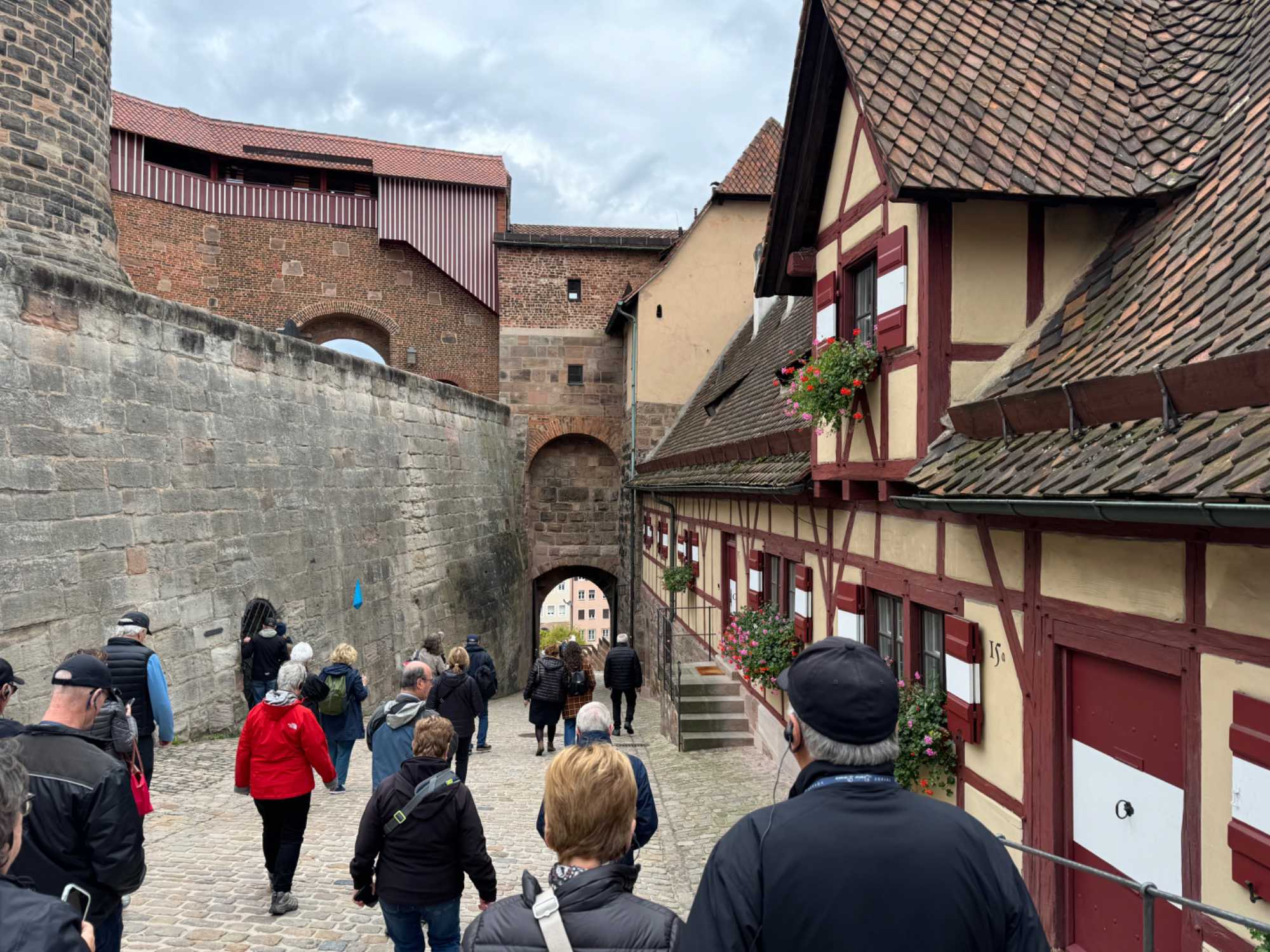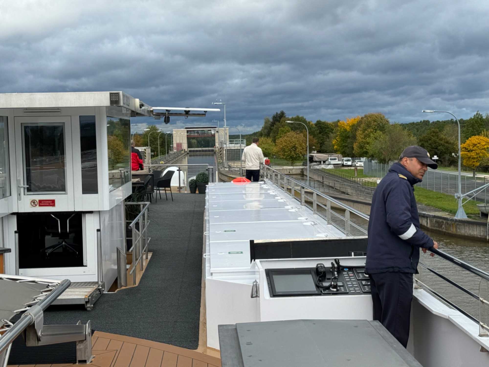 Ce matin la température est plutôt fraîche. La météo nous annonce 15 degrés Celsius avec du soleil et des nuages, ce sera parfait pour notre visite de Nuremberg. Nous avons navigué toute la nuit. La grande surprise est pendant le déjeuner alors que nous passons dans la plus profonde écluse de tout le voyage; 24,7 m de profondeur. Nous avons bien vu les murs de l’écluse envelopper le navire et la lumière extérieure devenir éclipsée par les murs de béton, mais on ne s’attendait pas à aller aussi profondément à l’intérieur de l’écluse. Finalement, pour sortir de cette immense écluse, une lourde porte de 126 tonnes se lève pour nous laisser passer en dessous. Nous venions de passer dans l’écluse Hilpoltstein, la première de trois immenses écluses de 24,7 m de profondeur.