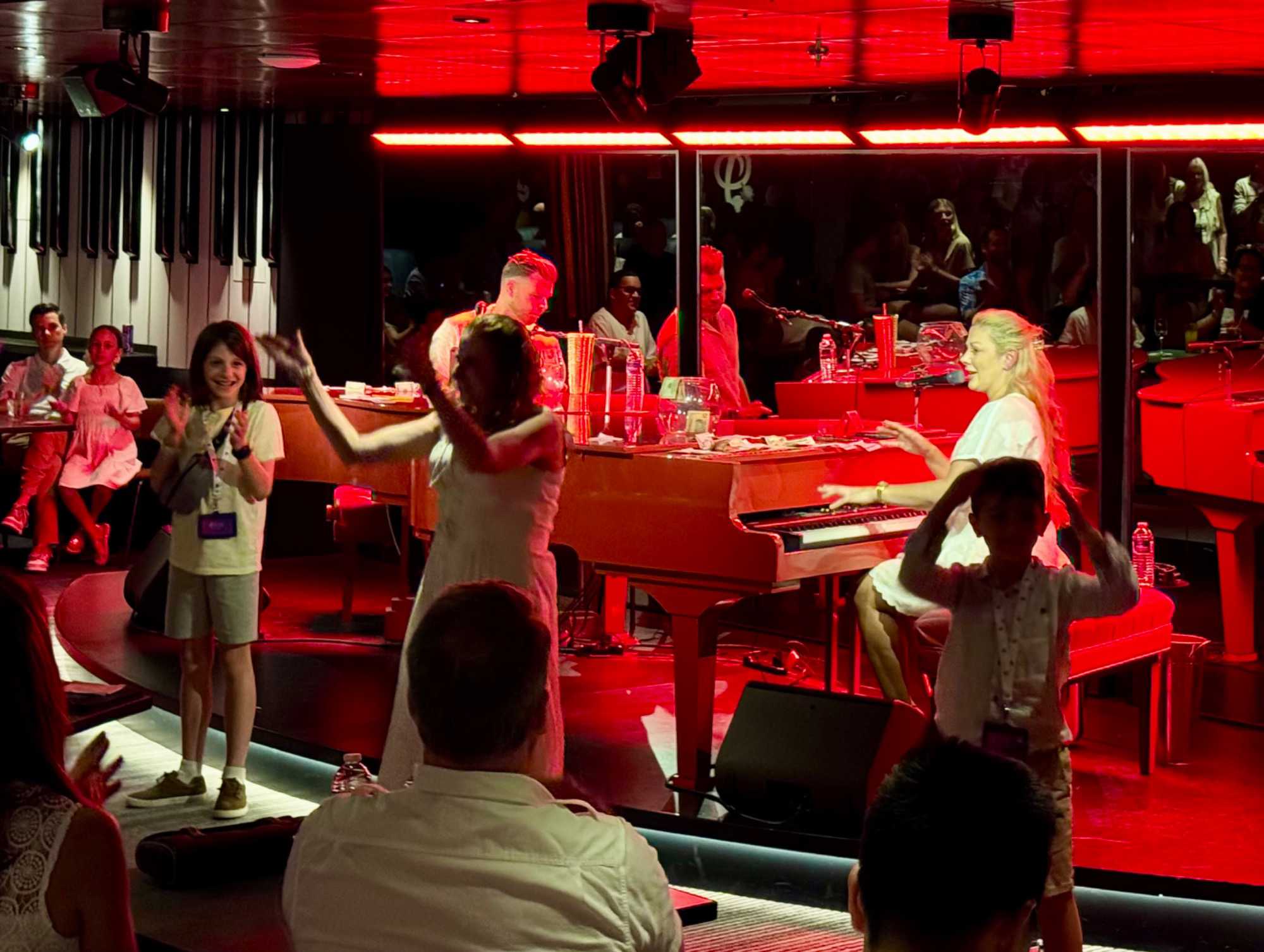 Au programme ce soir, soirée en blanc, spectacle de l’orchestre du Icon ; les 16 musiciens de la prestation du Magicien d’Oz, cordes, cuivres, basse, drum, guitare électrique récidivent pour nous offrir des version des grands airs populaires. Ils sont réglés au quart de tour. Là ne s’achève pas la soirée, nous suggérons fortement d’assister à la parade du soir. Il ne fallait pas manquer ça ! La Promenade Royale envahie par une centaine de personnages tous vêtus de costumes de pirates, corsaires, marins, majorettes, des répliques de galères, galions et bateaux vikings, ont défilé sous la criée du général juché sur son perron. Ils nous ont grandement divertis! On ne s’ennuie vraiment pas sur le Icon of the Seas et c’est le cas de le dire, la croisière s’amuse ! Nous prenons plusieurs photos pour vous partager ce magnifique spectacle !