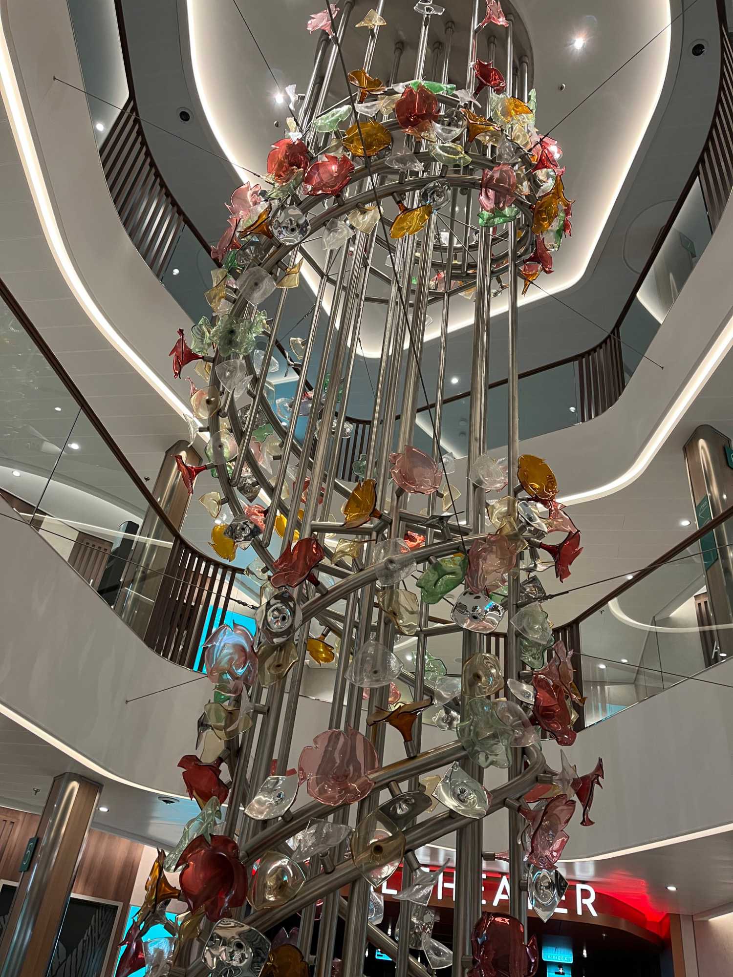 Ce matin, j’ai eu le bonheur de rédiger ce récit d’hier à l’Aquadôme, dans le calme et la tranquillité de ce sanctuaire de beauté. Situé à l’avant du Icon, un dôme de verre dont la structure est composée de centaines de triangles de verre enveloppe littéralement la largeur du navire. Il mesure environ 16 mètres de hauteur et s'étend sur plus de 10 000 mètres carrés. On a joué de grande créativité pour l’aménagement de l’espace détente. On y retrouve l’Overlook bar, le Rye and Bean bar, le chic restaurant de spécialité Hooked et l’Aquadôme Market pour une offre culinaire variée, amateurs de crêpes et de macncheese, c’est par ici. Le chef d’oeuvre de cet espace est bien sûr le bassin l’amphithéâtre aquatique dédiées au spectaculaire spectacle Aqua Action auquel nous aurons le plaisir jeudi soir, grâce à Voyage Louise Drouin qui a déjà réservé nos places. Merci à Stéphanie d’avoir fait ça pour nous !