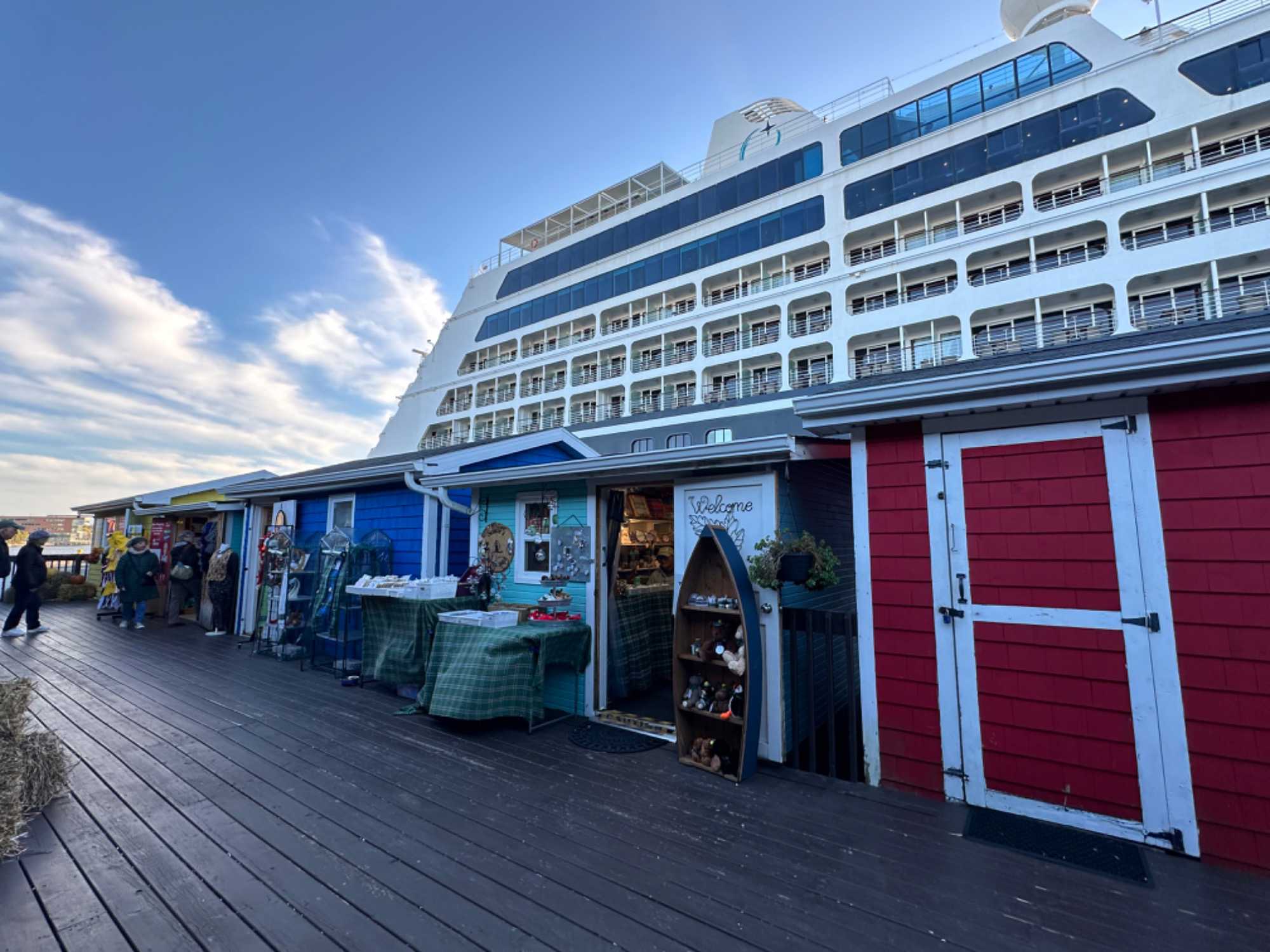 Quelle superbe croisière nous réalisons tous ensemble sur notre beau navire d’Azamara! Une superbe chimie de groupe s’est installée parmi mes voyageurs et nous partageons de très agréables moments tous ensemble. Mes voyageurs qui ne sont pas compliqués du tout me rendent la vie bien facile et ils s’adaptent à tout sans aucun problème. Merci à tous! Nous naviguons aujourd’hui vers l’île du Cap Breton pour arriver dans la petite ville de Sydney. La température est parfaite et nous pouvons profiter de marcher sur les ponts. Bien entendu, nous devons bien nous couvrir car le vent de la mer à cette période est assez frais pour ne pas dire froid. Mais bien habillés plusieurs voyageurs marchent sur le pont supérieur en respirant le bon air marin à plein poumons. Nous arriverons en après-midi dans la ville de Sydney en Nouvelle-Écosse. C’est une ville portuaire de Nouvelle-Ecosse, située sur l’île du Cap-Breton. La ville est connue pour une monumentale sculpture, représentant un violon et son archer, édifiée pour honorer la musique celtique traditionnelle qui colle à la ville. Comme la fête de l’Halloween approche ils ont même ajouté un squelette qui est assez impressionnant. Les habitants sont tellement sympathiques à Sydney et ceux qui nous accueillent au port et dans les magasins aménagés dans le terminal de croisière sont souriants et vraiment gentils. C’est toujours un plaisir pour moi de faire un arrêt à Sydney qui est une charmante ville toute tranquille mais avec beaucoup de charmes. Comme nous arrivons à 16 h 00 sous un beau soleil, quelques voyageurs en profitent pour aller faire quelques pas à l’extérieur et visiter les kiosques où les artisans nous attendent avec leurs produits locaux. Et oui, j’ai réussi à faire quelques achats, une des dames exposait ses bijoux faits à partir de SeaShell qui étaient très originaux.