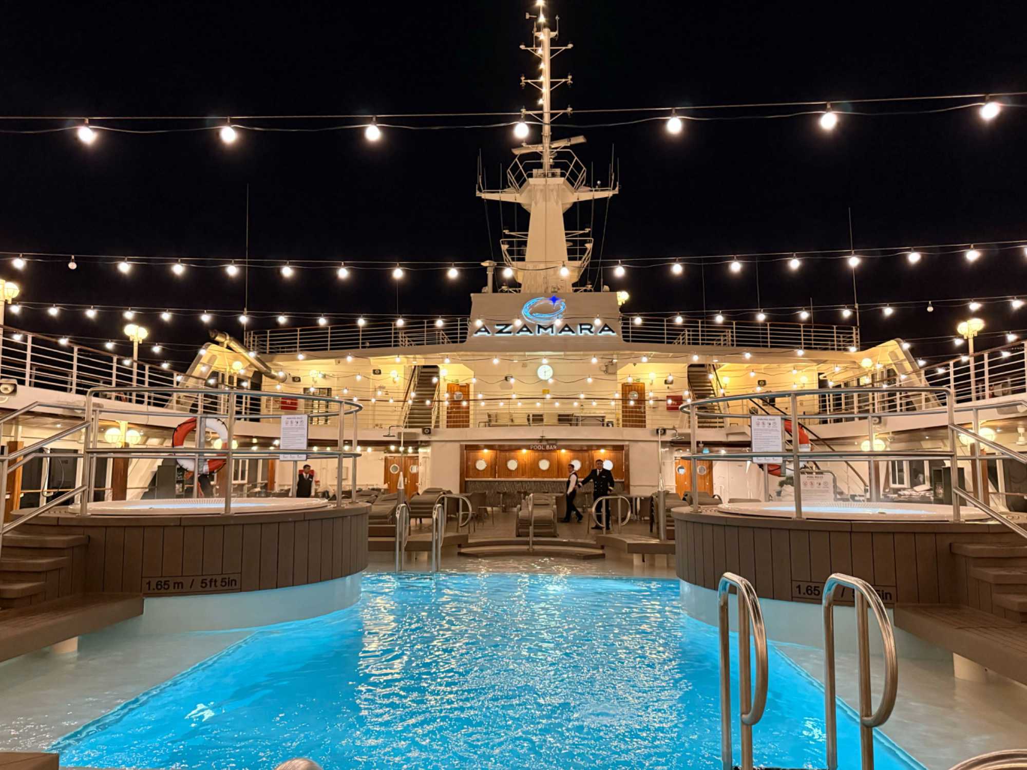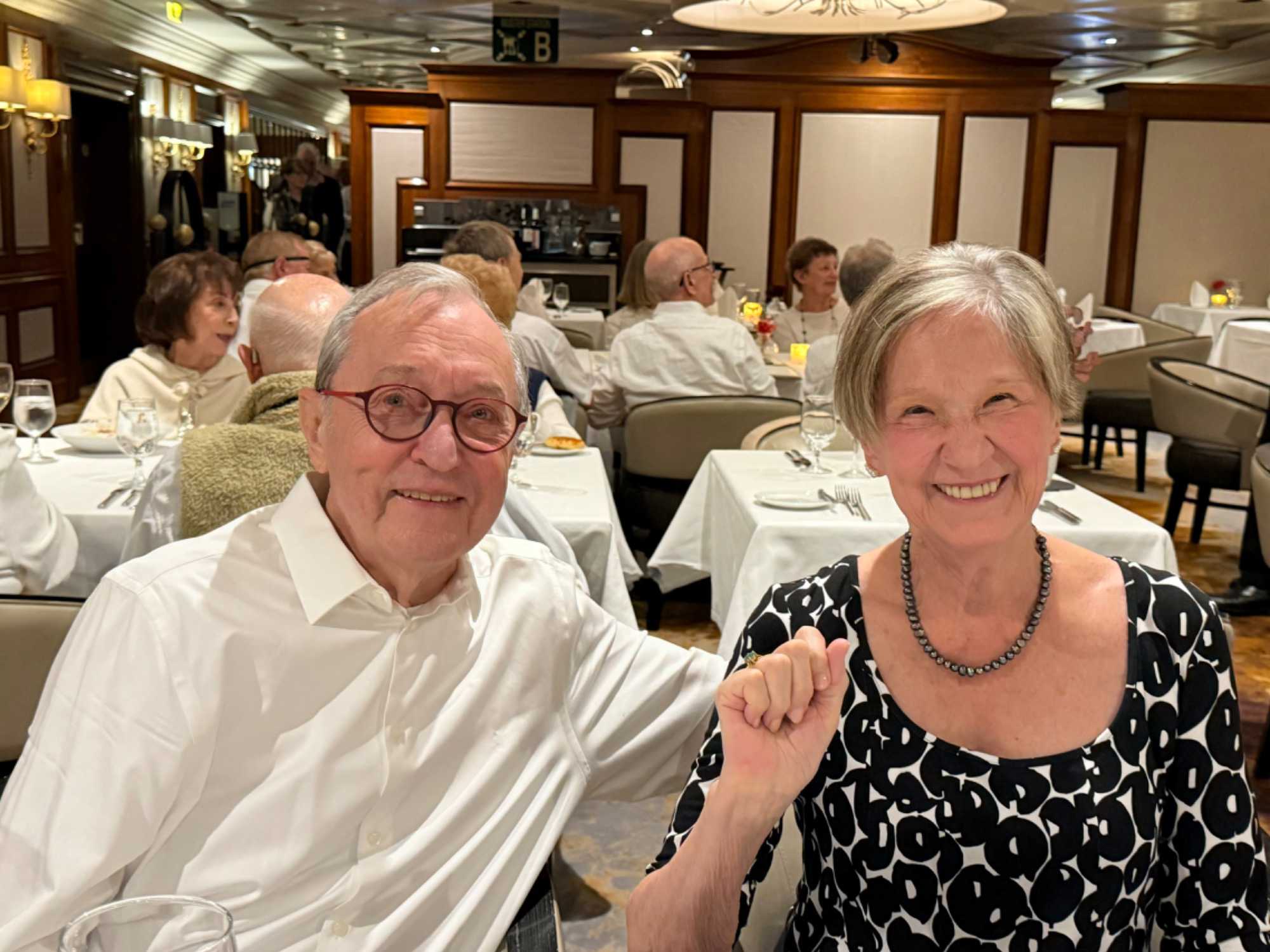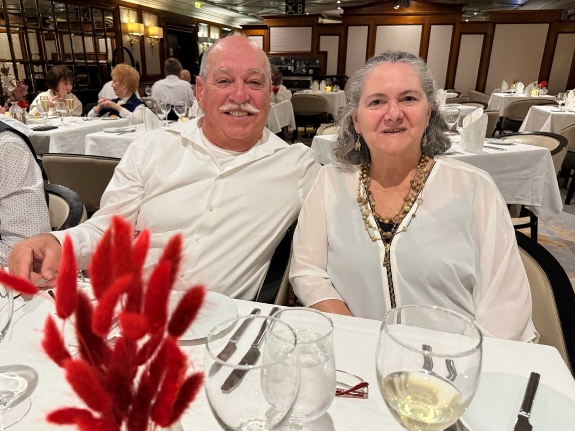 Si vous commencez par les photos vous verrez notre souper hier soir qui était notre soirée en blanc. C’était vraiment amusant de voir que la majorité des voyageurs embarquent et porte un vêtement blanc ou noir et blanc. Mon groupe n’y a pas échappé et nous nous sommes bien amusés. Le souper pouvait se prendre au buffet et Lek a fait de superbes photos qui vous donneront envie de venir nous rejoindre. Nous pouvions aussi manger à la salle à manger comme à notre habitude. Après le souper nous étions invités au party en blanc avec les musiciens et les danseurs qui nous ont fait un très joli spectacle et tous pouvaient aller danser. À l’arrière du théâtre le chef cuisinait sur place un dessert très appétissant que l’on appelle crêpe suzette. Délicieuses ces petites crêpes!