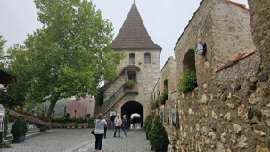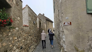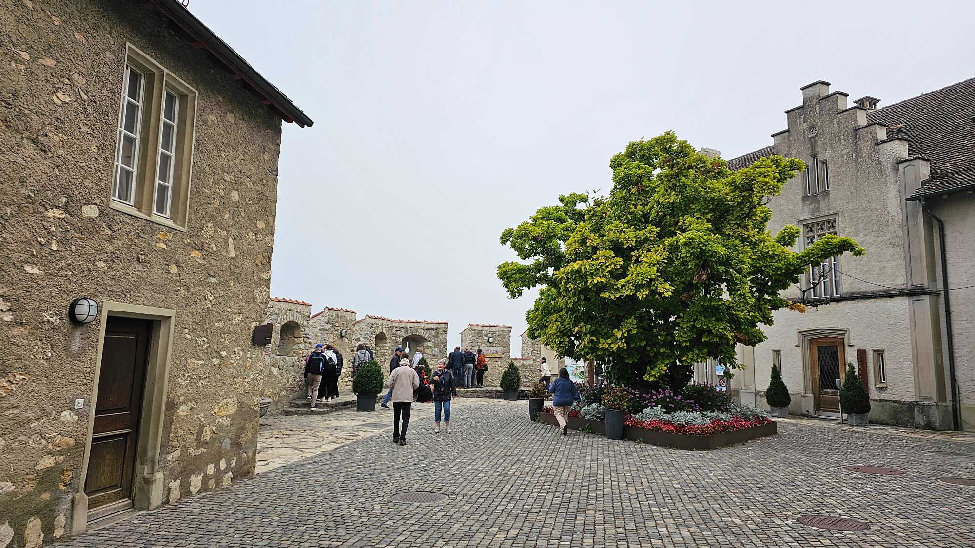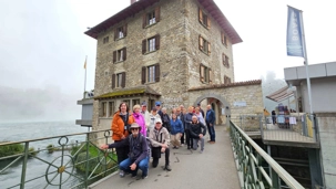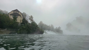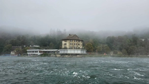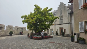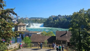 Malgré la fatigue du vol, tous étaient de bien belle humeur pour débuter ce beau voyage. Nous quittons l’aéroport de Zurich pour nous diriger vers notre première attraction, les chutes du Rhin près du village Schafflehouse. un endroit magnifique en Suisse, celui des Chutes du Rhin. Le Rhin est constitué de divers affluents issus des alpes suisses. Il constitue le lac de Untersee un peu en amont de Schafflehouse et donne naissance â ces chutes impressionnantes. C’est un endroit à ne pas manquer lorsque nous sommes à proximité, car c’est la deuxième chute avec le plus grand débit d’eau d’Europe. Sur une largeur de 150 m, 700 000 litres d'eau plongent orageusement sur une falaise d’une hauteur de 23 m chaque seconde. Le spectacle aurait été extraordinaire n’eut été d’une surprise de dame nature qui nous attendait, dès notre arrivée en Suisse, avec un épais brouillard qui a duré tout l’avant-midi…. On a bien ri de la situation, on a eu des brides de vision des chutes mais qu'à cela ne tienne, ça fait partie des impondérables de la vie... nous avons pu voir le ‘Schloss Lauren’, chateau qui surplombe la falaise d’une rive des chutes. Le son était impressionnant! On a pu cependant apprécier la jolie cour intérieure du château.