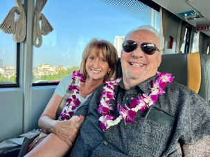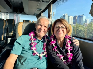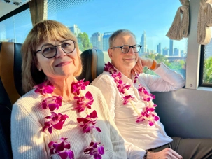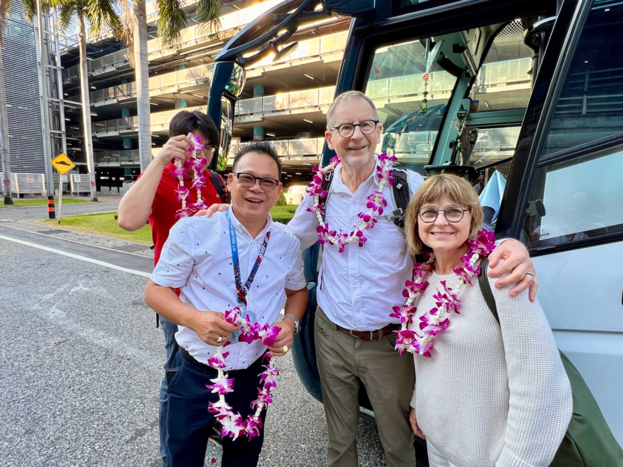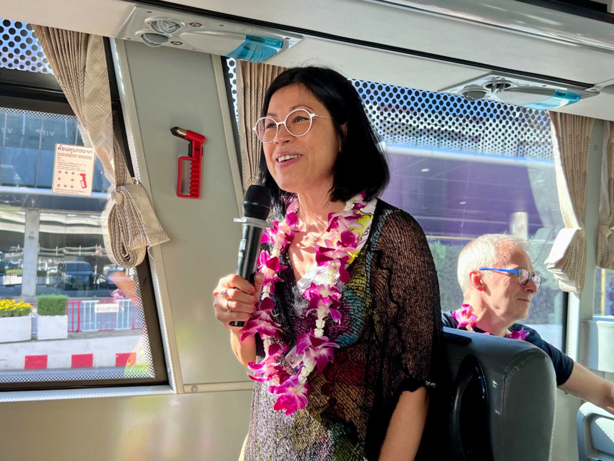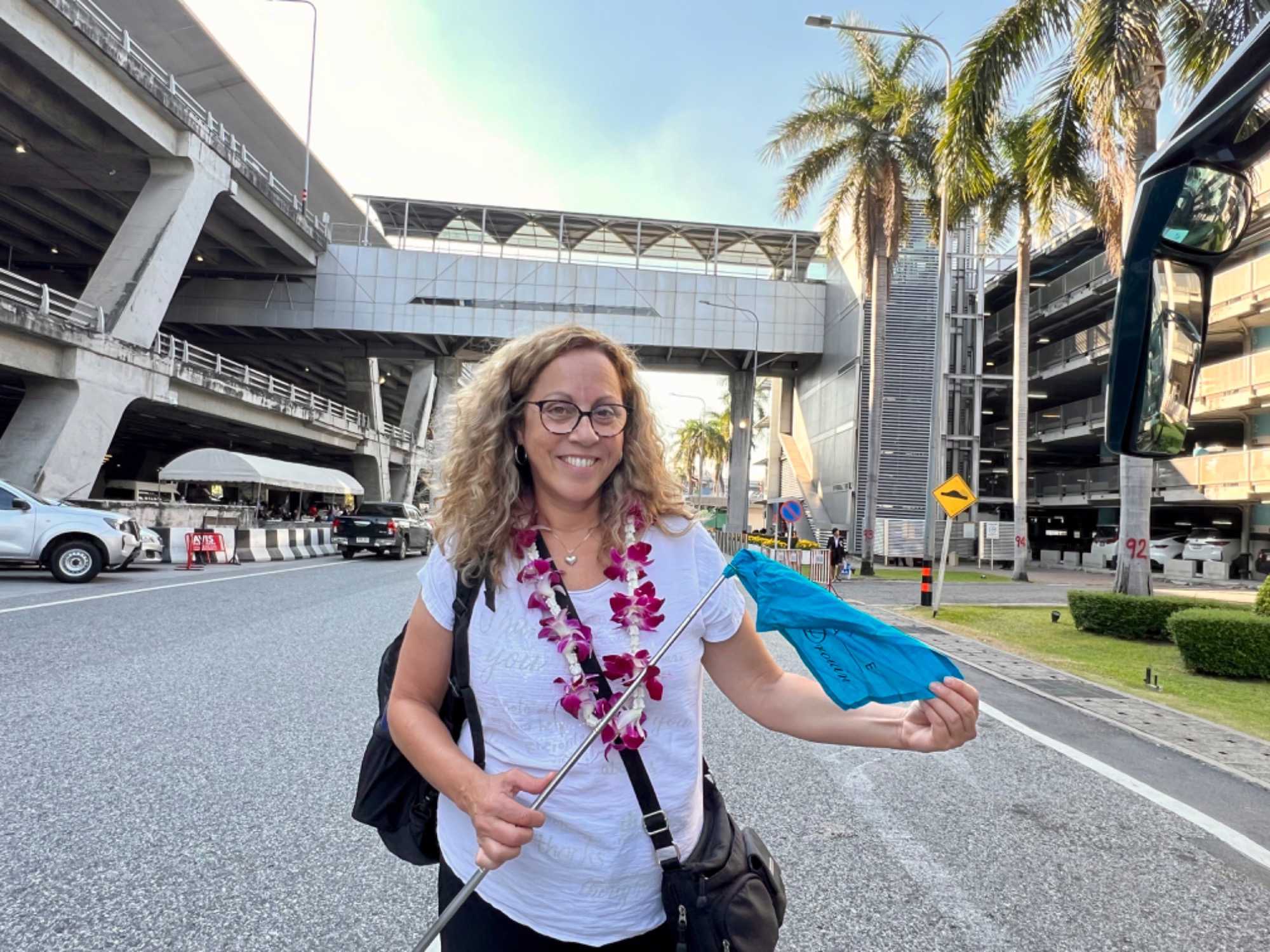 Le temps des formalités douanières et nous rencontrons Supot, notre guide accompagnateur et frère de Lek. De belles retrouvailles pour ces deux-là après un an de séparation. Supot est accompagné de son neveu Oto qui sera avec nous et aidera Supot et Lek pour notre séjour dans Bangkok. Ces deux charmants monsieurs auront pris soin de nous acheter des colliers de fleurs d'archidées qu'ils nous mettront au cou en signe de bienvenue dans leur pays. C'est tellememt beau à voir! Merci à vous deux.