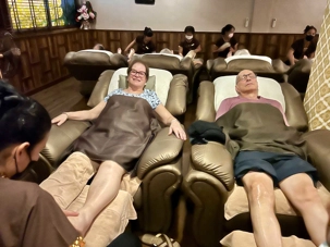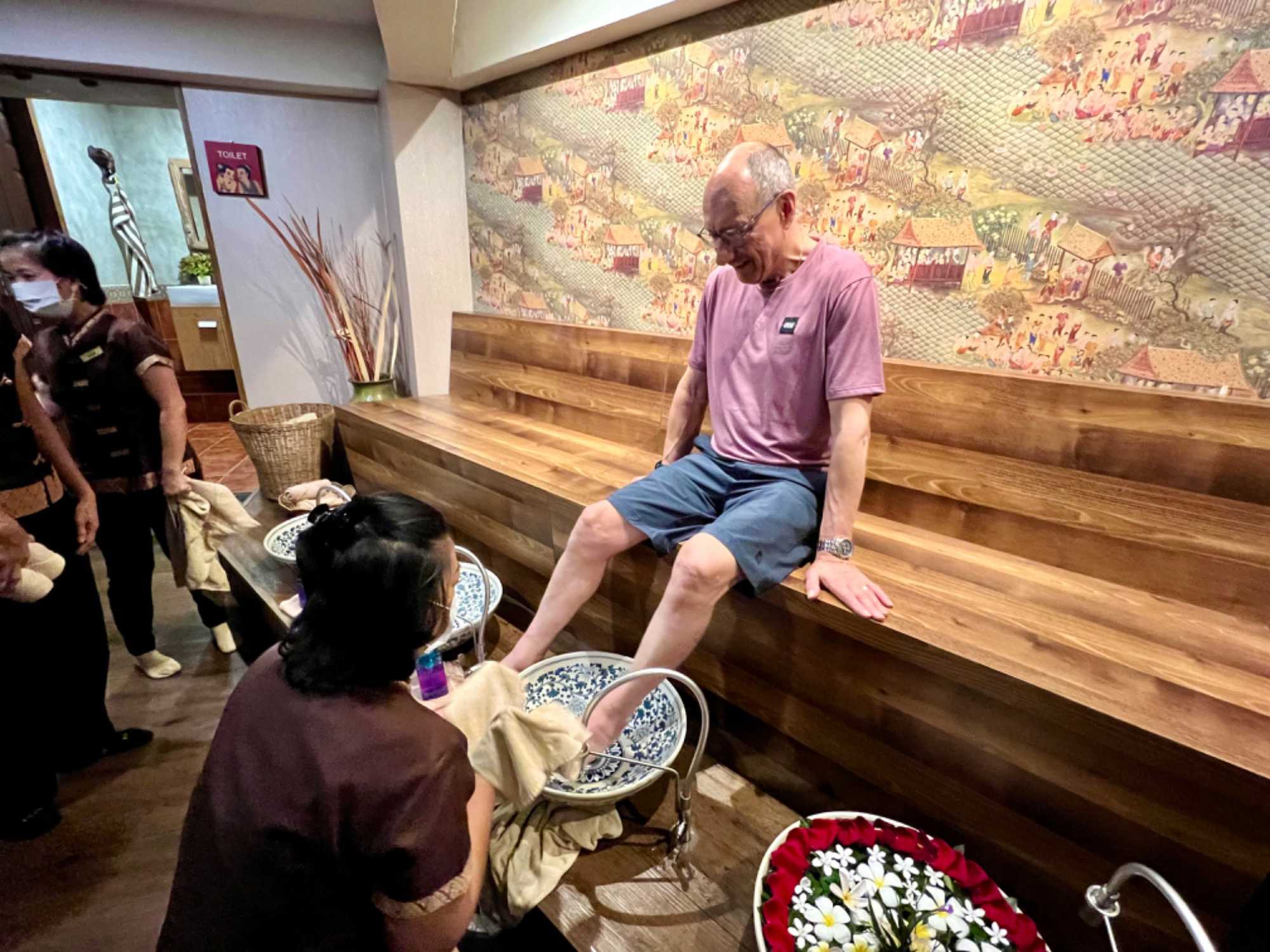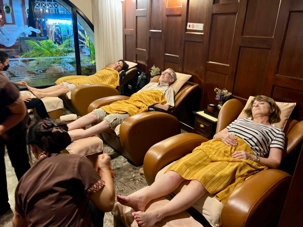 Une fois rafraîchi et un peu reposé, nous quitterons l'hôtel à pied en deux mini--groupes afin de nous rendre à un endroit paradisiaque tout près de notre hôtel. Imaginez-vous qu'un massage de pieds d'une heure avait été réservé pour chacun de nous. Après deux longs vols en avion, de pouvoir se reposer en recevant un soin approprié, surtout pour nos pieds légèrement enflés, est plus qu'appréciable. Tellement une belle attention. Les photos que nous avons prises vous le prouveront. Après cettes belle heure de détente, nous sommes revenus à notre hôtel pour le magnifique souper-buffet où une panoplie de variétés de plats, tous plus alléchants les uns que les autres nous attendaient. C’était tout à fait délicieux !