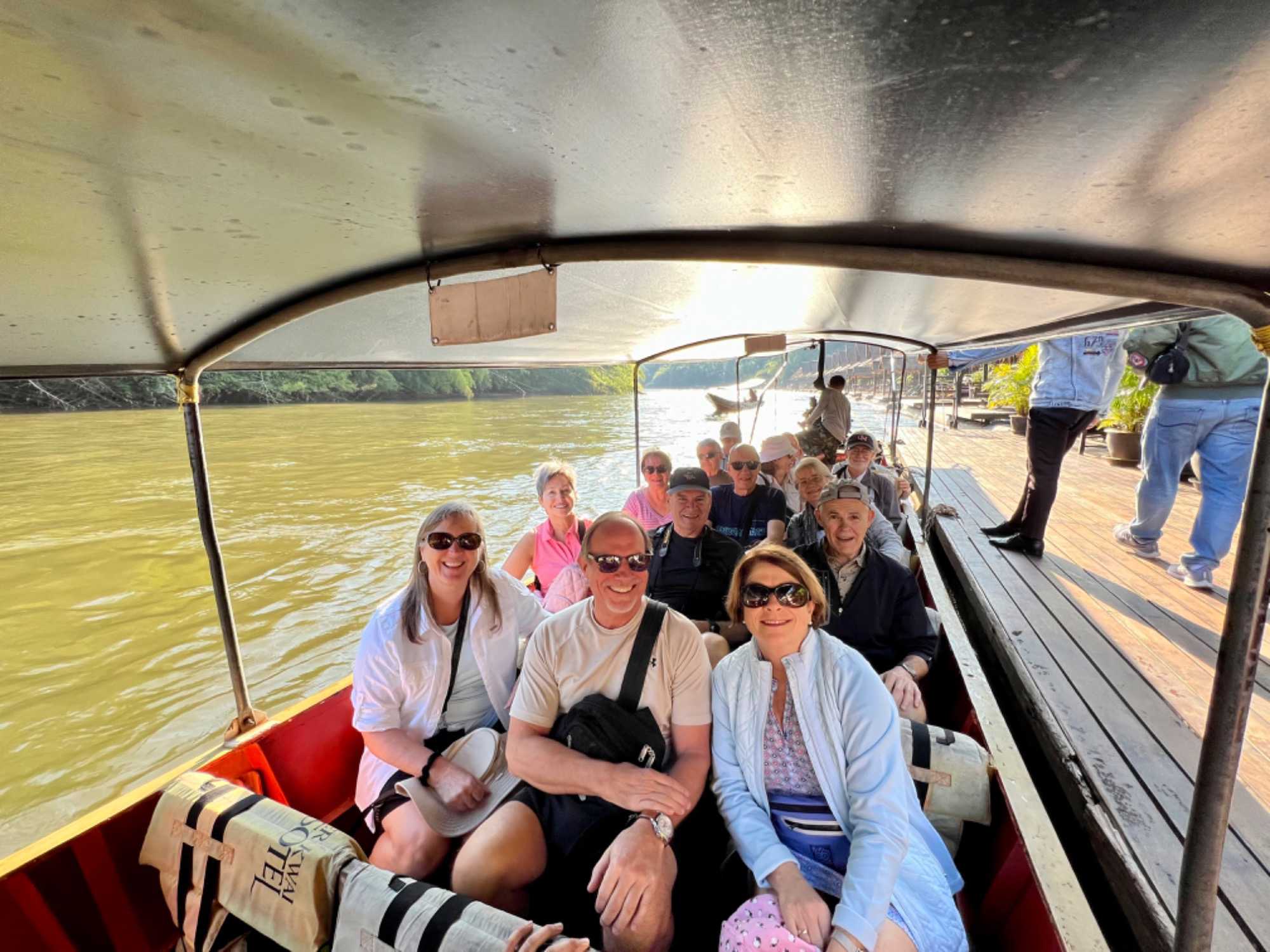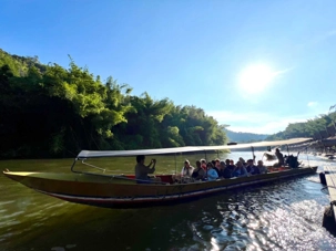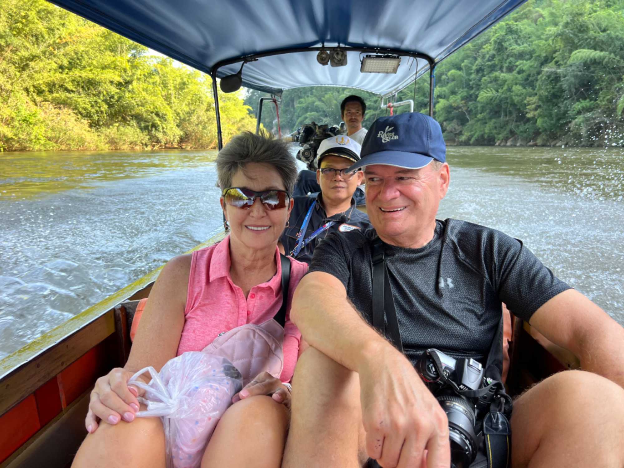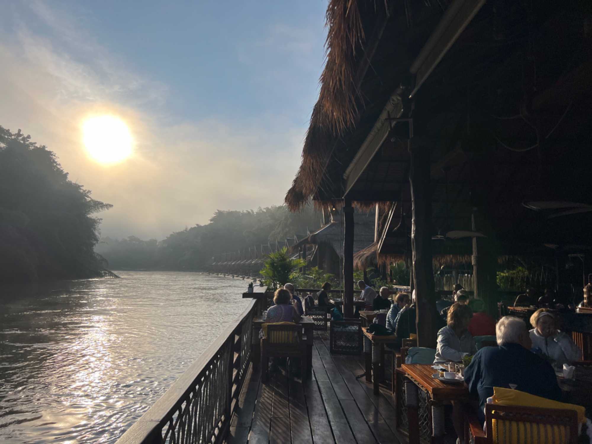 Je peux vous confirmer que ce fût une superbe nuit tranquille dans un calme surnaturel avec, comme bruit de fond, que la nature et le clapoti des vagues sur nos maisons. Une fois tous debout, un déjeuner nous est servi dans un cadre bien spécial. Nous sommes entourés de splendides paysages de la rivière Kwaï avec tout autour de hautes montagnes recouvertes d’une légère couche de brouillard qui s’agrippe aux rochers, surtout le matin. On oublie la grande ville de Bangkok très facilement et l’image de la Thaïlande que nous avons dans nos rêves prend forme. Après le petit-déjeuner, tous bien reposés, nous étions prêts à reprendre la pirogue pour rejoindre notre autobus stationné en aval de la rivière Kwaï. Nous prenons place un groupe de 10 à la fois dans la pirogue. Nous devenons de plus en plus agiles ! La montée et la descente de ces pirogues se fait de plus en plus facilement…enfin pour la majorité... On met très certainement l’élégance de côté pour laisser place à la sécurité!